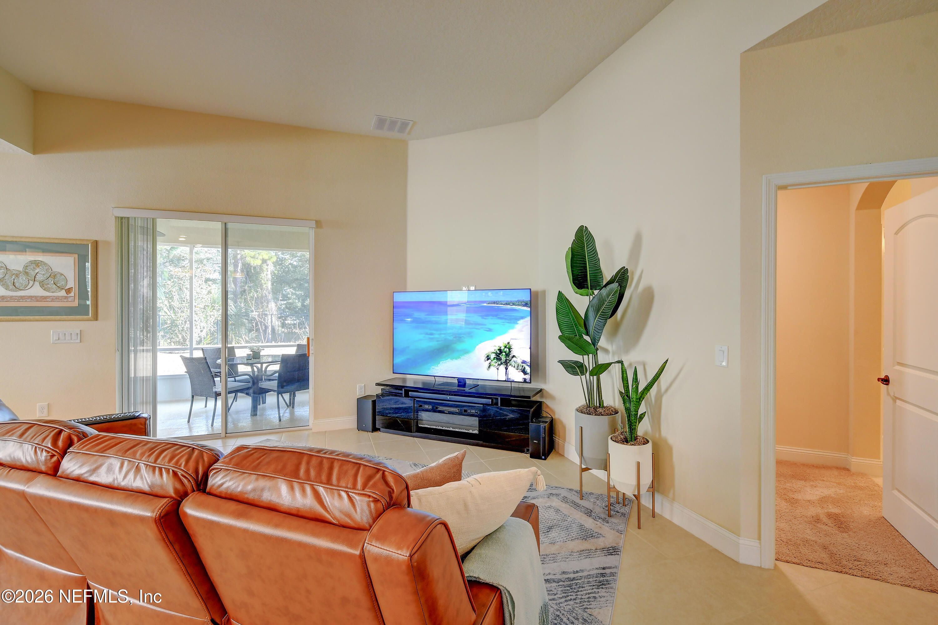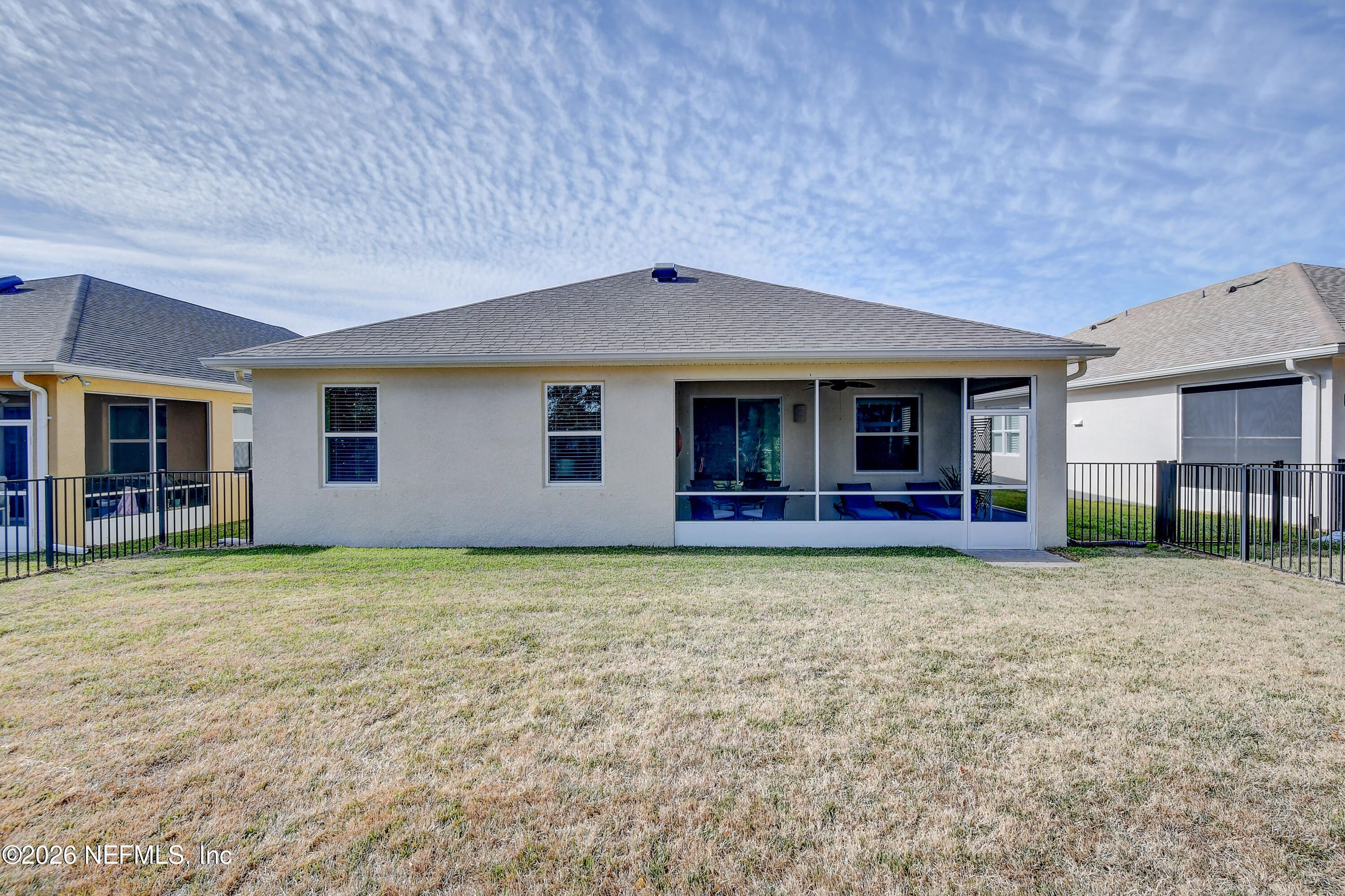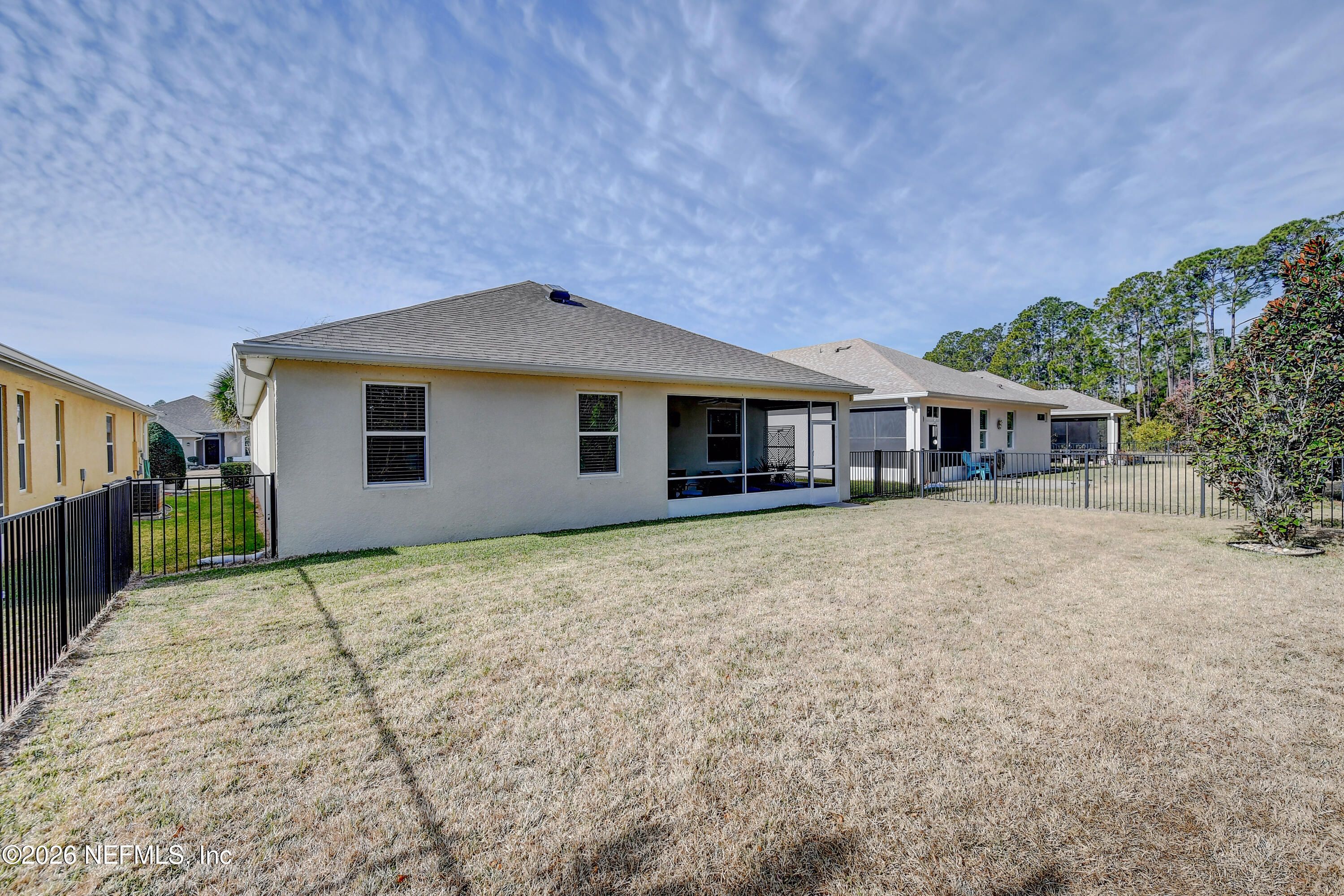 If you are searching for a maintenance-free 55+ concrete block home in Palm Coast, this is a must-see. Located in the gated community of Park Place at Palm Coast, this 2018 built, move-in ready 3-bedroom, 2-bath home (third bedroom non-conforming) offers 1,878 sq ft of open living space ideal for full-time residents or snowbirds. Curb appeal includes manicured landscaping, a paver driveway, and a two-car garage. Inside features vaulted ceilings, ceramic tile in main areas, carpeted bedrooms, and a bright open floor plan. The kitchen boasts granite countertops, stainless steel appliances, and a large island. The primary suite offers dual vanities, walk-in shower, and spacious closet. Enjoy the screened lanai with epoxy flooring overlooking a fenced yard. Upgrades include epoxy garage floors, custom cabinets, and hurricane panels. Assumable 5.1% VA loan available for qualified buyers.