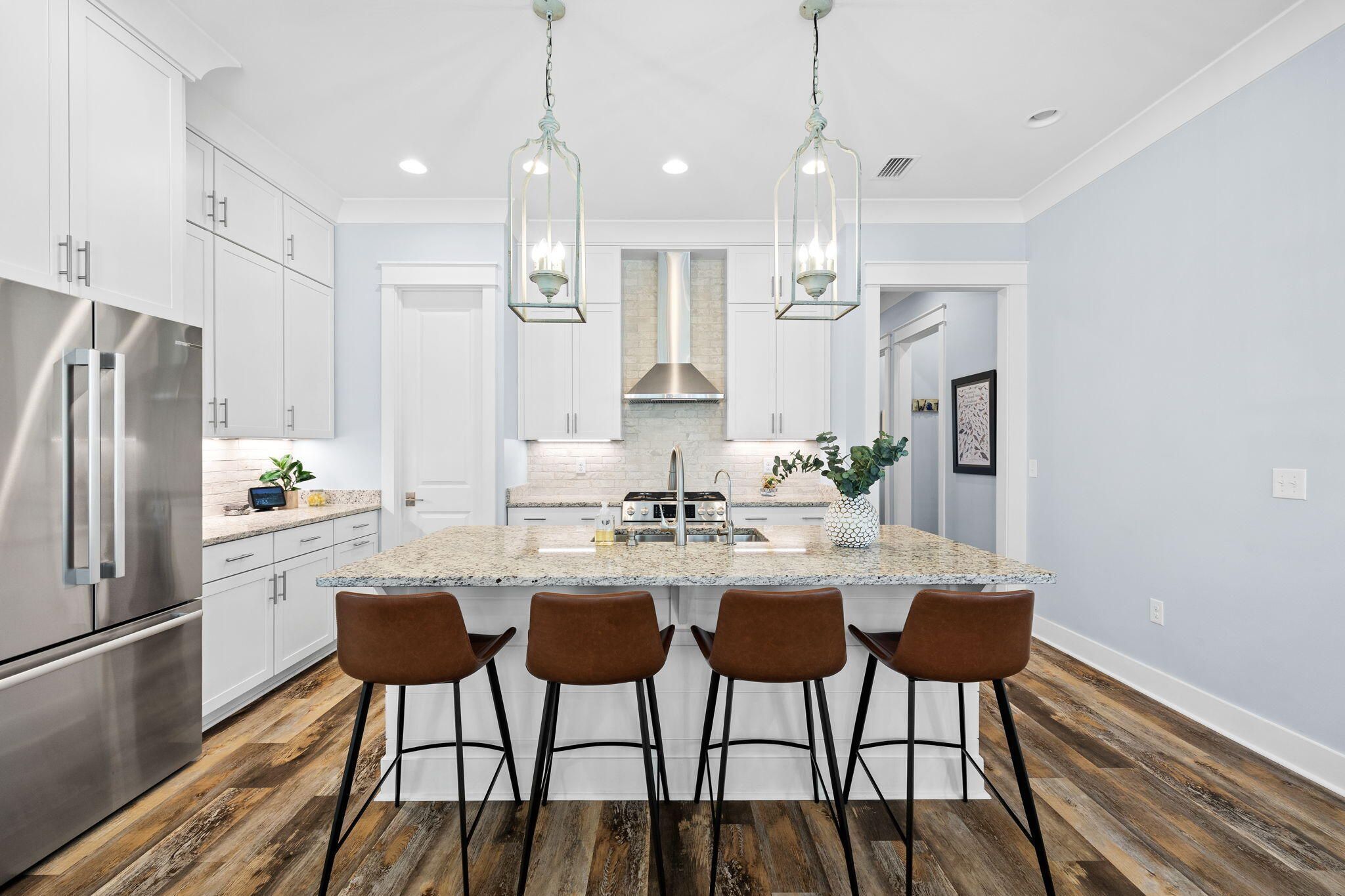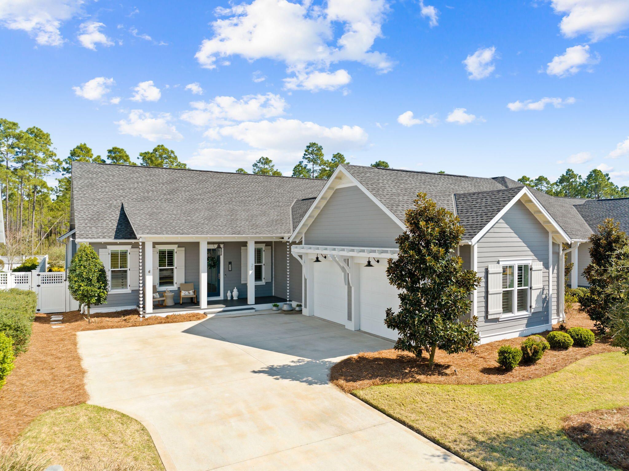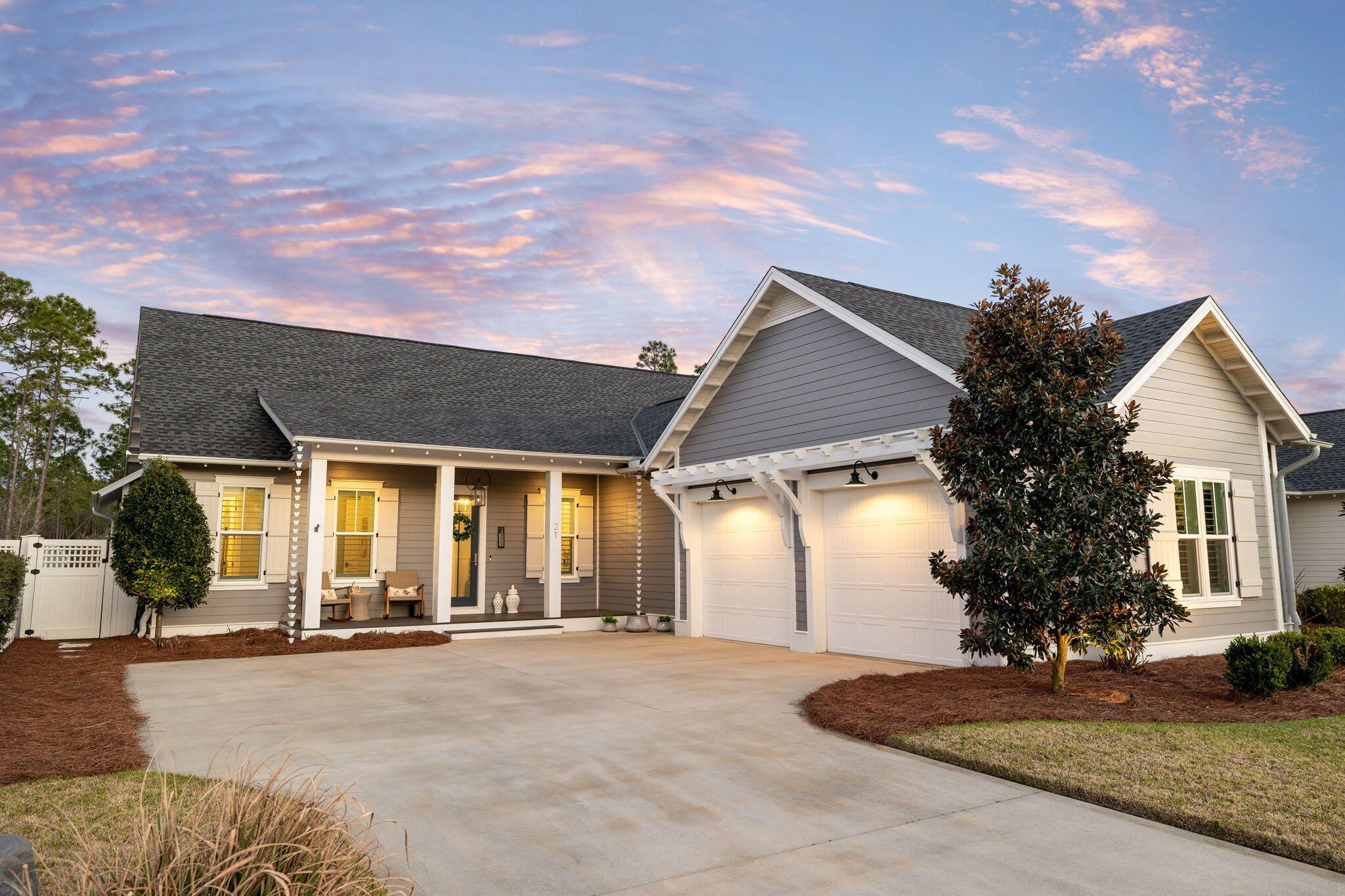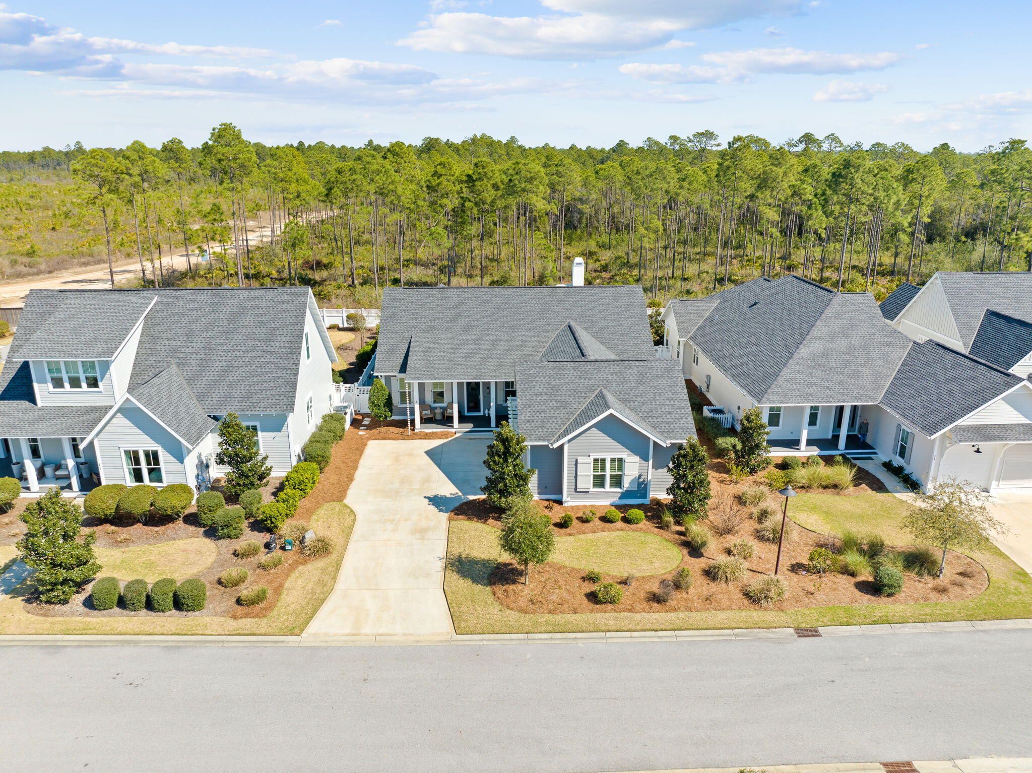 Tucked away on a quiet five-home street in the coveted Stillwater phase of Watersound Origins, this 2020 Huff Home offers a rare combination of privacy, function, and resort-style living. Positioned on a spacious lot with a wooded preserve behind and a community park in front, this highly upgraded Gardenia plan provides 2,770 square feet of thoughtfully designed space with four oversized bedrooms, a dedicated office, and three and a half bathrooms.Inside, 10-foot ceilings, eight-foot doors, crown molding, and shiplap accents create a refined coastal feel. The gourmet kitchen features floor-to-ceiling cabinetry, granite countertops, and Bosch appliances including a vent hood and drawer microwave. Each bedroom is generously sized to fit a king bed, while custom closets and spa-inspired