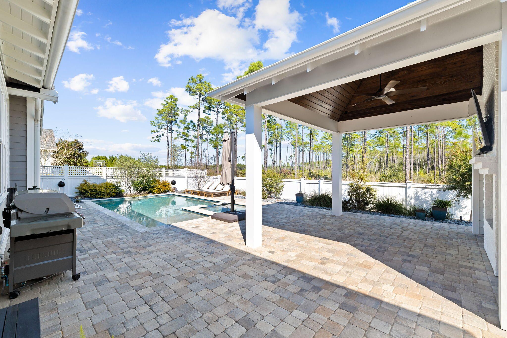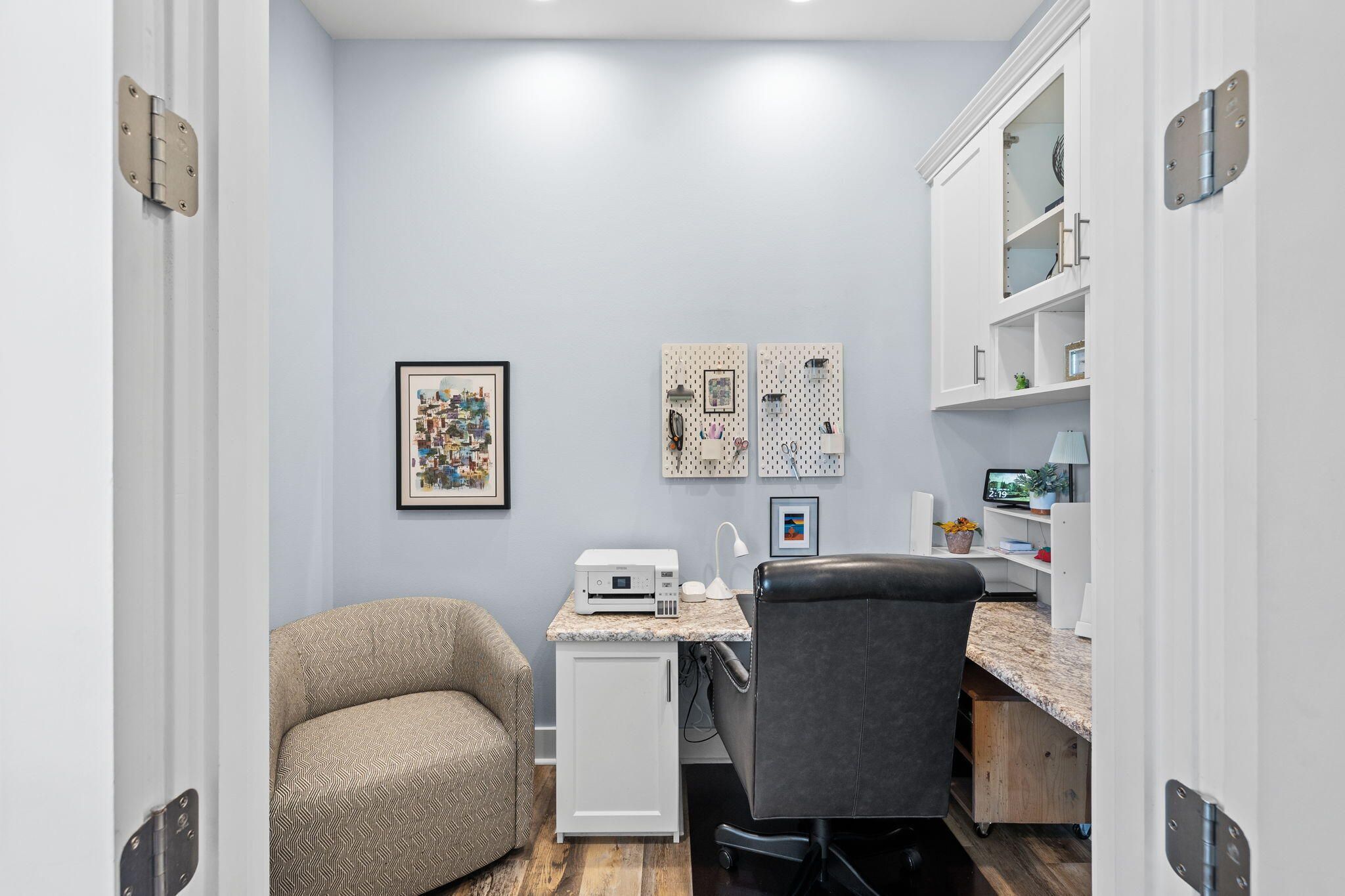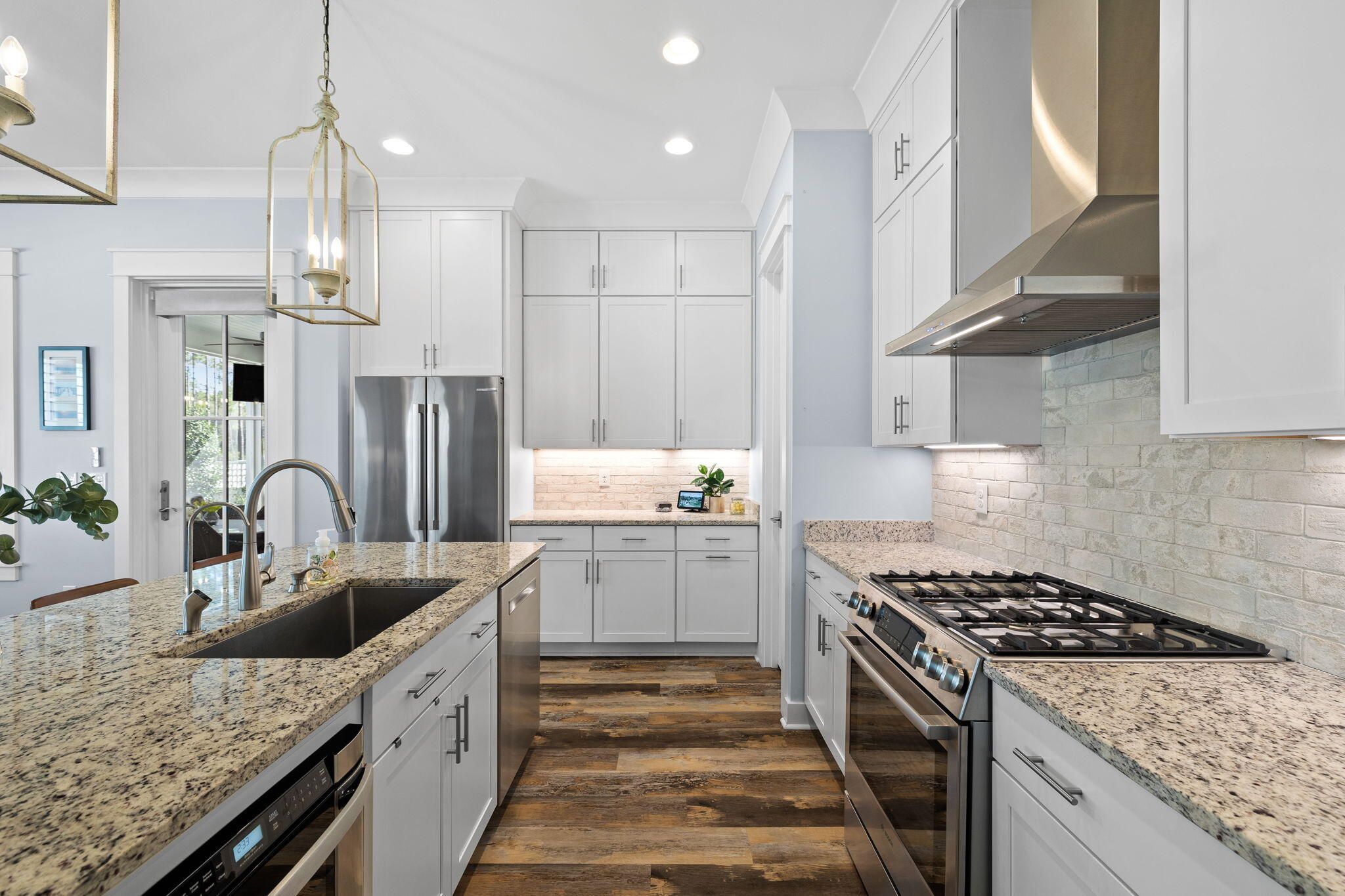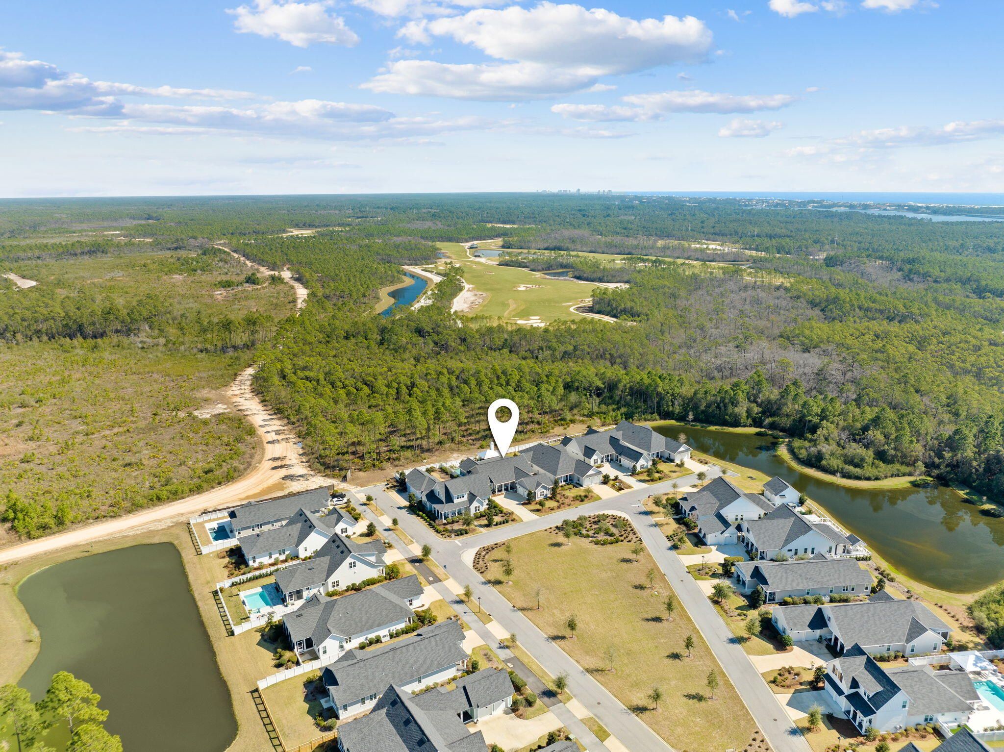 Tucked away on a quiet five-home street in the coveted Stillwater phase of Watersound Origins, this 2020 Huff Home offers a rare combination of privacy, function, and resort-style living. Positioned on a spacious lot with a wooded preserve behind and a community park in front, this highly upgraded Gardenia plan provides 2,770 square feet of thoughtfully designed space with four oversized bedrooms, a dedicated office, and three and a half bathrooms.Inside, 10-foot ceilings, eight-foot doors, crown molding, and shiplap accents create a refined coastal feel. The gourmet kitchen features floor-to-ceiling cabinetry, granite countertops, and Bosch appliances including a vent hood and drawer microwave. Each bedroom is generously sized to fit a king bed, while custom closets and spa-inspired