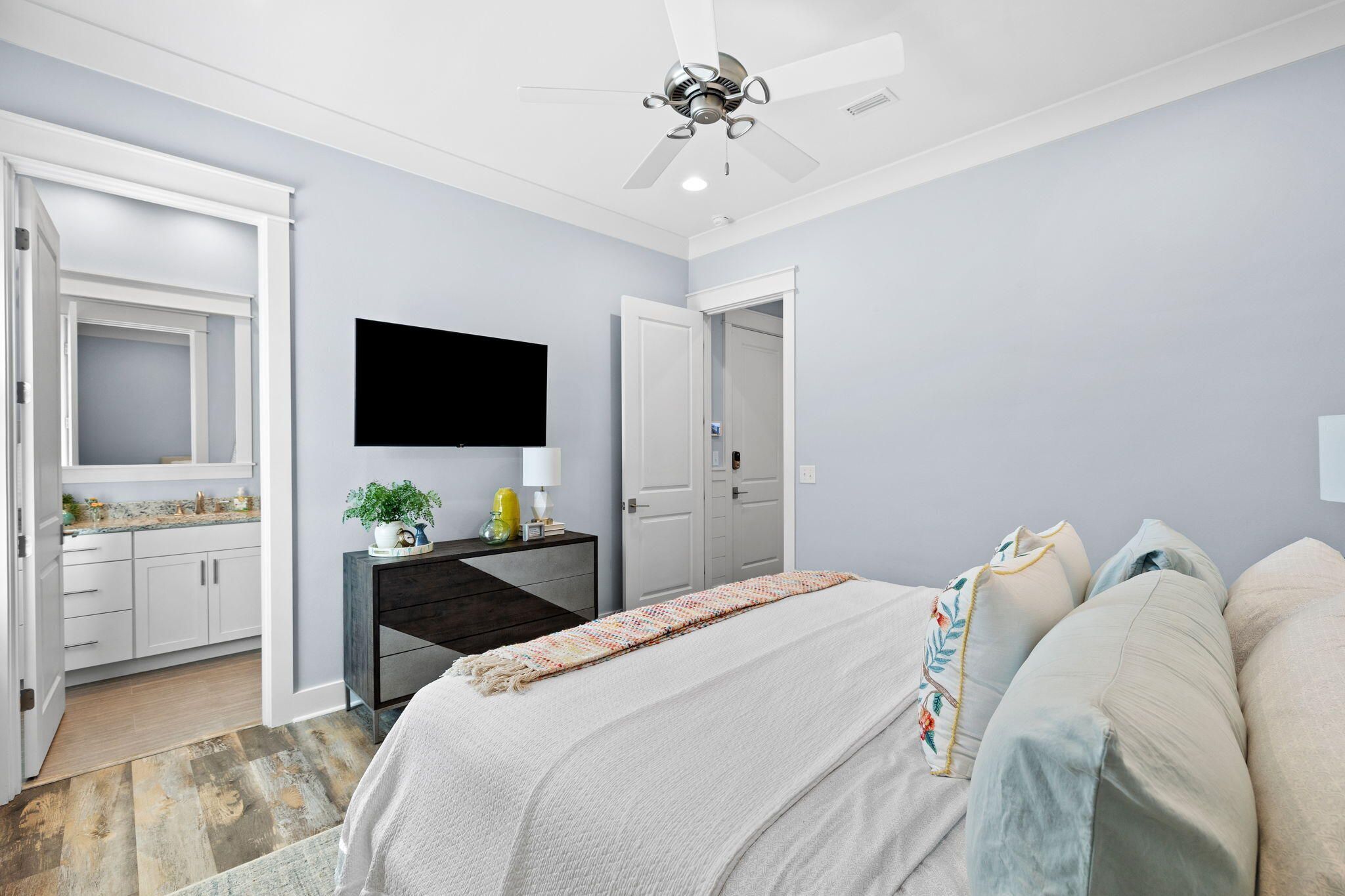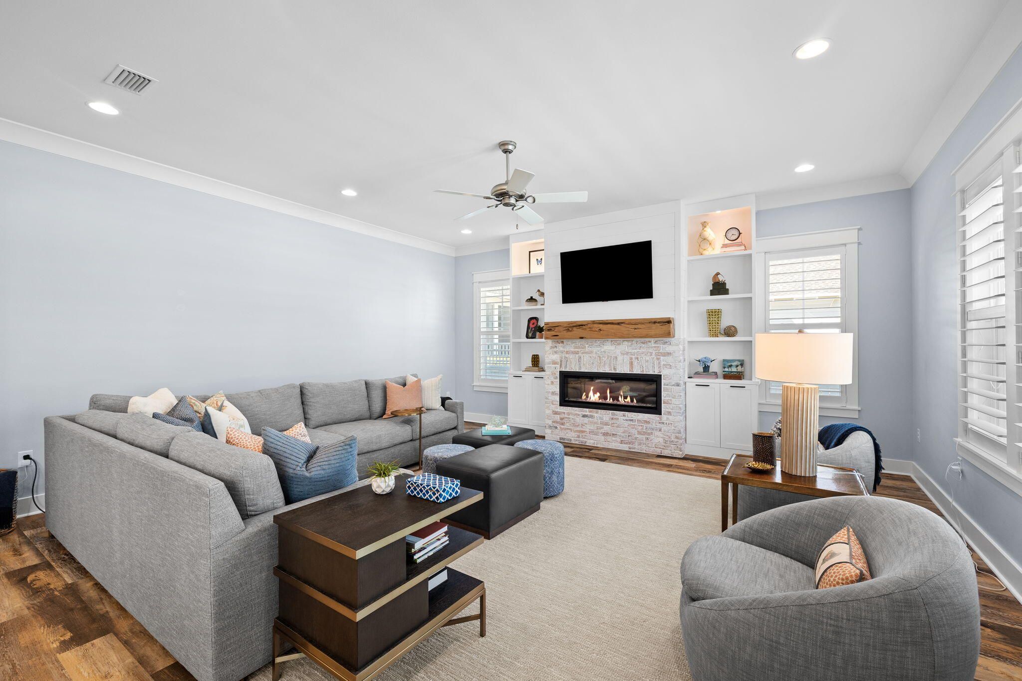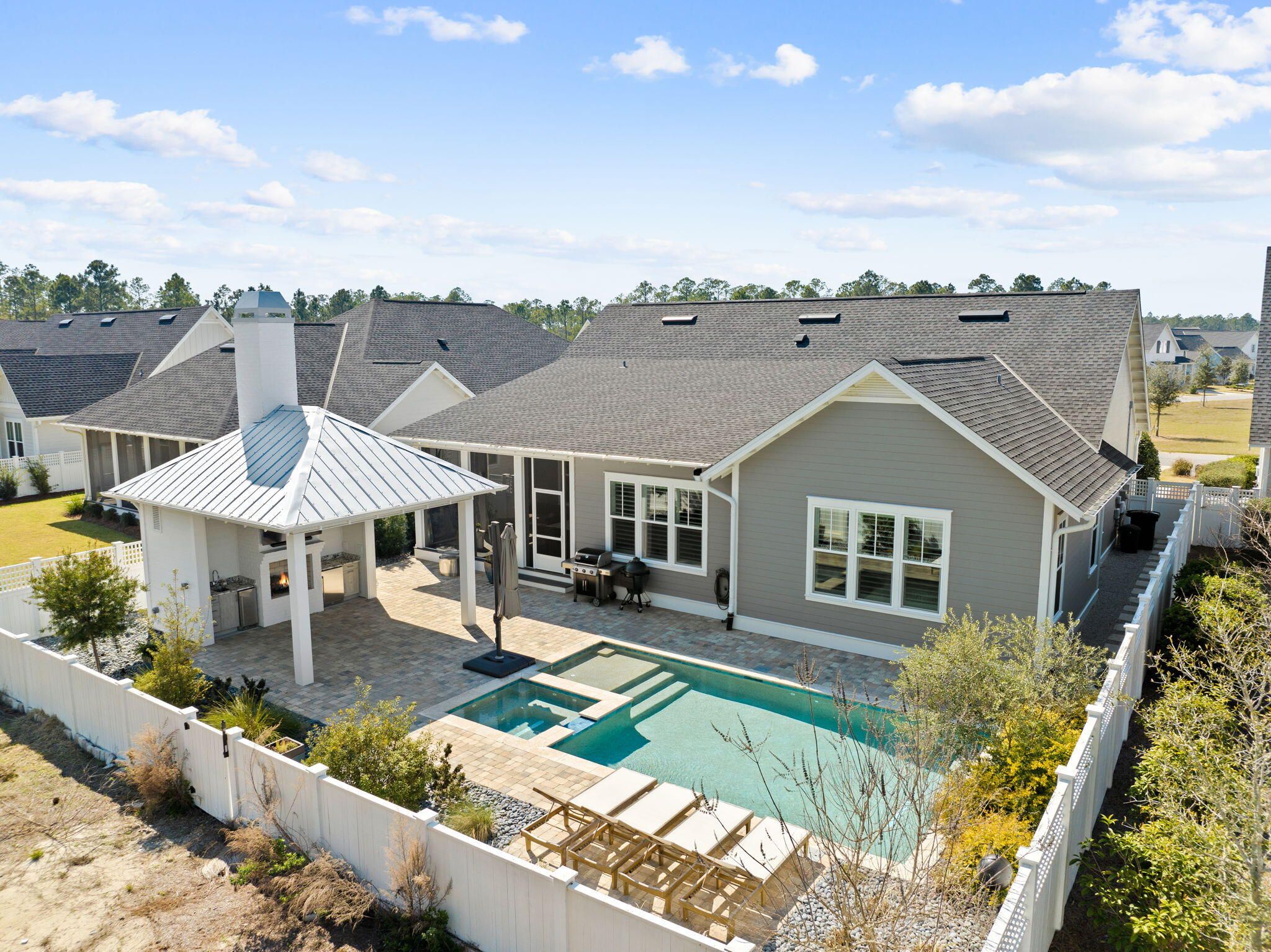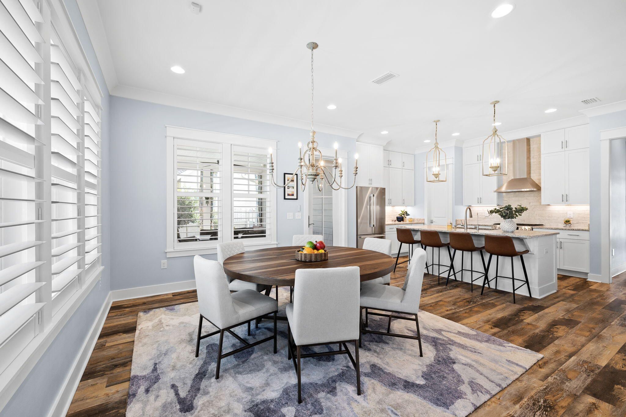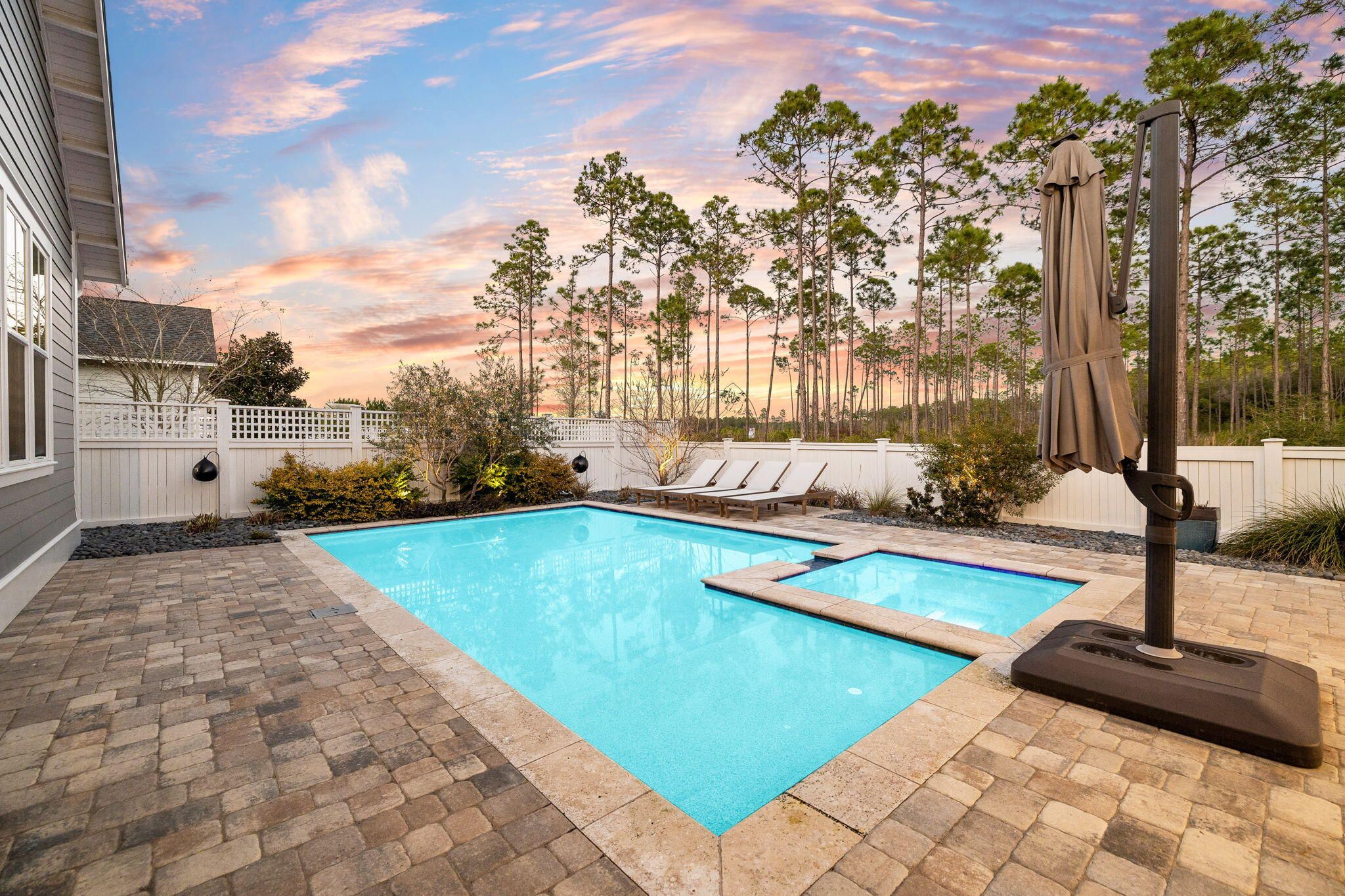 Tucked away on a quiet five-home street in the coveted Stillwater phase of Watersound Origins, this 2020 Huff Home offers a rare combination of privacy, function, and resort-style living. Positioned on a spacious lot with a wooded preserve behind and a community park in front, this highly upgraded Gardenia plan provides 2,770 square feet of thoughtfully designed space with four oversized bedrooms, a dedicated office, and three and a half bathrooms.Inside, 10-foot ceilings, eight-foot doors, crown molding, and shiplap accents create a refined coastal feel. The gourmet kitchen features floor-to-ceiling cabinetry, granite countertops, and Bosch appliances including a vent hood and drawer microwave. Each bedroom is generously sized to fit a king bed, while custom closets and spa-inspired