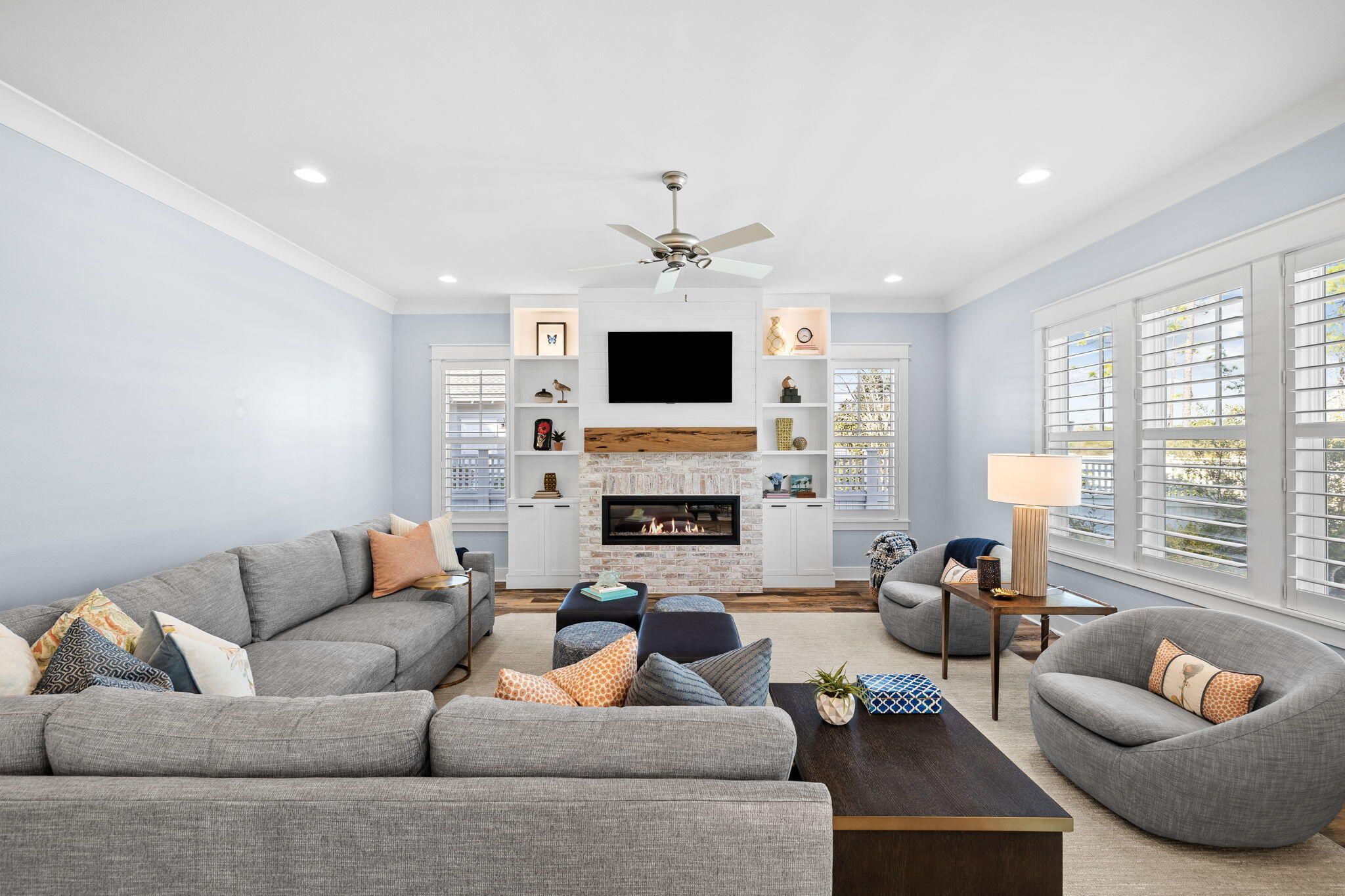 - Built-in Bookcase, Crown Molding, High Ceilings, Fireplace, Unfurnished, Kitchen Island, Plantation Shutters, Washer/Dryer Hookup, Window Treatments