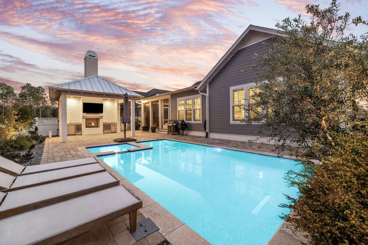 Tucked away on a quiet five-home street in the coveted Stillwater phase of Watersound Origins, this 2020 Huff Home offers a rare combination of privacy, function, and resort-style living. Positioned on a spacious lot with a wooded preserve behind and a community park in front, this highly upgraded Gardenia plan provides 2,770 square feet of thoughtfully designed space with four oversized bedrooms, a dedicated office, and three and a half bathrooms. Inside, 10-foot ceilings, eight-foot doors, crown molding, and shiplap accents create a refined coastal feel. The gourmet kitchen features floor-to-ceiling cabinetry, granite countertops, and Bosch appliances including a vent hood and drawer microwave. Each bedroom is generously sized to fit a king bed, while custom closets and spa-inspired baths elevate everyday living. The primary suite offers a peaceful retreat with an expansive en-suite bath. The backyard is a private oasis with a heated Gunite/Pebble Tec pool and spa framed by an expansive paver patio, lush landscaping, and a privacy fence. A newly built cabana includes a gas fireplace, ice maker, full bathroom, and additional storage. Outdoor lighting, a screened porch, and an iPhone-controlled pool system make the space ideal for both entertaining and relaxation. Additional upgrades include a whole-house generator, Culligan water filtration, and a security system. Watersound Origins residents enjoy a state-of-the-art fitness center, seasonally heated community pool, executive golf course, tennis and pickleball, scenic trails, and Lake Powell access with kayaks and canoes. Optional membership in the St. Joe Beach Club provides private beach access, multiple pools, Gulf-front dining, and championship golf. Located minutes from the new Publix Town Center and the restaurants and boutiques of 30A, this property offers a one-of-a-kind opportunity to enjoy the best of coastal living in a prime location.
