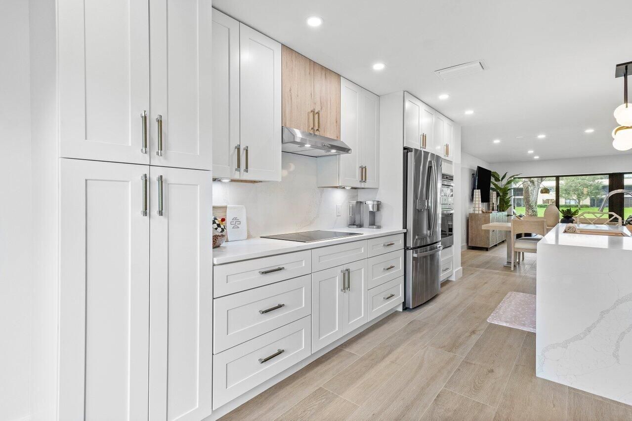 Initiation Fee increases 5/2/2026! This contemporary townhouse, updated in 2022, effortlessly blends luxury with modern flair to captivate the most discerning buyers. Spanning 1,902 square feet, it offers breathtaking lake views and a thoughtfully designed open-concept layout. As you step inside, sleek wood-look tile and a designer accent wall create an inviting and stylish ambiance. The gourmet kitchen seamlessly integrates with the living area, featuring a chic powder room. Ascend to the second floor to discover a guest bedroom with ensuite bath, and the primary suite, complete with walk-in closet and luxurious spa-style bathroom. The private front patio is ideal for outdoor dining and barbecues, and the exterior features complete hurricane-impact glass protection. Experience world-class Country Club living at Hunters Run. Featuring 54 holes of championship golf (with a brand new East Course designed by Kip Schulties), 18 har-tru tennis courts, 12 pickleball courts, resort-style clubhouse and pool, salon & spa, state of the art fitness center, six dining venues and so much more.