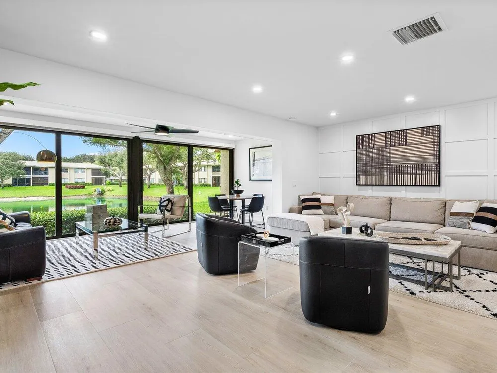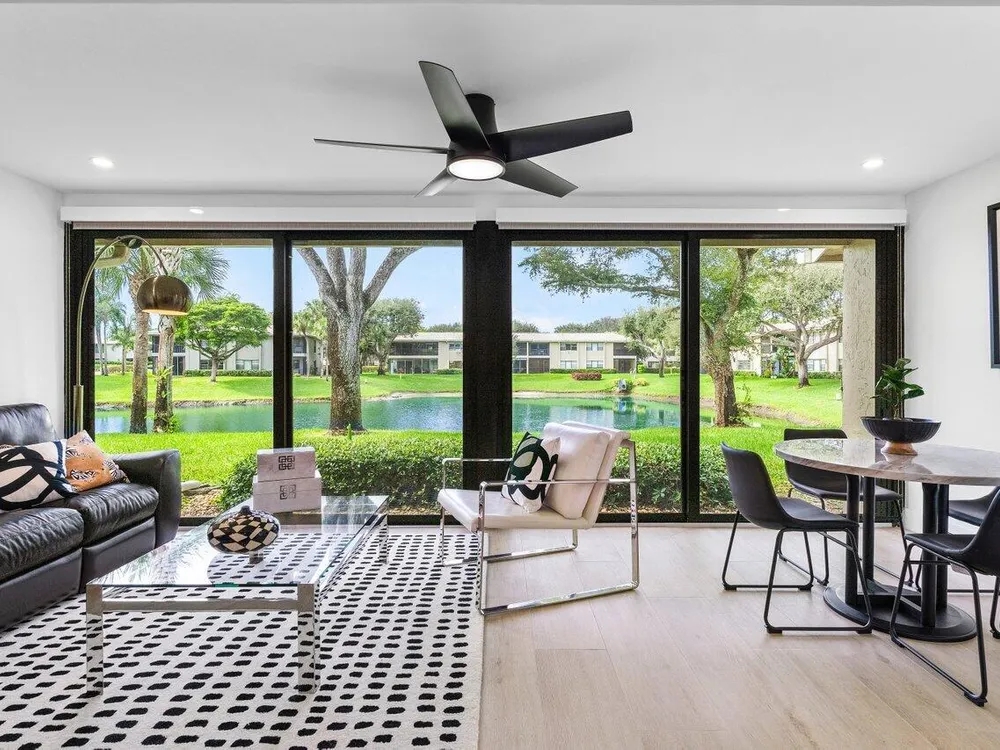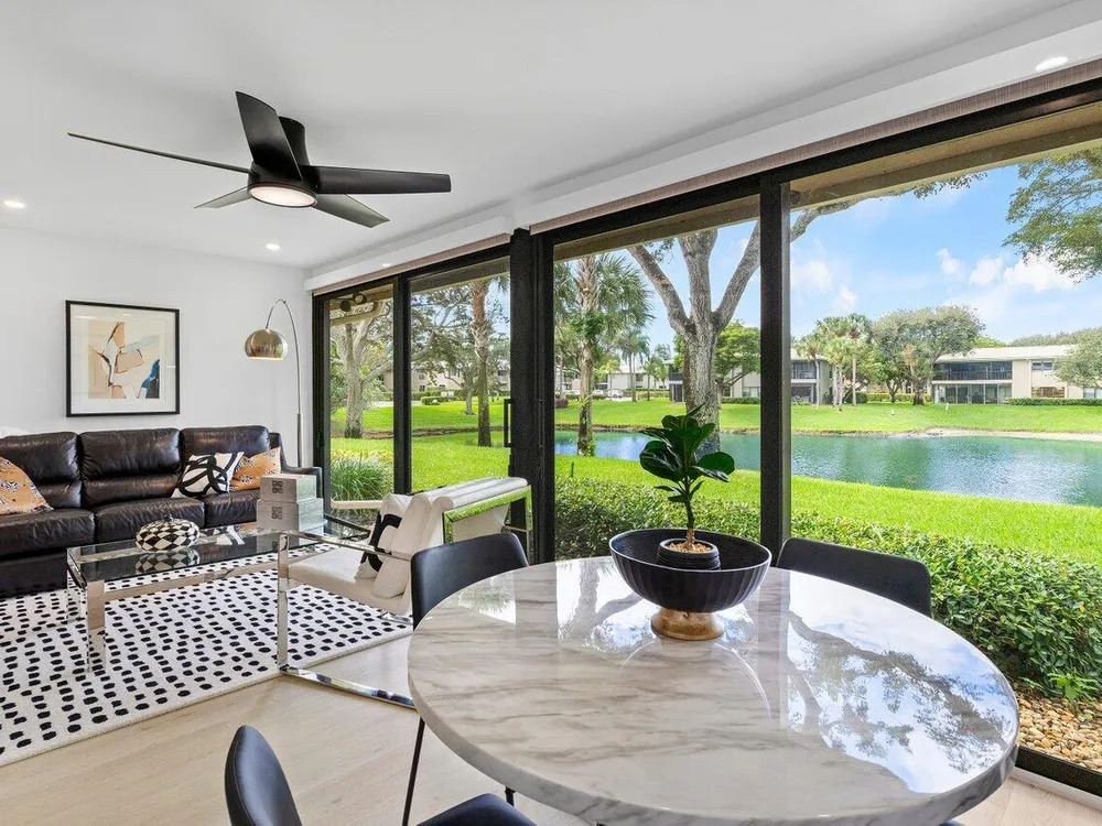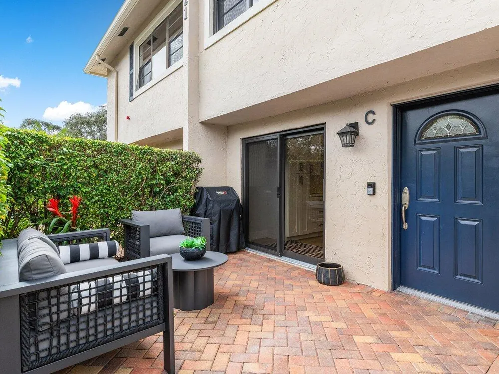 This contemporary townhouse, updated in 2022, effortlessly blends luxury with modern flair to captivate the most discerning buyers. Spanning 1,902 square feet, it offers breathtaking lake views and a thoughtfully designed open-concept layout. As you step inside, sleek wood-look tile and a designer accent wall create an inviting and stylish ambiance. The gourmet kitchen seamlessly integrates with the living area, featuring a chic powder room. Ascend to the second floor to discover a guest bedroom with ensuite bath, and the primary suite, complete with walk-in closet and luxurious spa-style bathroom. The private front patio is ideal for outdoor dining and barbecues, and the exterior features complete hurricane-impact glass protection.