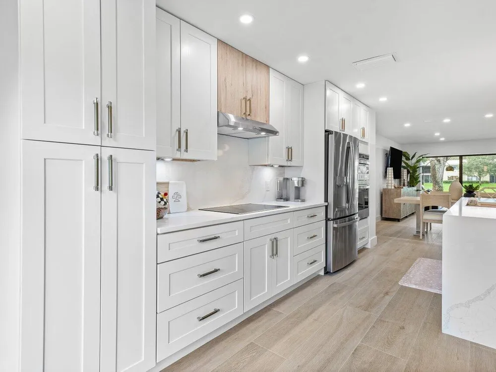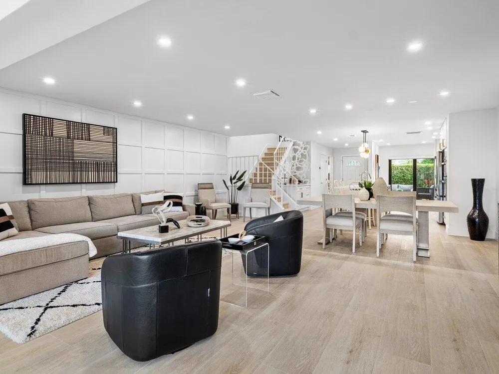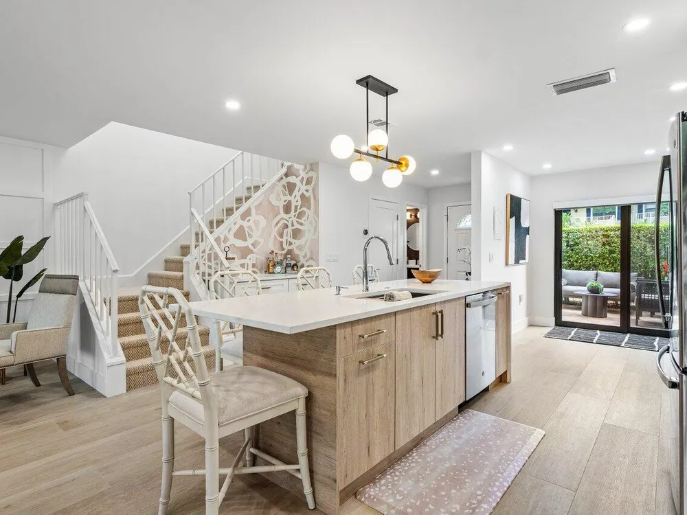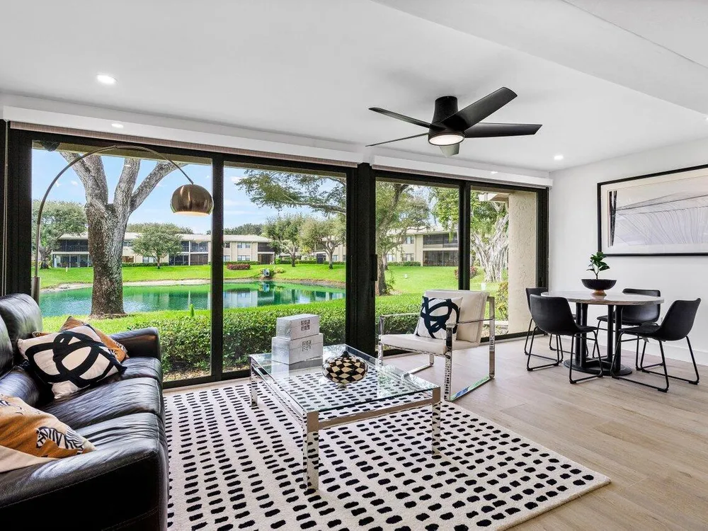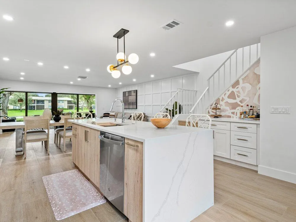 This contemporary townhouse, updated in 2022, effortlessly blends luxury with modern flair to captivate the most discerning buyers. Spanning 1,902 square feet, it offers breathtaking lake views and a thoughtfully designed open-concept layout. As you step inside, sleek wood-look tile and a designer accent wall create an inviting and stylish ambiance. The gourmet kitchen seamlessly integrates with the living area, featuring a chic powder room. Ascend to the second floor to discover a guest bedroom with ensuite bath, and the primary suite, complete with walk-in closet and luxurious spa-style bathroom. The private front patio is ideal for outdoor dining and barbecues, and the exterior features complete hurricane-impact glass protection.