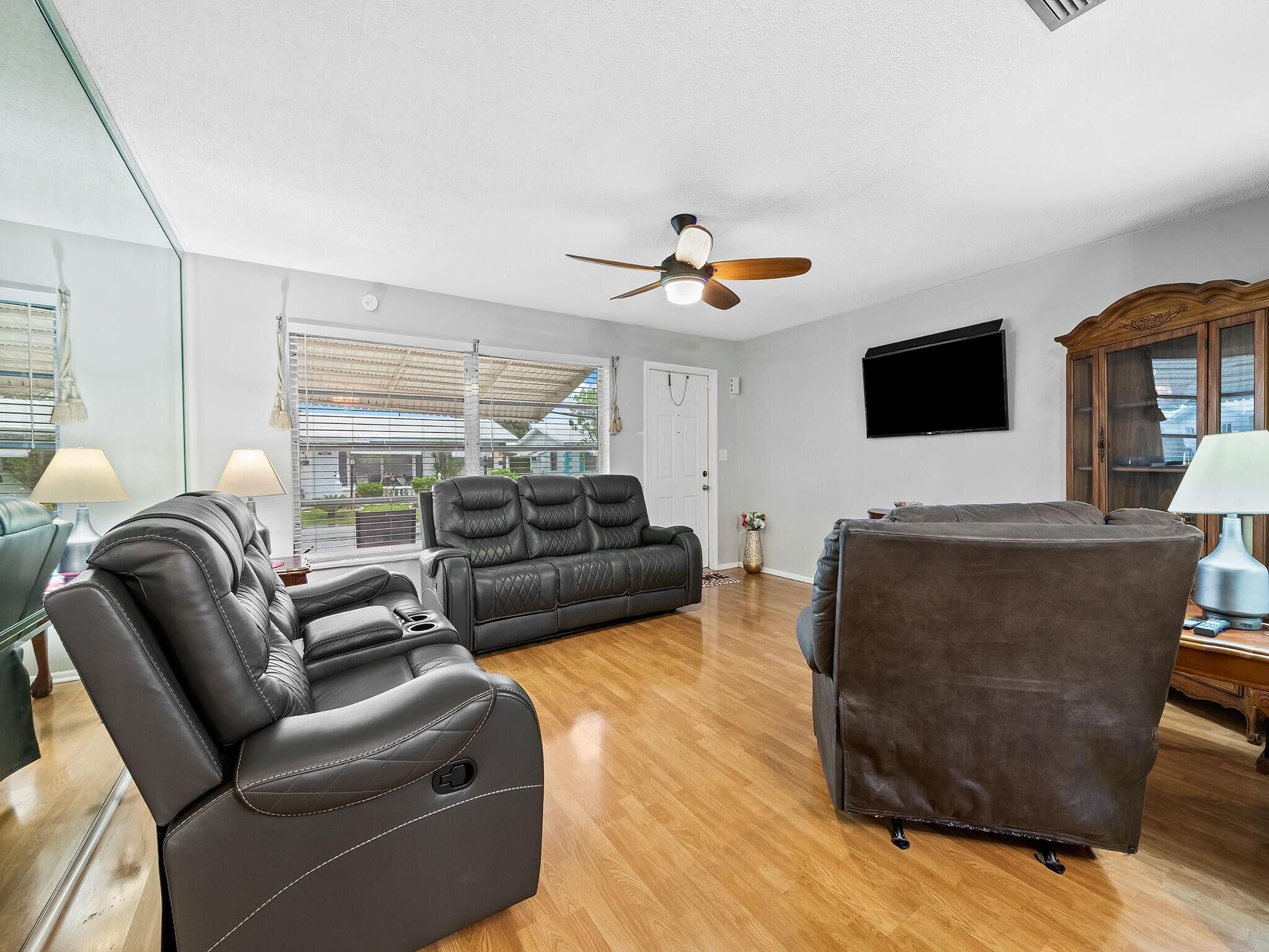 Welcome to this beautifully maintained 2-bedroom, 1.5-bath home located in the highly desirable Leisureville 55+ community in Pompano Beach. This move-in-ready residence features updated laminate flooring, a modern electrical panel, and a brand-new roof installed in 2024. Enjoy a light and bright living area, spacious bedrooms, and a well-appointed kitchen with plenty of cabinet space. The home offers a 1-car garage and an extended driveway with room for two additional vehicles. Low-maintenance living with an HOA fee that includes lawn care, house painting, roof coating, and access to exceptional community amenities. Leisureville offers two pools, a clubhouse, fitness center, shuffleboard courts, and a 9-hole golf course - all included in the HOA. Located just minutes from beaches.
