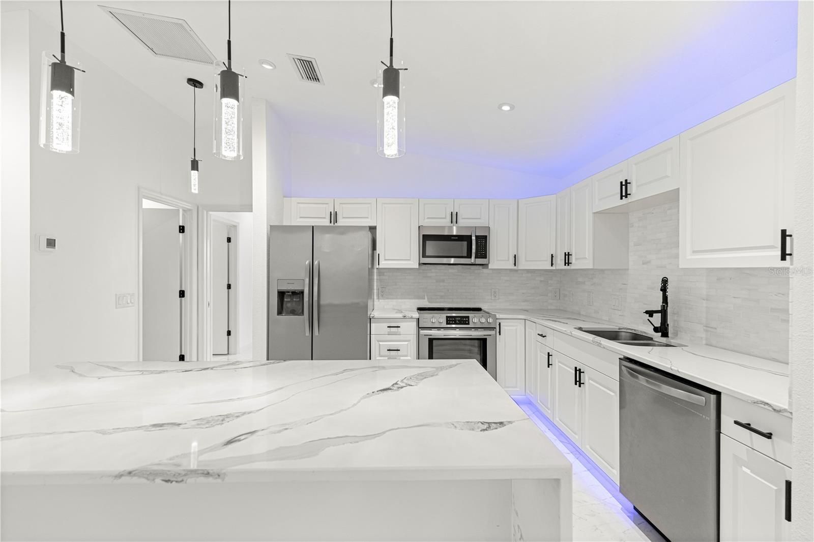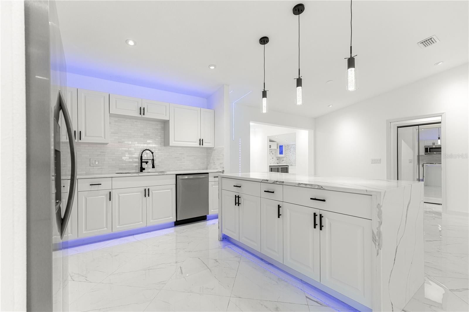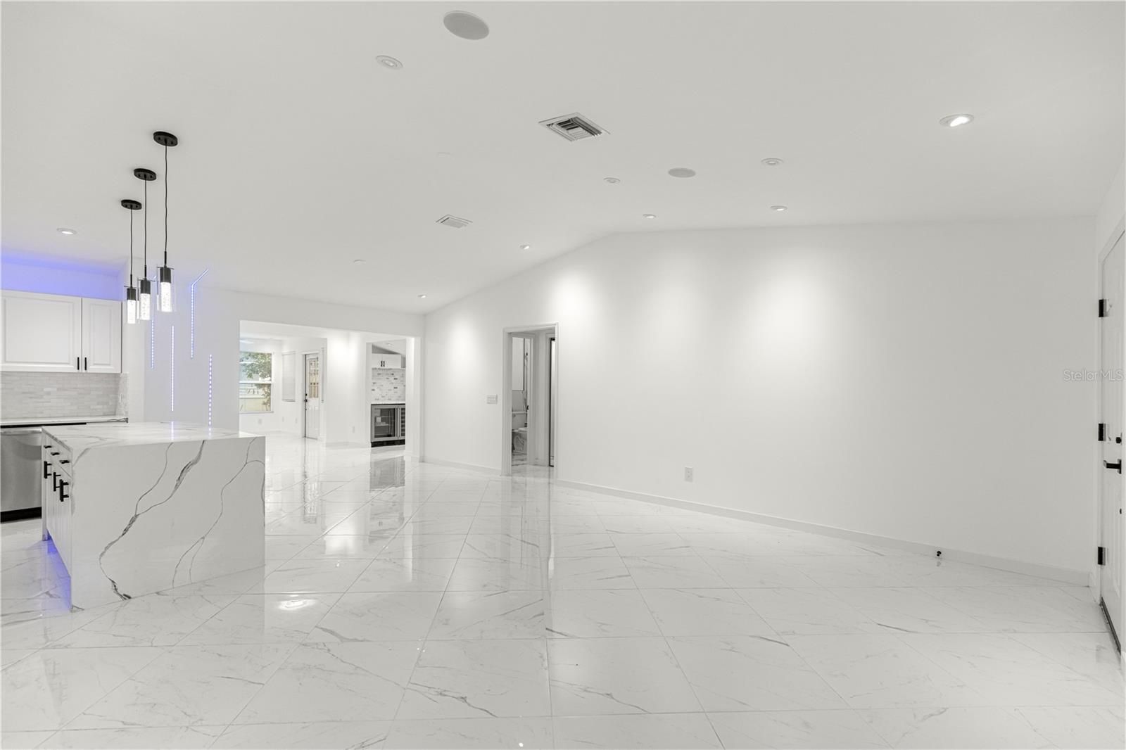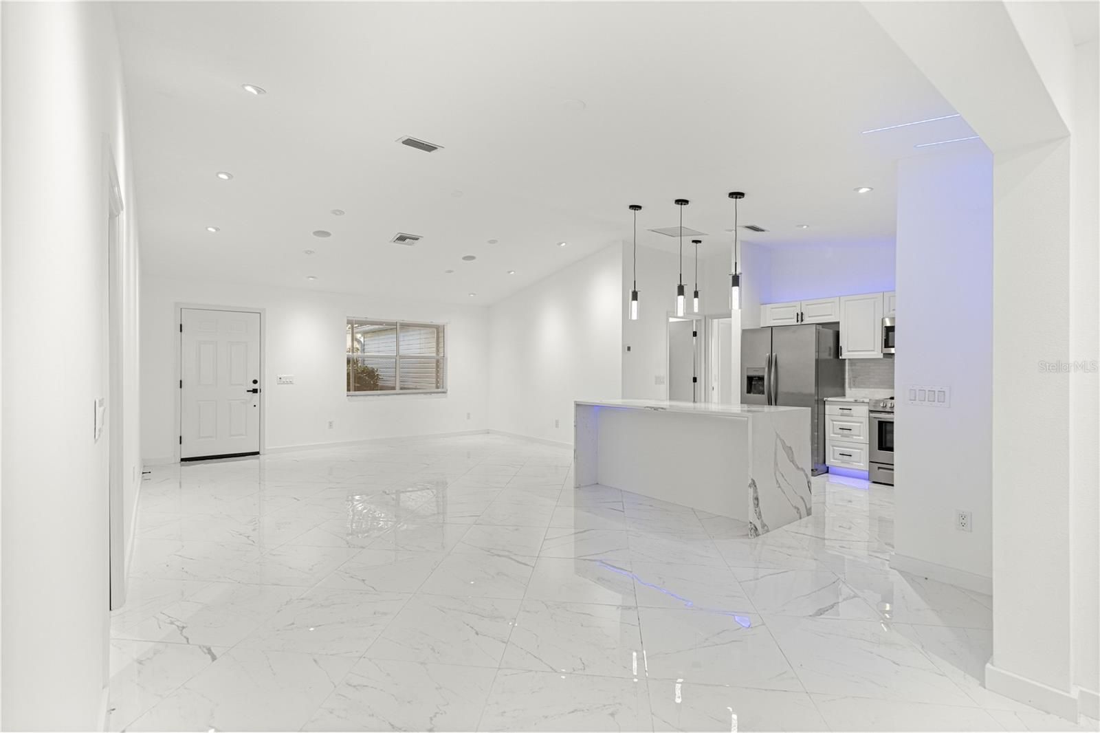 Perfectly positioned in the heart of The Villages. In the village of La Zamora, this beautifully updated three-bedroom, three-bathroom home offers the ideal blend of modern luxury and unbeatable convenience. Located just 3.5 miles from Lake Sumter Landing, 1.5 miles from Spanish Springs Town Square, and 9.5 miles from Brownwood Paddock Square, you’ll enjoy effortless access to nightly live entertainment, dancing, shopping, and an array of dining options that make this community so desirable. Inside, the thoughtfully designed open floor plan creates a seamless flow for both everyday living and entertaining. Polished porcelain floors, custom LED lighting, and a whole-house sound system set the tone for a sophisticated yet welcoming atmosphere. The recently renovated kitchen serves as the heart of the home, showcasing sleek granite countertops, a dramatic waterfall island, and new stainless steel appliances—perfect for morning coffee or hosting gatherings with friends and family. The spacious primary suite is a private retreat, complete with a spa-inspired en suite bath featuring dual custom rainforest showerheads, handheld sprayers, and a six-jet body shower panel for a true luxury experience. A well-appointed laundry area includes a stacked washer and dryer, oversized sink, and even a convenient pet washing station. Entertain with ease at the wet bar, equipped with a glass washer, wine refrigerator, and generous storage. Set within a serene neighborhood enhanced by mature landscaping, the property offers both privacy and curb appeal. Practical updates provide peace of mind, including a new roof (2022), new HVAC system, and new water heater—plus the added benefit of no bond. With its premium upgrades, exceptional location, and room to make it your own, this Florida retreat is a rare opportunity to enjoy the very best of life in The Villages.