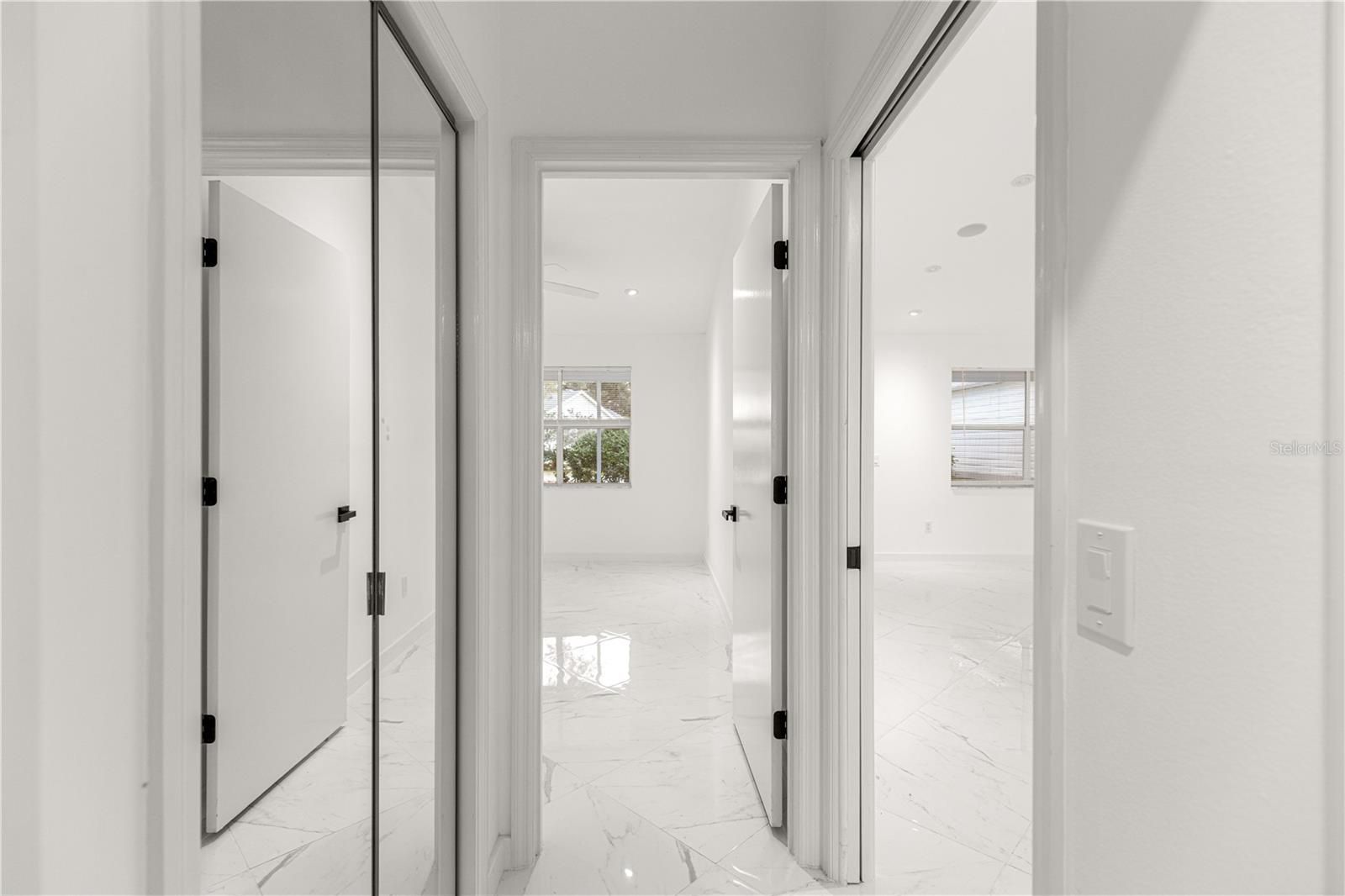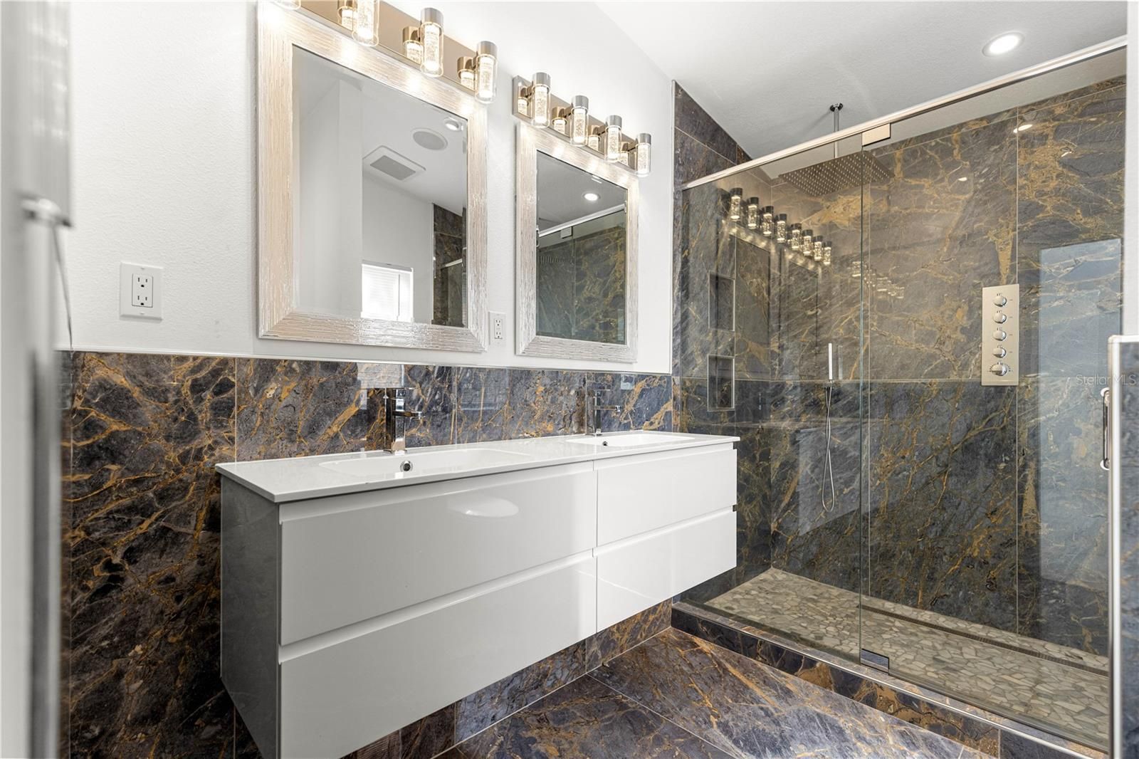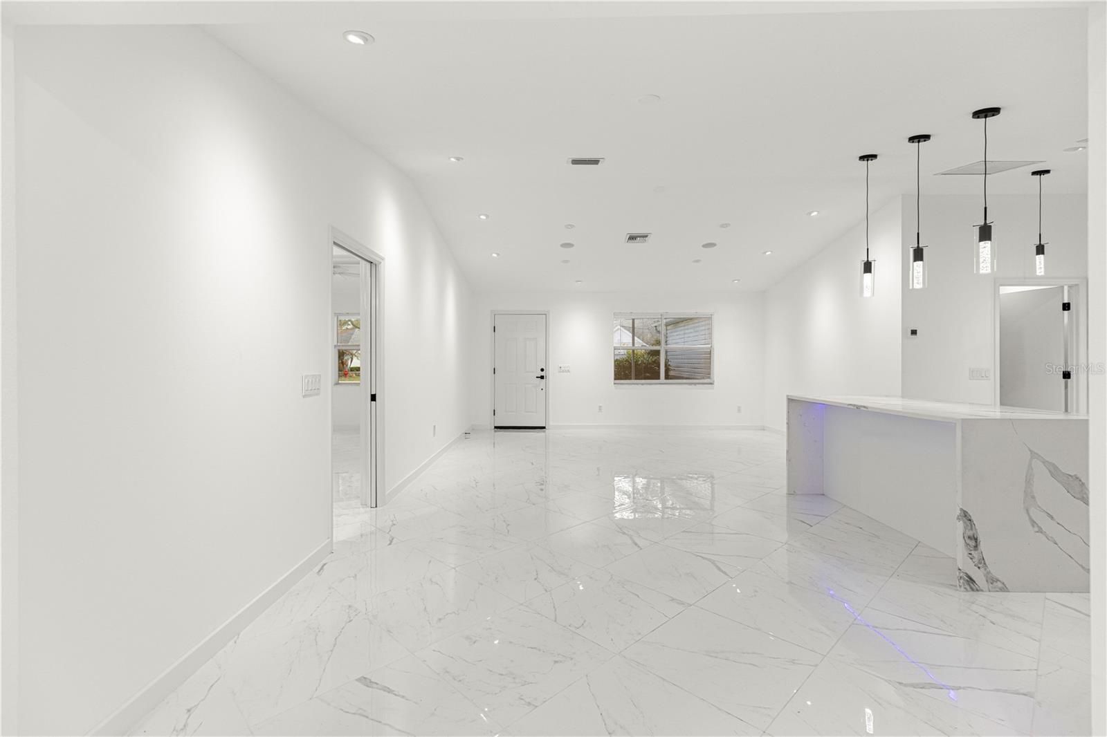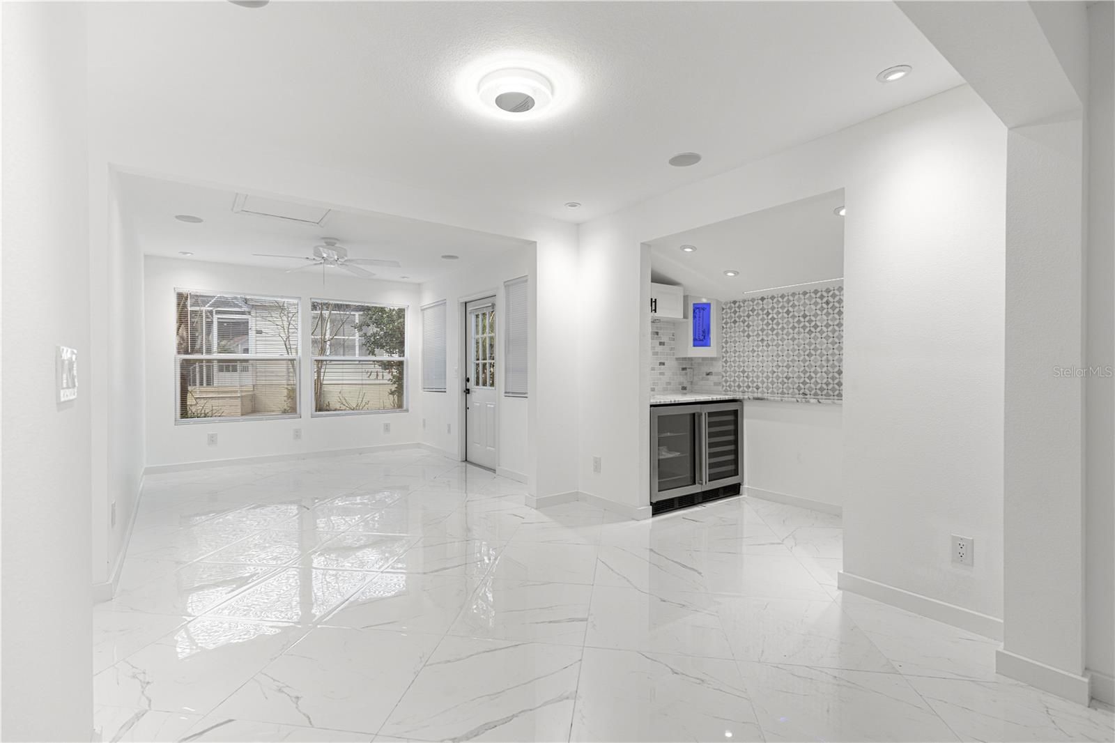 Perfectly positioned in the heart of The Villages. In the village of La Zamora, this beautifully updated three-bedroom, three-bathroom home offers the ideal blend of modern luxury and unbeatable convenience. Located just 3.5 miles from Lake Sumter Landing, 1.5 miles from Spanish Springs Town Square, and 9.5 miles from Brownwood Paddock Square, you’ll enjoy effortless access to nightly live entertainment, dancing, shopping, and an array of dining options that make this community so desirable. Inside, the thoughtfully designed open floor plan creates a seamless flow for both everyday living and entertaining. Polished porcelain floors, custom LED lighting, and a whole-house sound system set the tone for a sophisticated yet welcoming atmosphere. The recently renovated kitchen serves as the heart of the home, showcasing sleek granite countertops, a dramatic waterfall island, and new stainless steel appliances—perfect for morning coffee or hosting gatherings with friends and family. The spacious primary suite is a private retreat, complete with a spa-inspired en suite bath featuring dual custom rainforest showerheads, handheld sprayers, and a six-jet body shower panel for a true luxury experience. A well-appointed laundry area includes a stacked washer and dryer, oversized sink, and even a convenient pet washing station. Entertain with ease at the wet bar, equipped with a glass washer, wine refrigerator, and generous storage. Set within a serene neighborhood enhanced by mature landscaping, the property offers both privacy and curb appeal. Practical updates provide peace of mind, including a new roof (2022), new HVAC system, and new water heater—plus the added benefit of no bond. With its premium upgrades, exceptional location, and room to make it your own, this Florida retreat is a rare opportunity to enjoy the very best of life in The Villages.