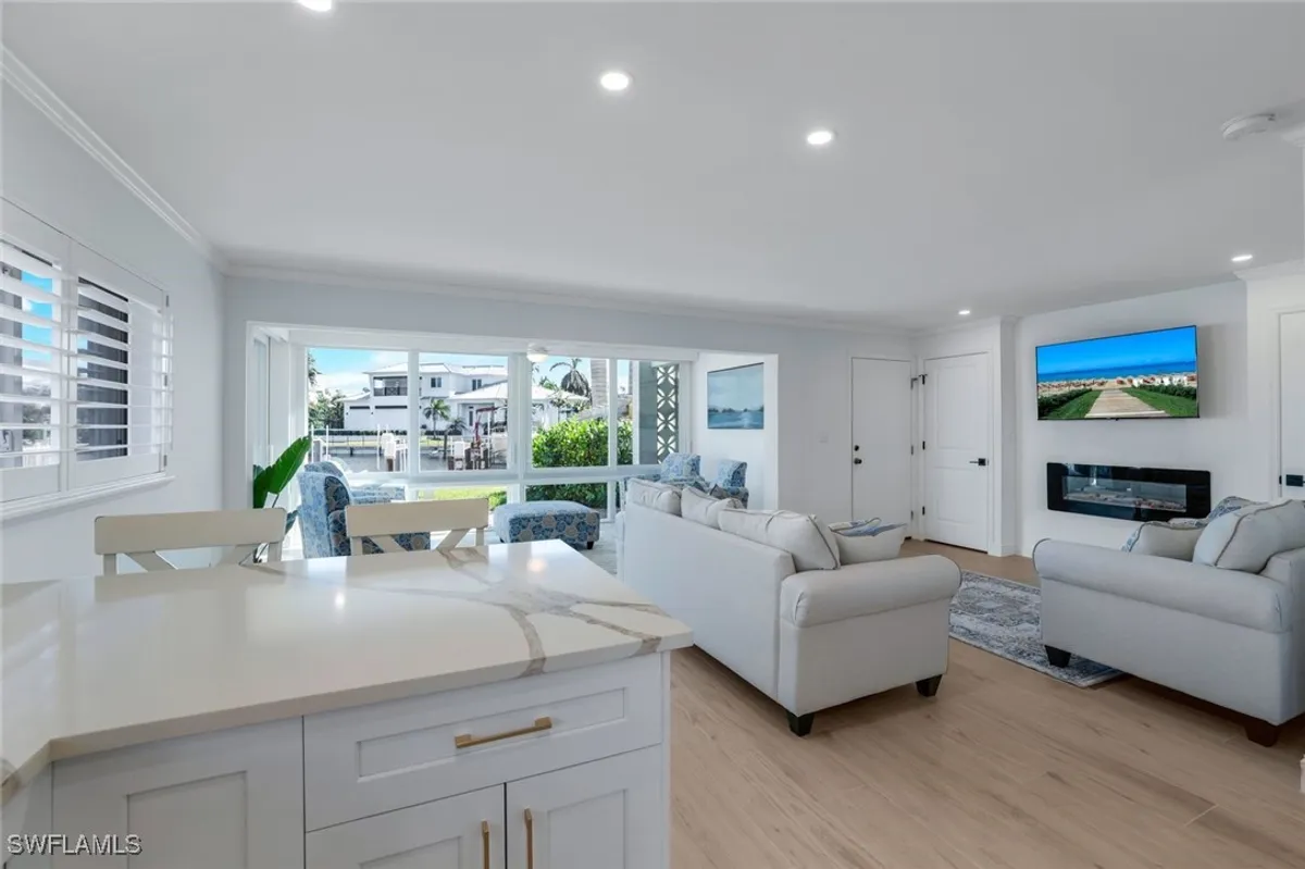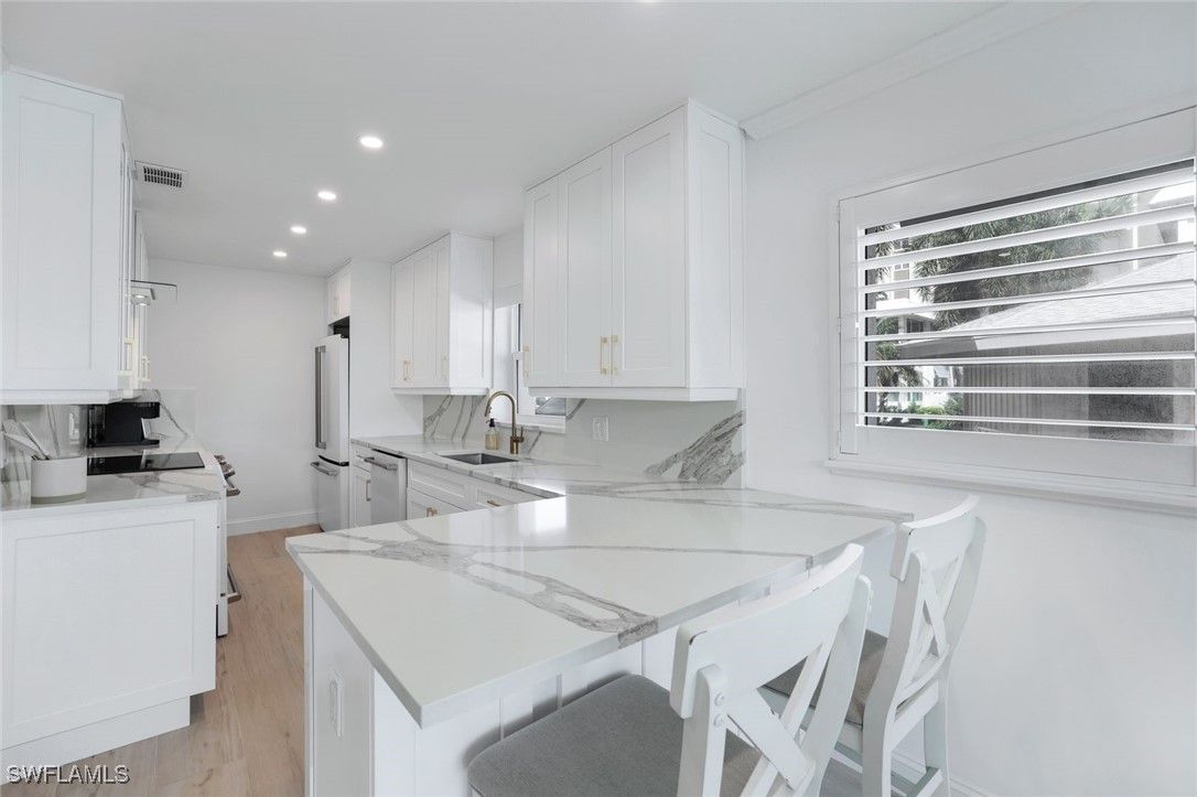 ONE of the BEST LOCATIONS in NAPLES & FULLY RENOVATED with BAY VIEWS!! This Highly desirable CORNER UNIT is situated just SOUTH of Doctors Pass! Port Au Villa is located directly across the street from The Moorings Private Beach Park! The Private Beach offers shaded beach parking, covered pavilions, large open greenery, lushly landscaped seating areas, play areas for your kids or grandkids and is exclusive to Moorings Residents. YOU HAVE TO SEE IT FOR YOURSELF. The Owner spared no expense reimagining this Beautiful BEACH RETREAT!. The home has IMPACT Glass throughout, Electronic Roll Down Shutters, CUSTOM Window Treatments, Quartz Countertops, CAFE Appliances and LED Lighting. Port Au Villa Owners also have the potential to purchase a BOAT SLIP with LIFT From a current Owner as they become available. Located One Mile South of Port Au Villa is The Newly Opened Four Seasons Naples Beach Resort; Just 3 miles South are the Pedestrian Friendly Promenades of Historic 5TH AVE SOUTH! Come RELAX and Enjoy the SUNSHINE in one of Naples most coveted locations!
