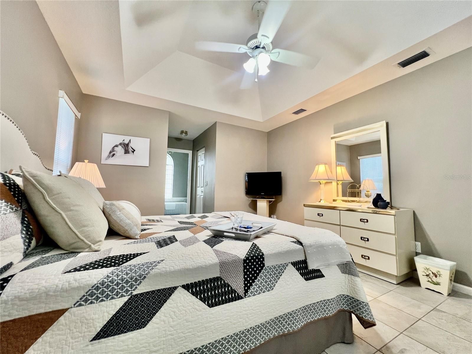 - Ceiling Fan(s), Eat-in Kitchen, High Ceilings, Living/Dining Room, Main Level Primary, Thermostat, Vaulted Ceiling(s), Walk-In Closet(s)