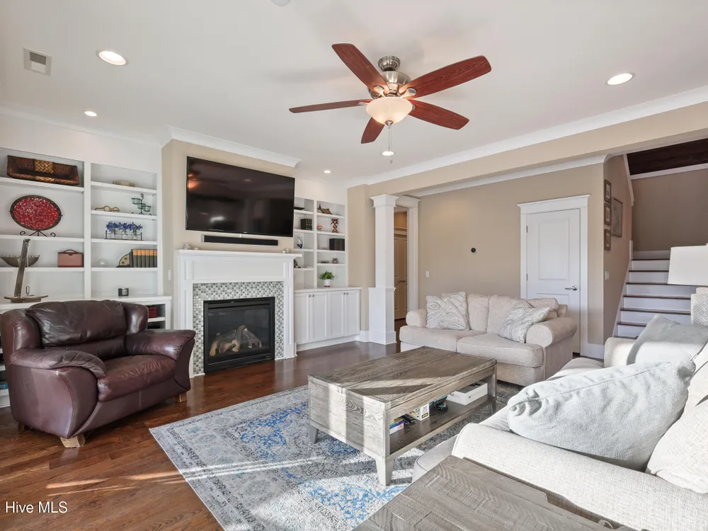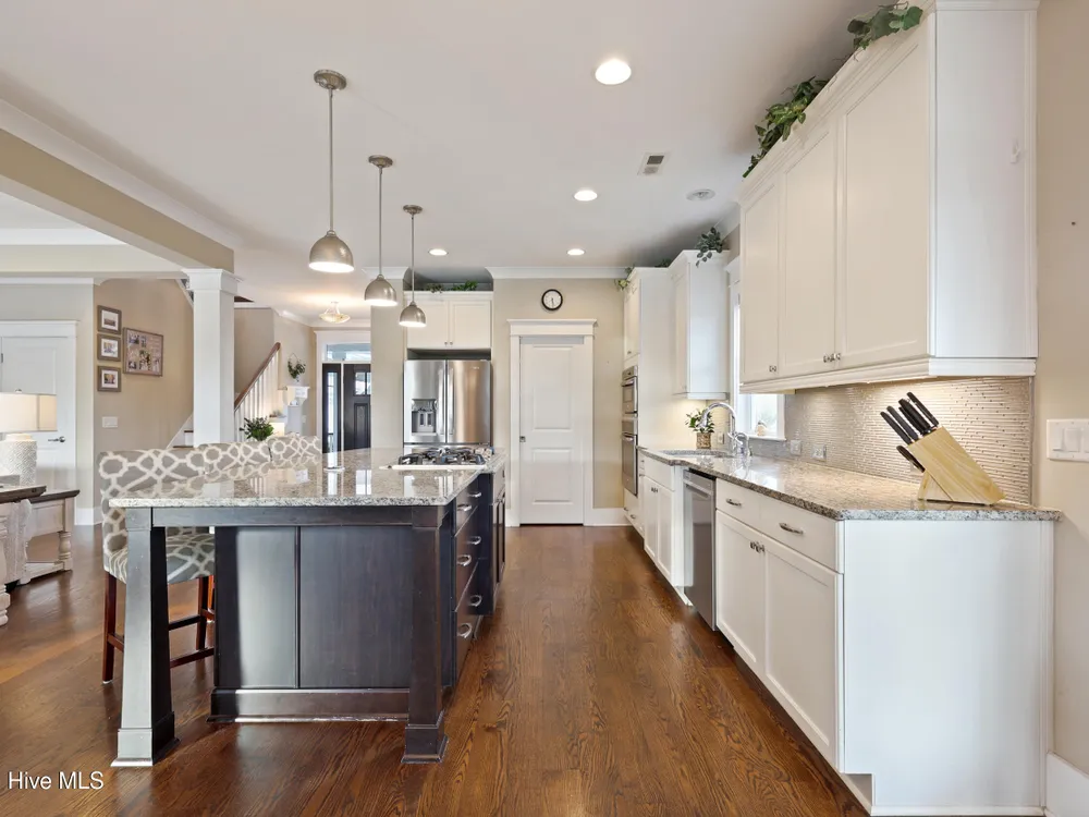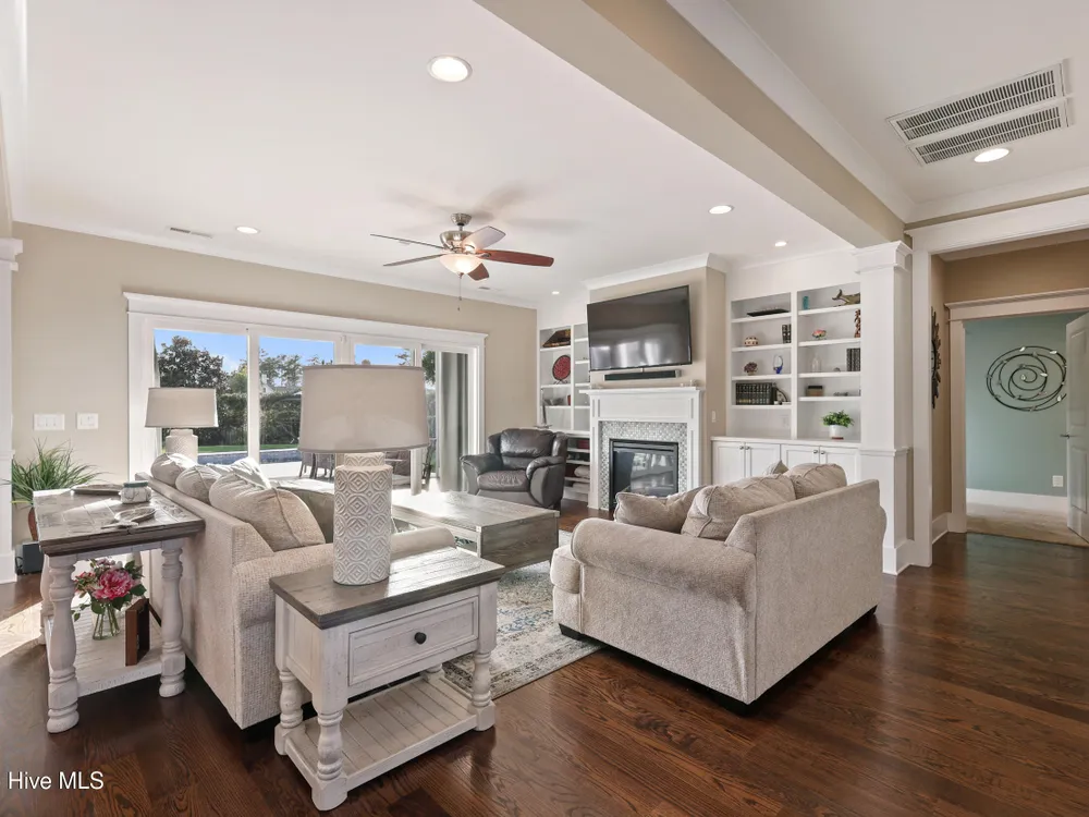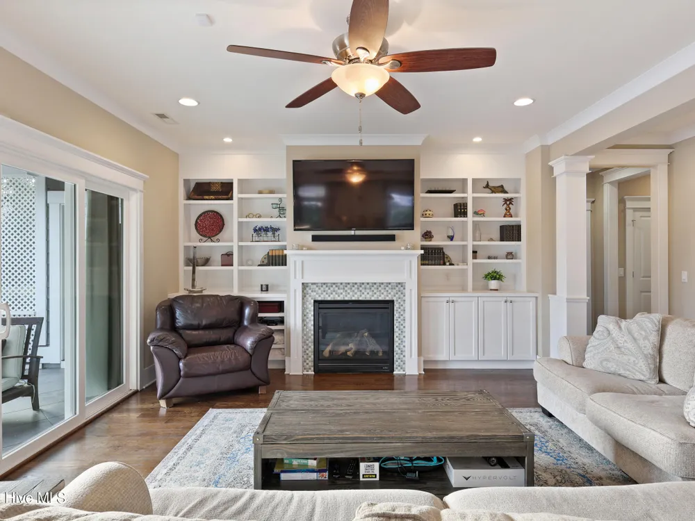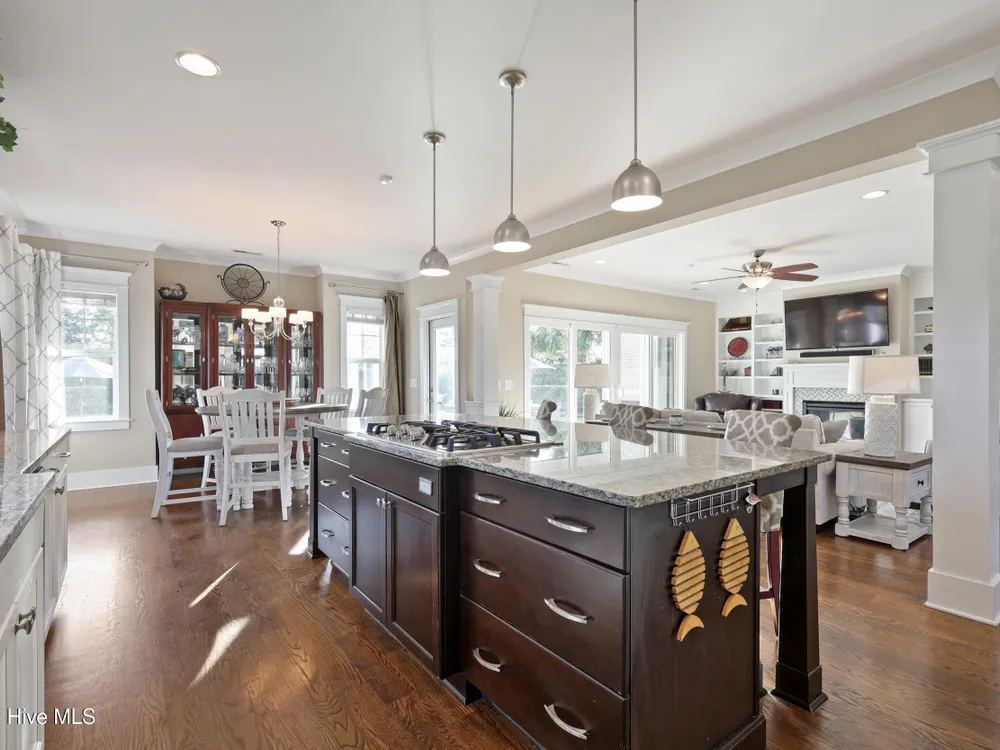 - Blinds/Shades, Walk-in Shower, Entrance Foyer, Pantry, Master Downstairs, Kitchen Island, High Ceilings, Gas Log, Ceiling Fan(s), Bookcases