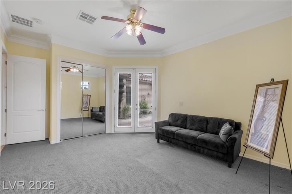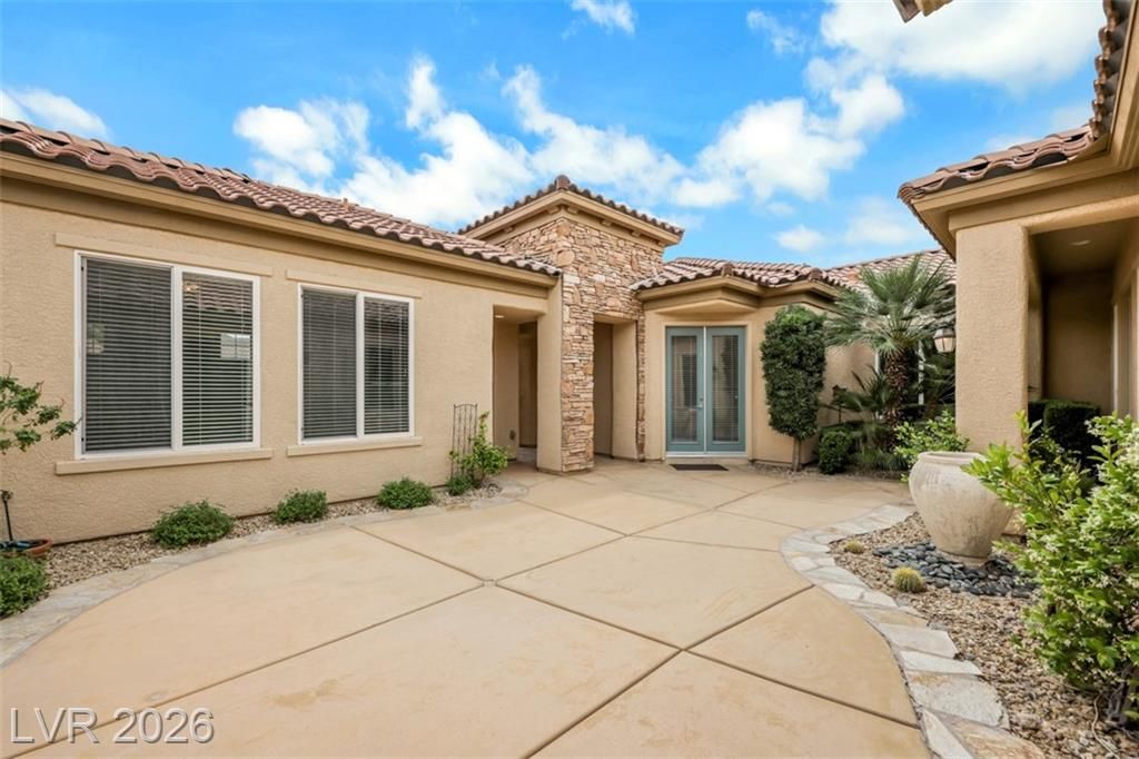 A very desirable Trenton model on an elevated corner lot with beautiful strip view that can be seen from inside the great room. Three master suites, including the room in the casita, all opening into a private gated courtyard equipped with a gas fireplace. Upgraded interior with surround sounds that pipe music to the courtyard and the backyard. The kitchen has an island, granite counters, and pull out drawers added to all the cabinets. The master bedroom has exquisite view of the strip, and special French doors that open into the backyard. The large, close to 1/4 of an acre, landscaped backyard has views of mountains, palm tress, and the strip, plus an in-ground spa with a water fall. The AC unit is one year old, and the water heater has also been lately replaced. There is also a one year old solar panel system owned and fully paid for to help you save your annual electrical bills. This house is a must see, and you will love it.