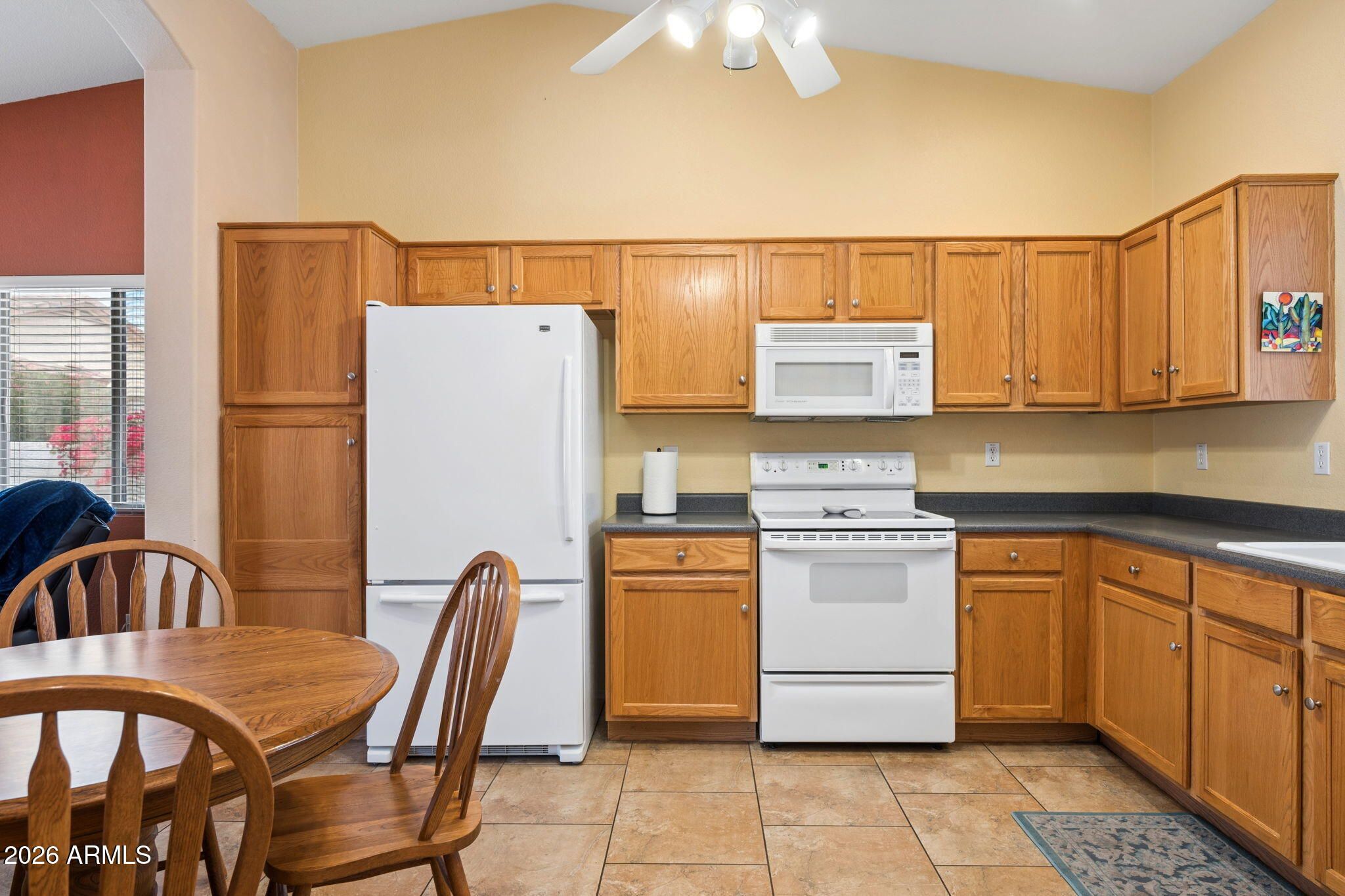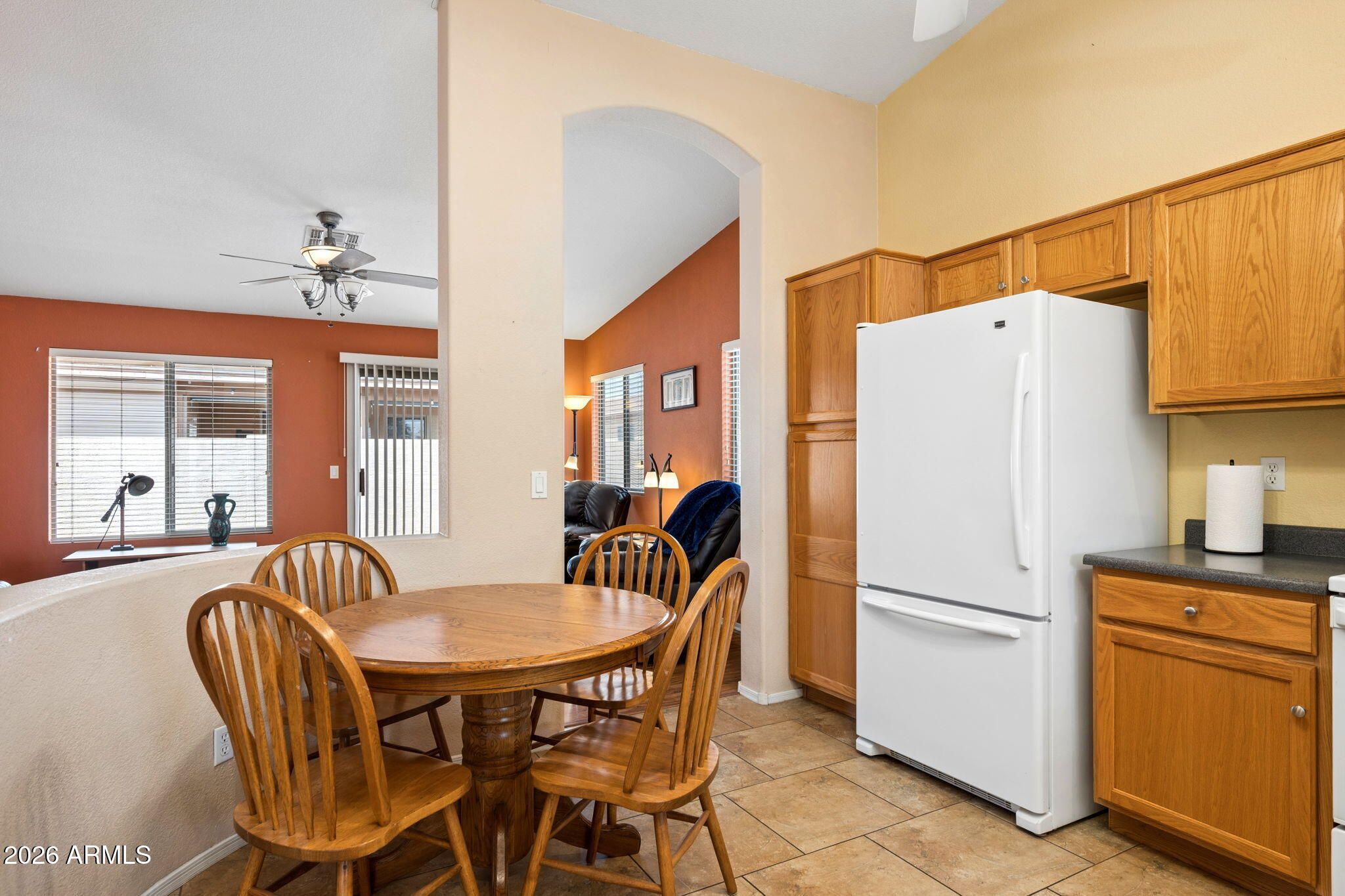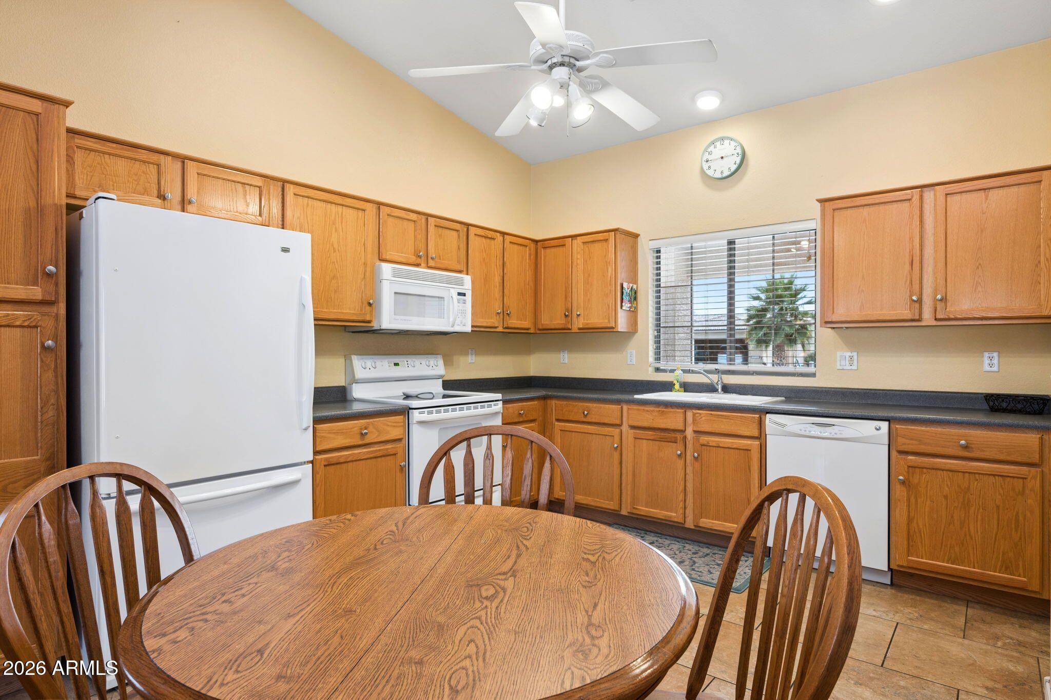 Beautifully maintained 2 bed, 2 bath home in the desirable 55 or older gated community of Meridian Manor. This popular Canyon floor plan features vaulted ceilings, spacious living areas, and a flexible den/office. The eat-in kitchen features ample storage and flows nicely into the main living space--ideal for everyday living or entertaining. Tile flooring in key areas, plus included appliances add convenience. Enjoy a private yard with covered patio and low-maintenance desert landscaping. Community amenities include a heated pool, spa, clubhouse, & pickleball courts. Located just minutes from US-60, shopping, dining, and medical facilities. Easy, low-maintenance living at an attractive price point.