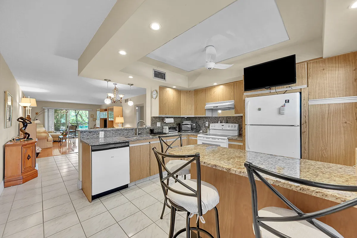 BEAUTIFUL 2BEDROOM/2BATH WITH OPEN KITCHEN WITH GRANITE COUNTER TOPS + WHITE APPLIANCES. NICE KITCHEN CEILING. CERAMIC + LAMINATE FLOORS THROUGH-OUT (NO CARPET). KNOCKDOWN CEILING. FANS N EVERY ROOM. PRIVATE VIEW OF THE GARDEN/POOL FROM THE SCREENED BALCONY WITH SHUTTERS. WATER HEATER (APPROX 6 YRS). ASSOC REQUIRES 15% DOWN & 1 OCCUP 55+ VACANT/CLICK ON SHOWING ASSIST