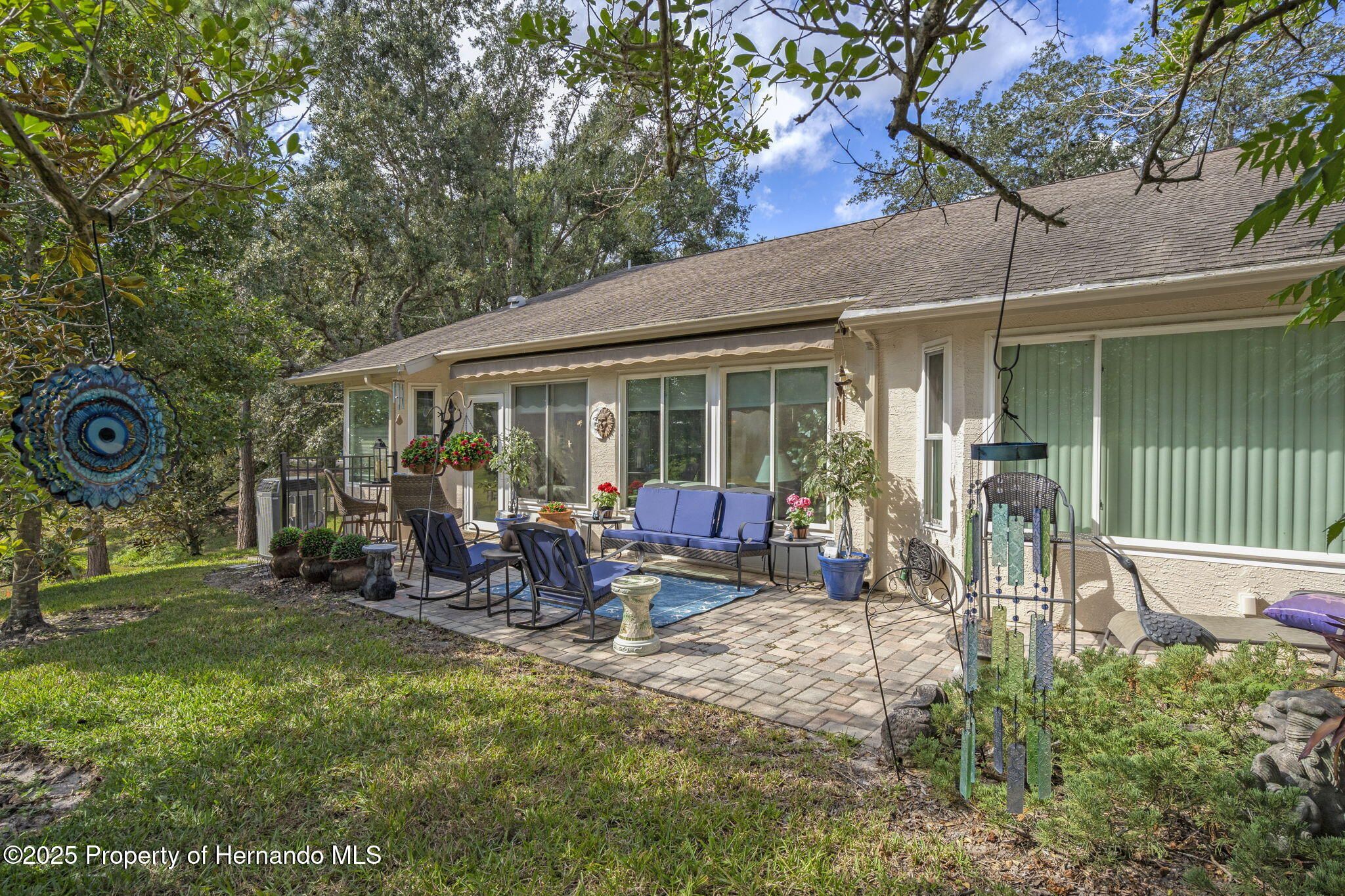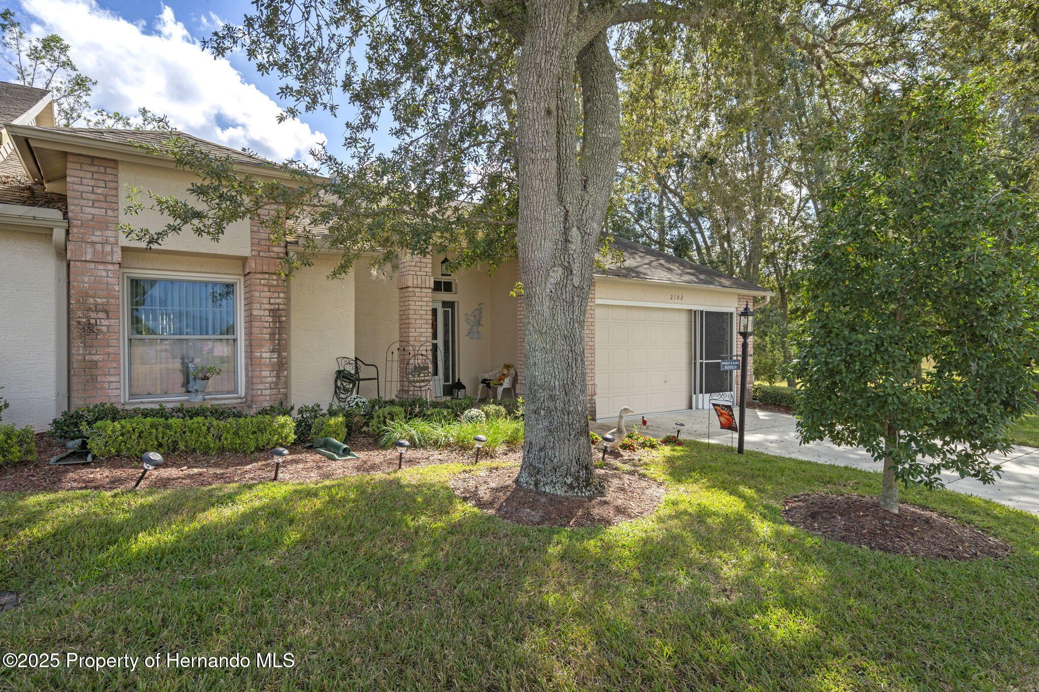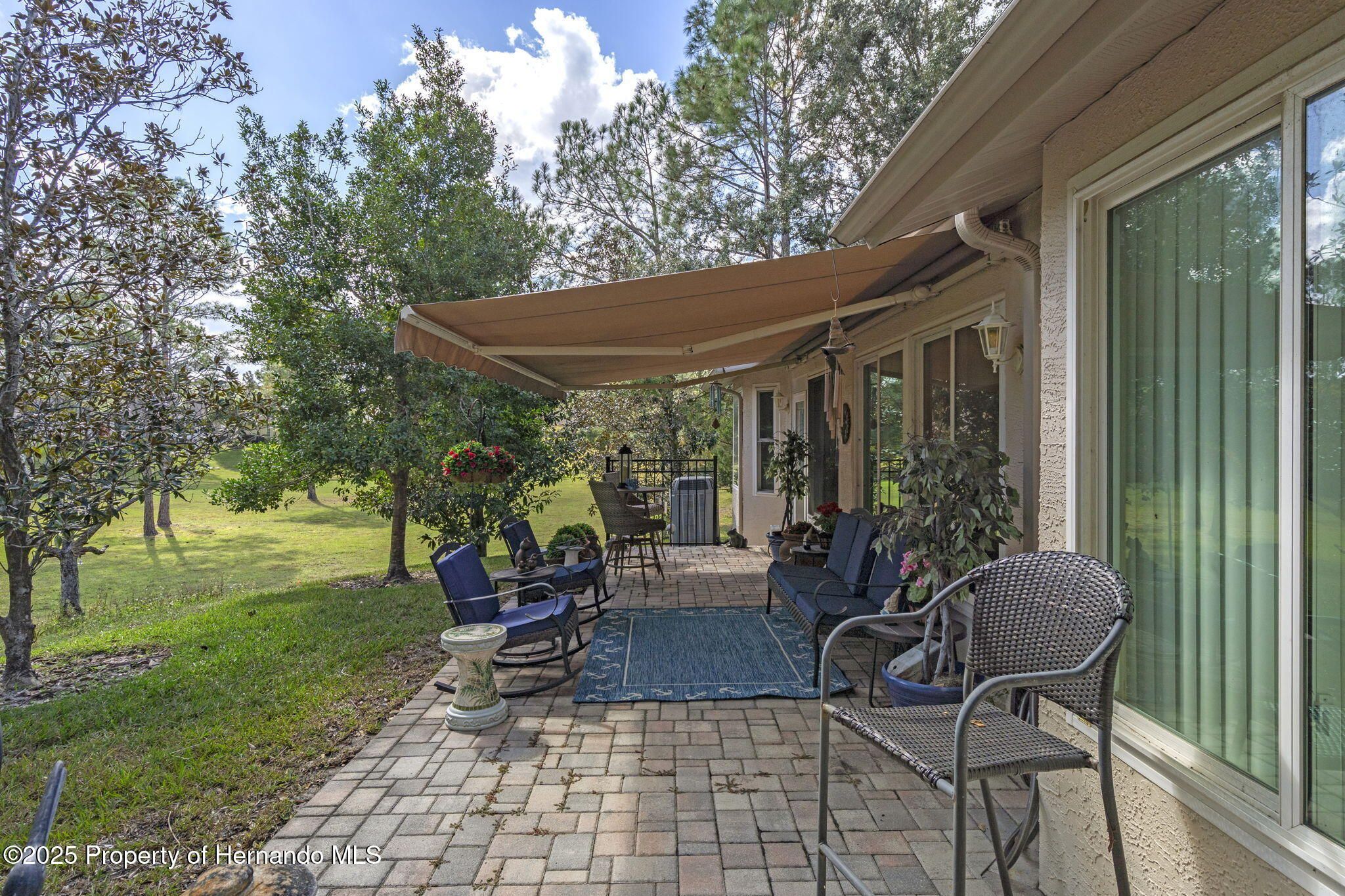 Are you ready to relax and enjoy life in style??? This two-bedroom, two bathroom, END UNIT Oakmont Villa in the award-winning 55+ community of Timber Pines is your answer!!! This maintenance-free villa is move-in ready and furnished beautifully! Upon entering through the front door, you will be awed by the open concept plan featuring the spaciousness of the living, dining and kitchen area with vaulted ceilings. Adding to the light airy feeling is the Florida Room (heated and cooled) which overlooks the scenic backyard. Stepping outside from the Florida Room you will find an oversized brick paver patio with a retractable awning to provide for sunshade when needed, and overlooking the serene side and backyard.--All great for entertaining or relaxing! The Kitchen features soft-close touch cabinets, pull out shelves and Corian countertops with a lovely windowed breakfast nook area. A unique clear glass door leads to the Laundry Room from the kitchen with a new washer and dryer. You will find the two-car garage meticulous with its epoxy coated floor, attic-drop down stairs and garage screen enclosure. The oversized Primary Bedroom has a king size adjustable bed and two walk-in closets, along with spectacular window views to the backyard. The Ensuite Bathroom features double sinks with a Corian countertop, walk-in shower and heat lamp. Pocket doors provide privacy for the Guest Bedroom and Bathroom area. The Guest Bedroom has a large walk-in closet and a sofa bed. The Guest Bathroom also has a Corian countertop and a shower/jetted tub. GET READY TO RELAX AND ENJOY THE RESORT LIFESTYLE TIMBER PINES OFFERS!!!--Whether it's relaxing in the two Community pools/spas or having a leisurely lunch or dinner at the Club House, enjoying time at the Arts and Crafts Center, Library, Woodworking Shop, playing tennis or pickleball , 4 community Golf Courses, billiards or taking classes in the state of the art Fitness/Wellness Center or participating in the myriad of clubs that are offered, there is something for everyone! Timber Pines is conveniently located next to local shopping, restaurants, hospitals, and easy access to major highways to Tampa and Orlando, gulf beaches, along with attractions in Florida's Nature Coast. CALL NOW TO EXPERIENCE THE LIFESTYLE YOU HAVE BEEN DREAMNG OF!!!