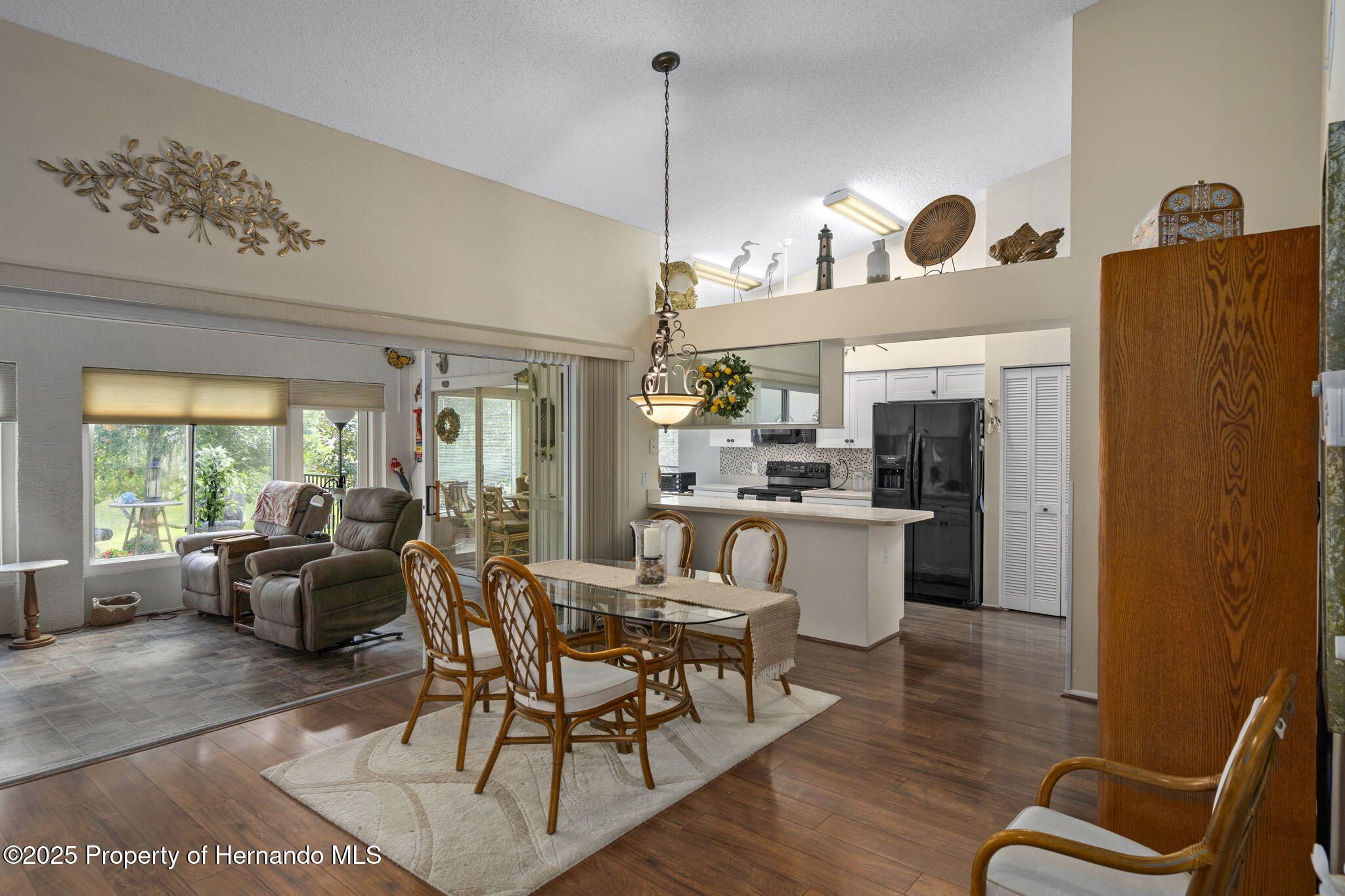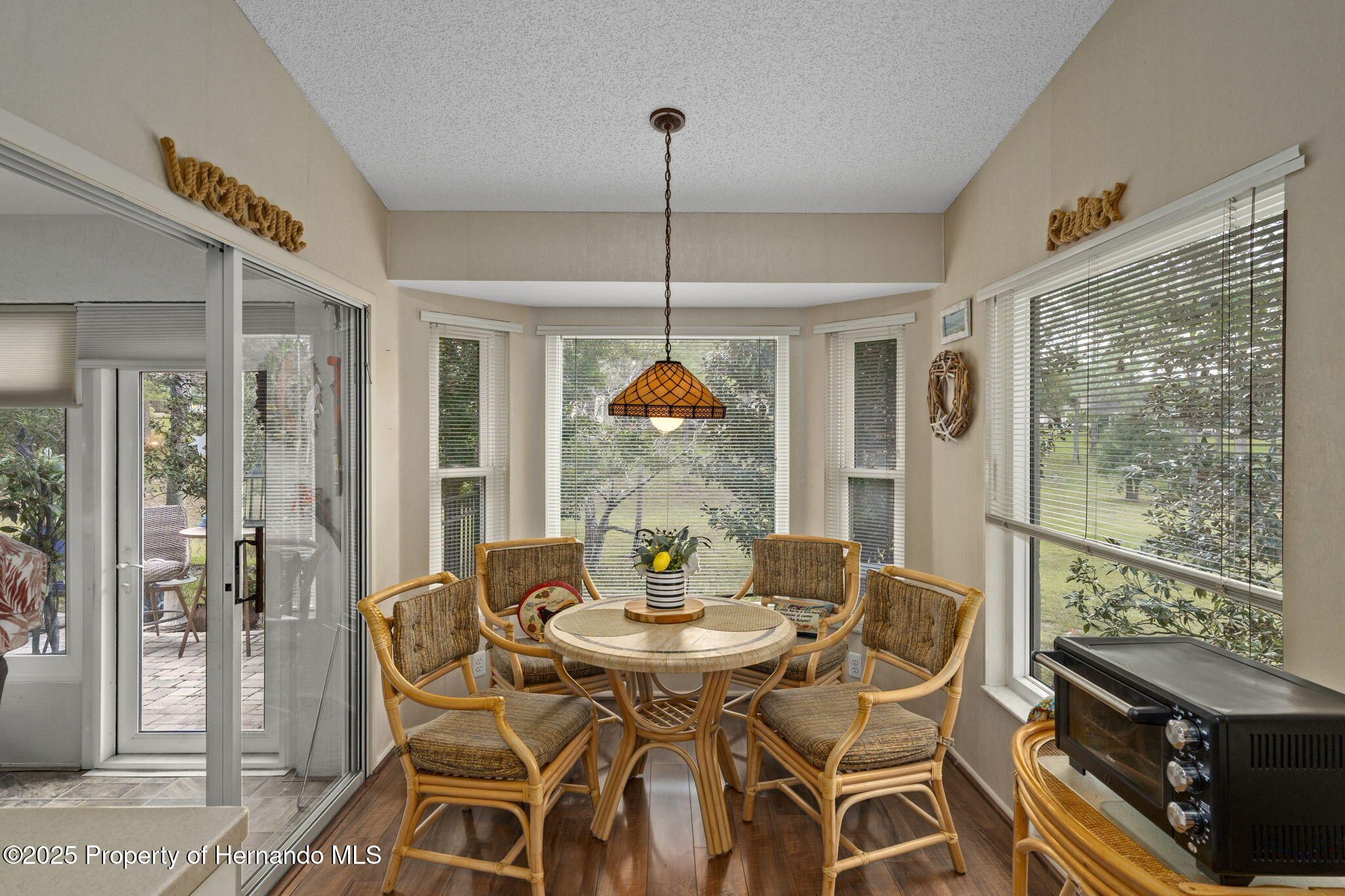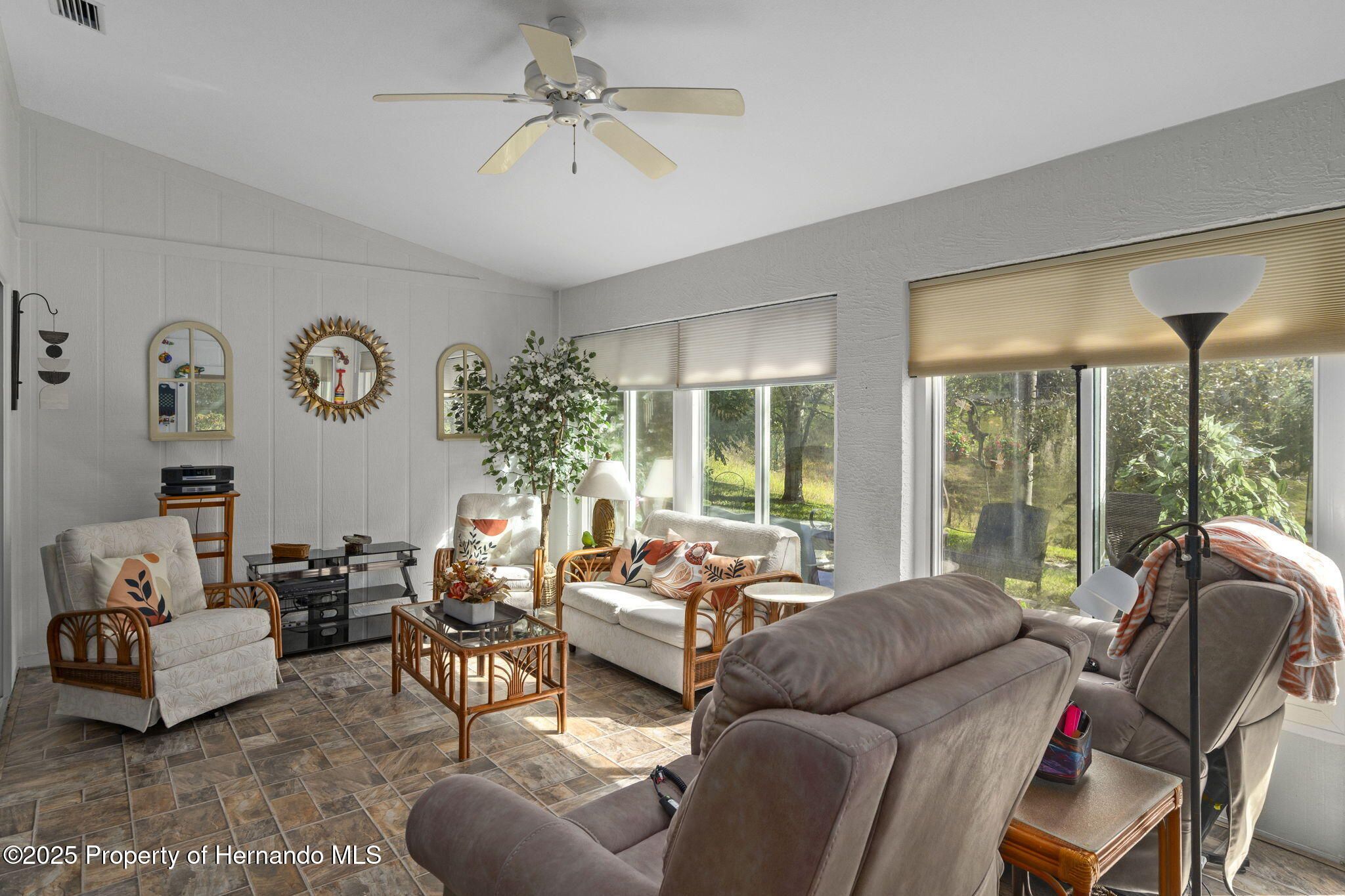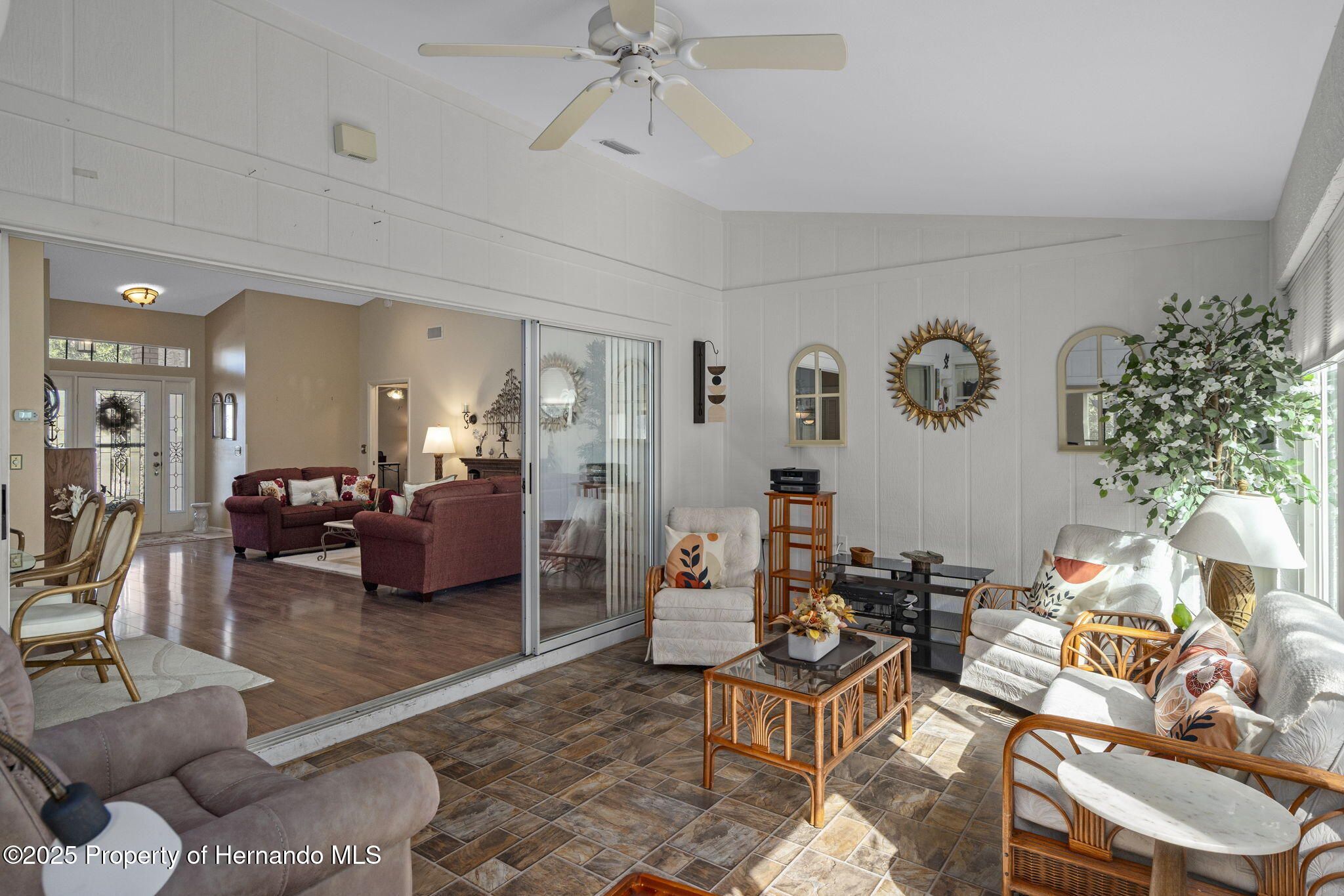 Are you ready to relax and enjoy life in style??? This two-bedroom, two bathroom, END UNIT Oakmont Villa in the award-winning 55+ community of Timber Pines is your answer!!! This maintenance-free villa is move-in ready and furnished beautifully! Upon entering through the front door, you will be awed by the open concept plan featuring the spaciousness of the living, dining and kitchen area with vaulted ceilings. Adding to the light airy feeling is the Florida Room (heated and cooled) which overlooks the scenic backyard. Stepping outside from the Florida Room you will find an oversized brick paver patio with a retractable awning to provide for sunshade when needed, and overlooking the serene side and backyard.--All great for entertaining or relaxing! The Kitchen features soft-close touch cabinets, pull out shelves and Corian countertops with a lovely windowed breakfast nook area. A unique clear glass door leads to the Laundry Room from the kitchen with a new washer and dryer. You will find the two-car garage meticulous with its epoxy coated floor, attic-drop down stairs and garage screen enclosure. The oversized Primary Bedroom has a king size adjustable bed and two walk-in closets, along with spectacular window views to the backyard. The Ensuite Bathroom features double sinks with a Corian countertop, walk-in shower and heat lamp. Pocket doors provide privacy for the Guest Bedroom and Bathroom area. The Guest Bedroom has a large walk-in closet and a sofa bed. The Guest Bathroom also has a Corian countertop and a shower/jetted tub. GET READY TO RELAX AND ENJOY THE RESORT LIFESTYLE TIMBER PINES OFFERS!!!--Whether it's relaxing in the two Community pools/spas or having a leisurely lunch or dinner at the Club House, enjoying time at the Arts and Crafts Center, Library, Woodworking Shop, playing tennis or pickleball , 4 community Golf Courses, billiards or taking classes in the state of the art Fitness/Wellness Center or participating in the myriad of clubs that are offered, there is something for everyone! Timber Pines is conveniently located next to local shopping, restaurants, hospitals, and easy access to major highways to Tampa and Orlando, gulf beaches, along with attractions in Florida's Nature Coast. CALL NOW TO EXPERIENCE THE LIFESTYLE YOU HAVE BEEN DREAMNG OF!!!
