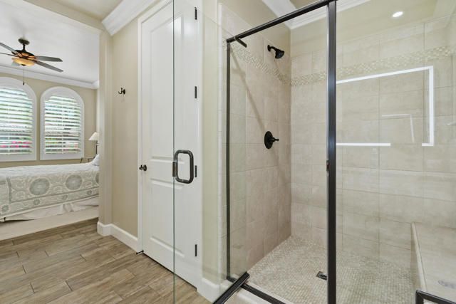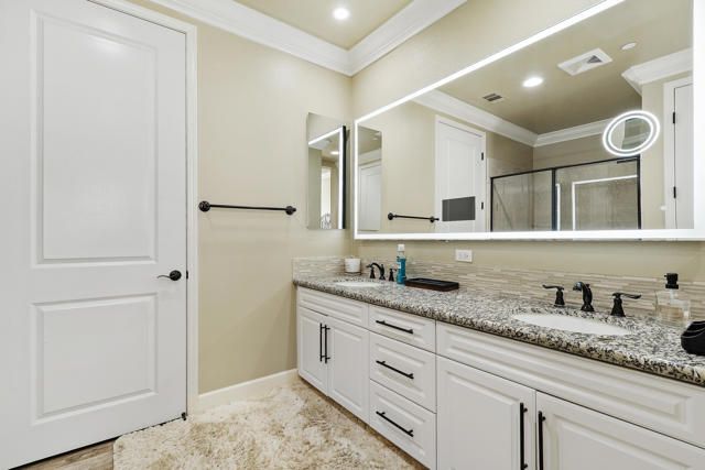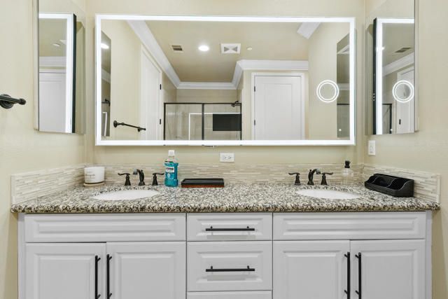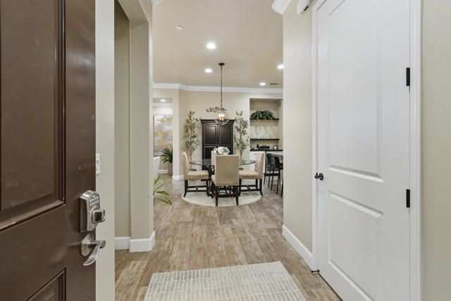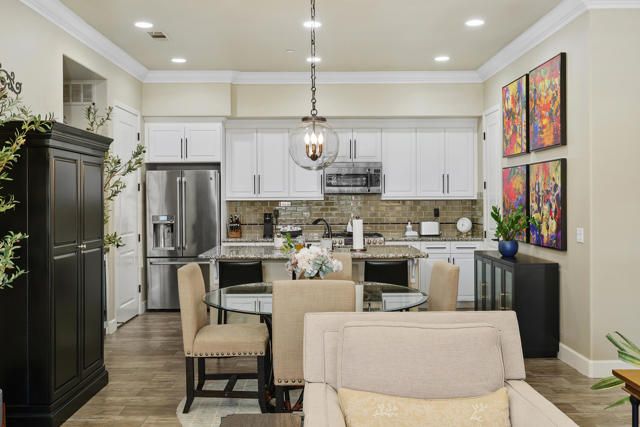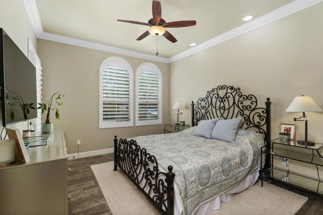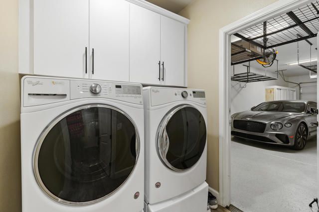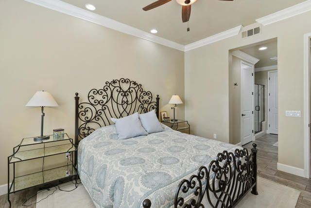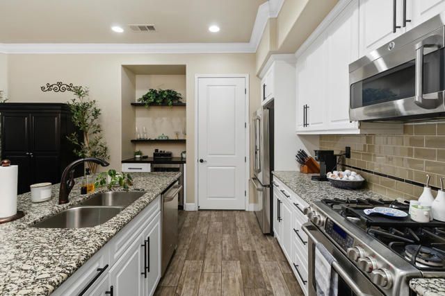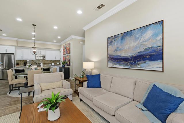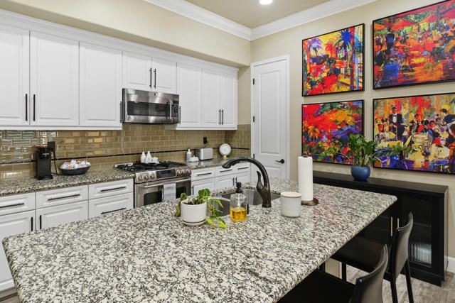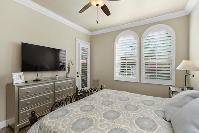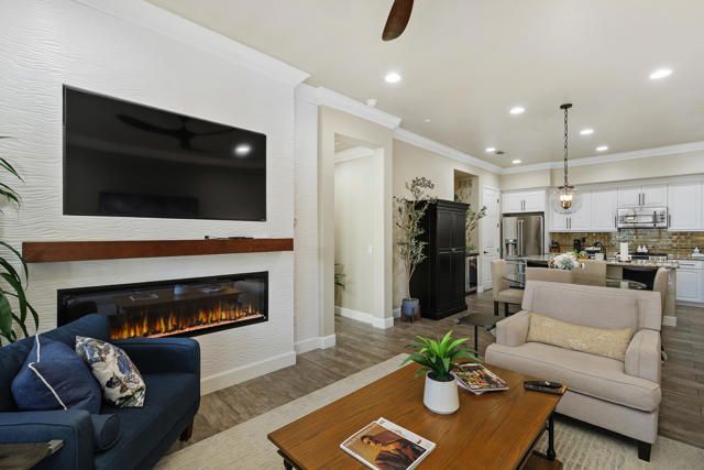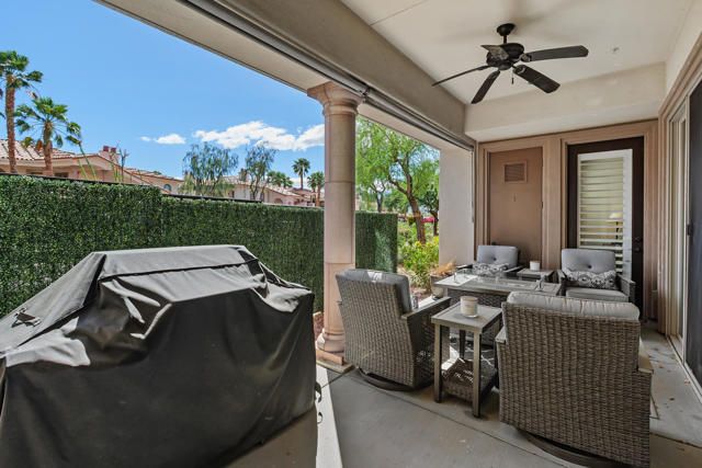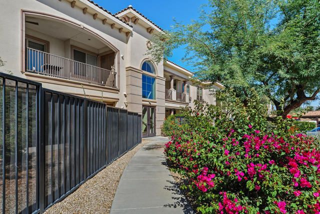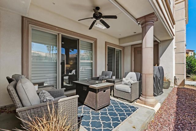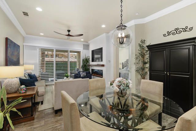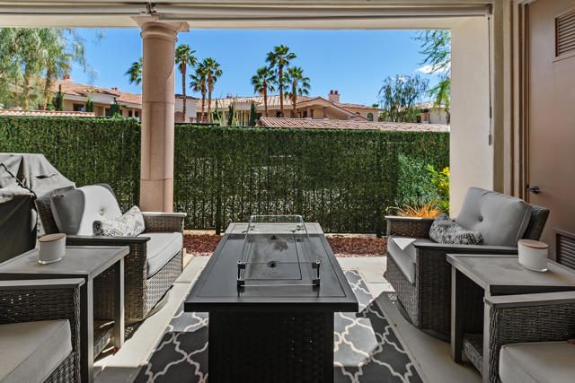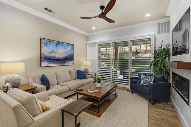 Welcome to Villa Portofino, Palm Desert's premier 55+ community! This ground-level, turnkey furnished home offers an open floor plan with soaring ceilings, abundant natural light, and a stylish floor-to-ceiling tiled fireplace. The gourmet kitchen features an island, granite countertops, stainless steel appliances, wine refrigerator, and custom cabinetry. The spacious primary suite includes dual vanities, a tiled walk-in shower, designer lighted mirror with built-in TV, and a large walk-in closet. Enjoy a private patio with fire table, BBQ, ceiling fan, and electric shades.Additional highlights include DIRECT PRIVATE GARAGE ACCESS through the laundry room, plus a 2-car garage with EV charger, epoxy floors, and built-in storage. Plantation shutters, crown molding, and ceiling fans throughout add comfort and style. HOA includes water, internet, cable, earthquake insurance, and access to a 30,000 sq. ft. clubhouse with resort-style pool, fitness center, restaurants, theater, and more. Ideally located near El Paseo Shopping District, dining, and medical facilities.Move-in ready and designed for easy, resort-style living, schedule your private showing today!