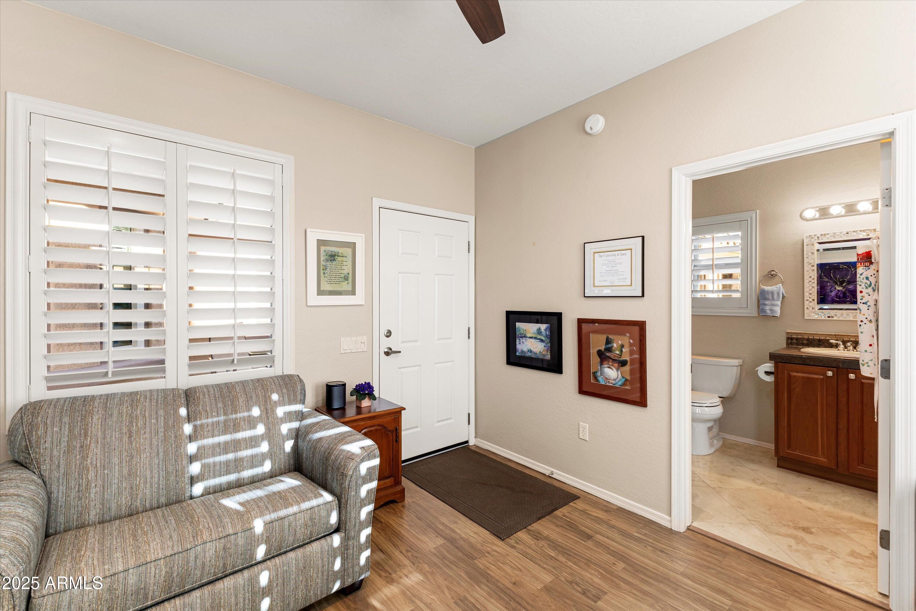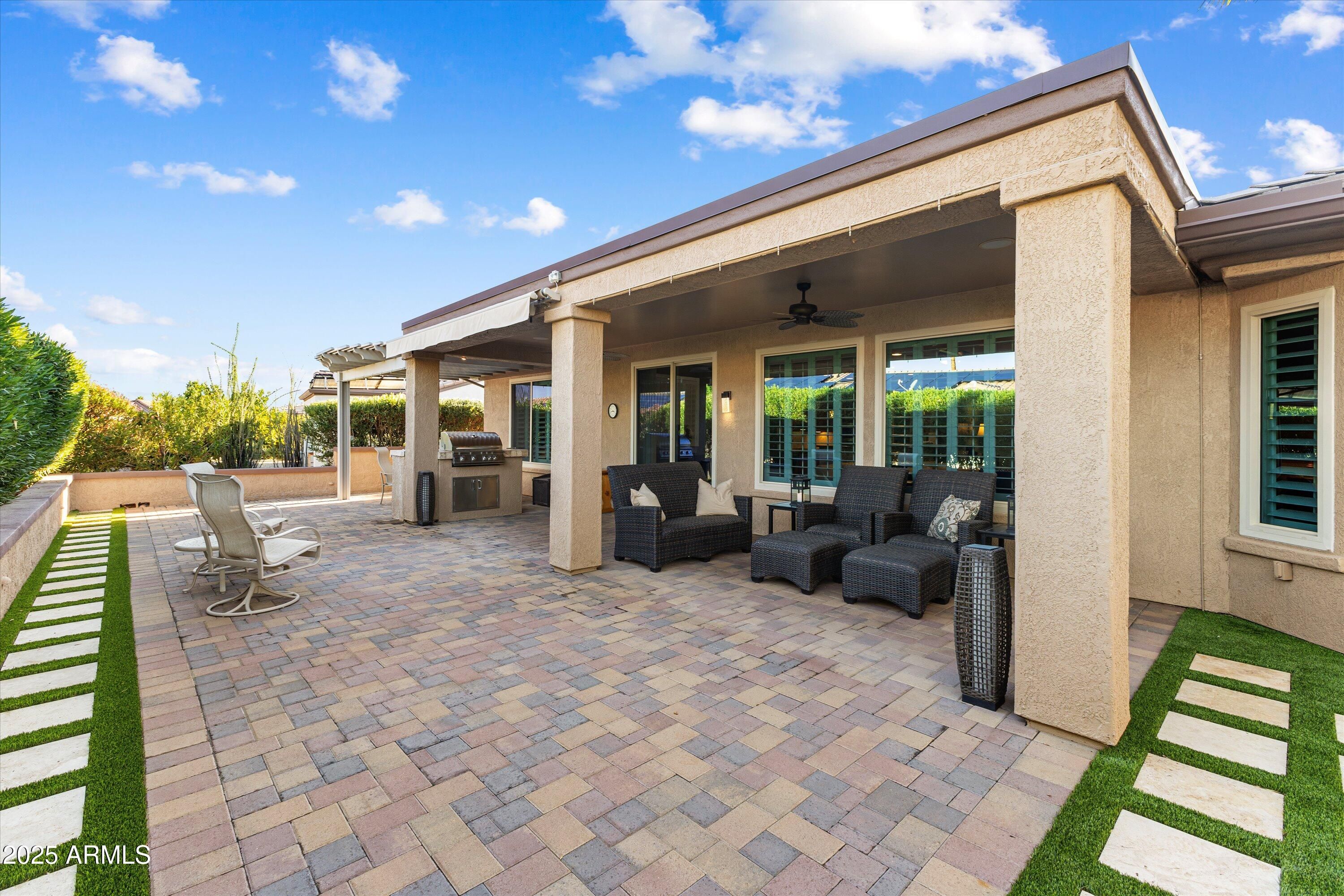 One of a kind Beauty! All the upgrades you can imagine. OWNED SOLAR on a Borgata + Casita (3bd/3ba), featuring a NEW roof underlayment, windows, & patio door! A bright split floorplan showcases plantation shutters, travertine, & wood-look tile floors. The Great Room with custom media wall flows into a stunning kitchen w/SS appliances, gas cooktop, cherry cabinets, skylights, under cabinet lites & granite. The serene primary suite offers a bay window, raised vanity, travertine shower, & organized closet. Guest room has a Murphy bed & built-ins, plus get a flexible den. Backyard paradise w/a private paver patio, BBQ kitchen, synthetic grass, misting system, & awning. Extended 3-car garage with epoxy & storage. Casita offers full bath and mini-split. NEW HVAC/WH 2020, PVC 2022, gutters 2023.
