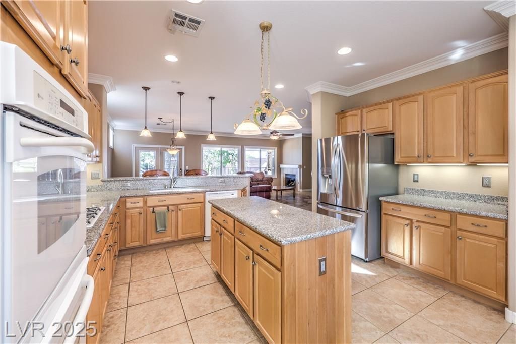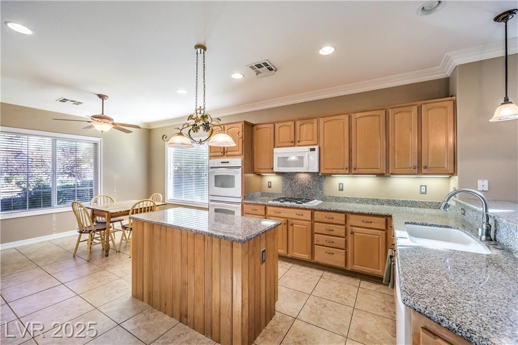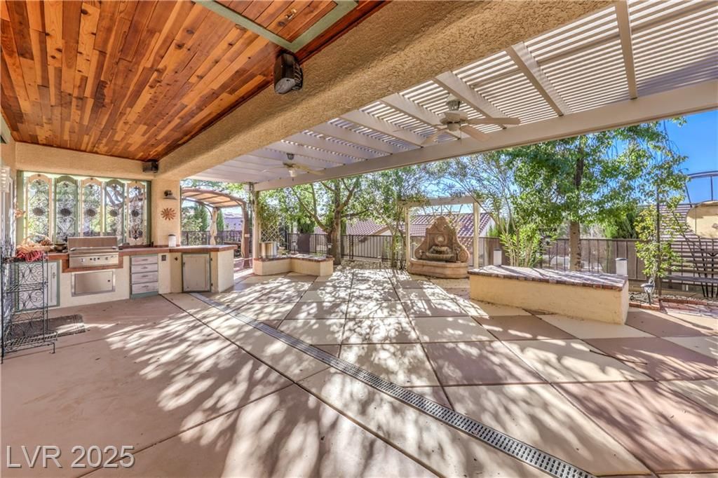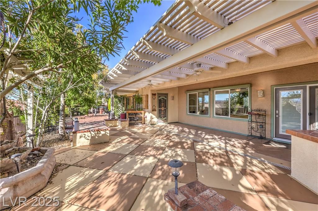 Beautiful Lincoln model with a large, private lot with a view of the mountain caps from the backyard. With two bedrooms and a den, this home is spacious, with a popular floor plan, crown molding, and lots of light. The kitchen includes an island, double ovens, a breakfast bar, and an eating nook. The oversized primary suite serves as a relaxing retreat, offering a comfortable sitting area, direct access to the backyard patio, and a large walk-in closet. The primary bathroom features a separate tub and shower, with double sinks. The versatile den/office provides flexible space for hobbies or work. Step outside to a peaceful backyard with a covered patio, pergola, and a built-in BBQ, enhanced by easy-care desert landscaping for low-maintenance enjoyment.