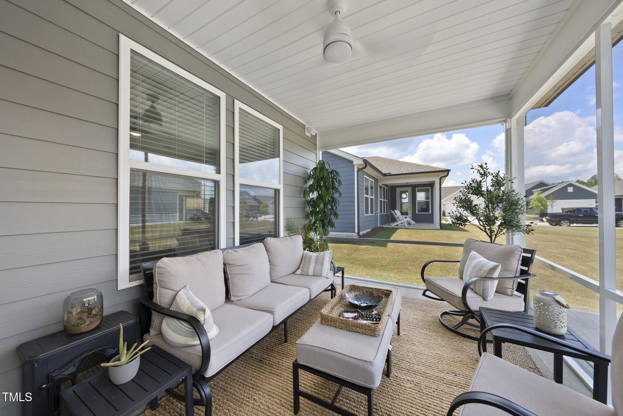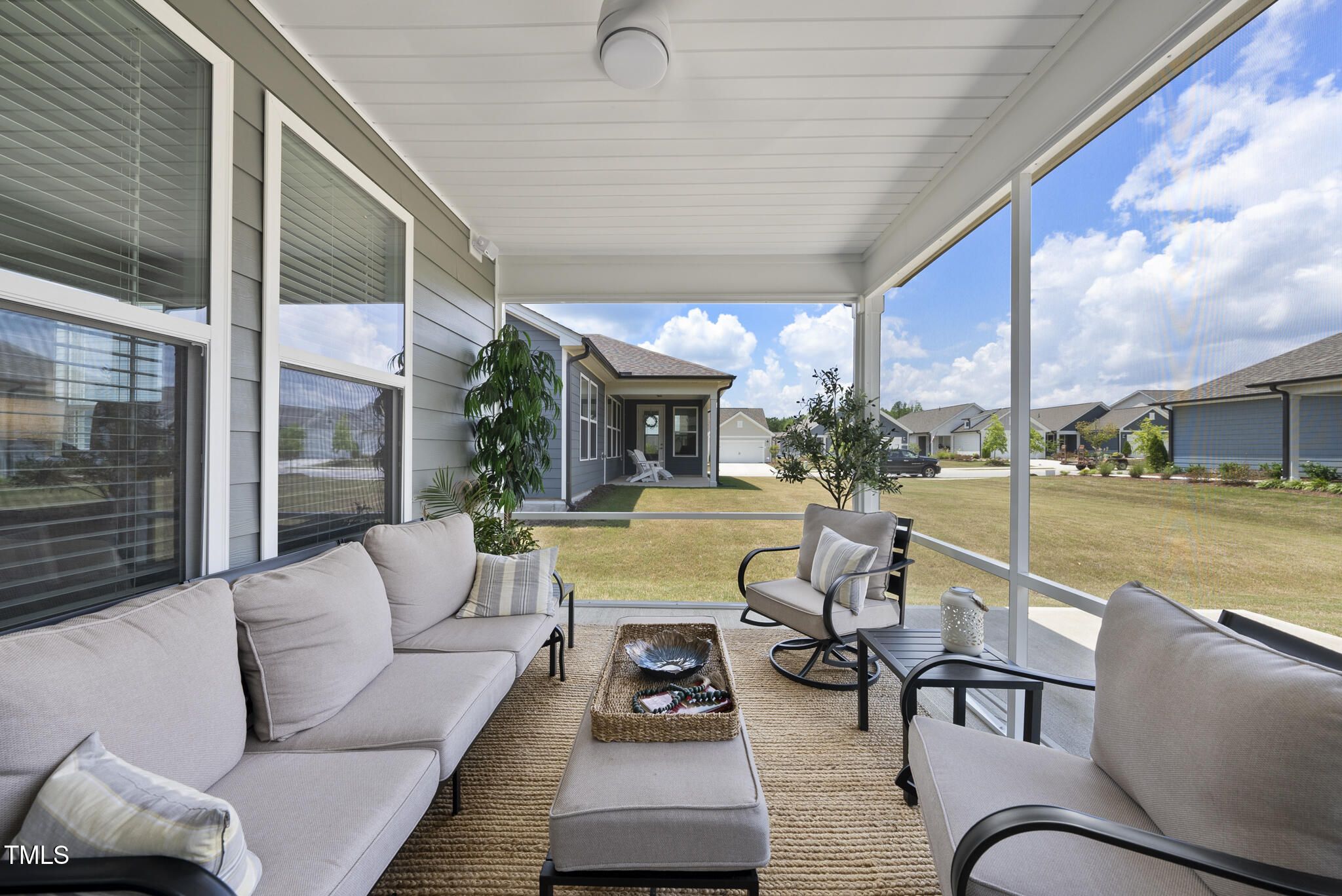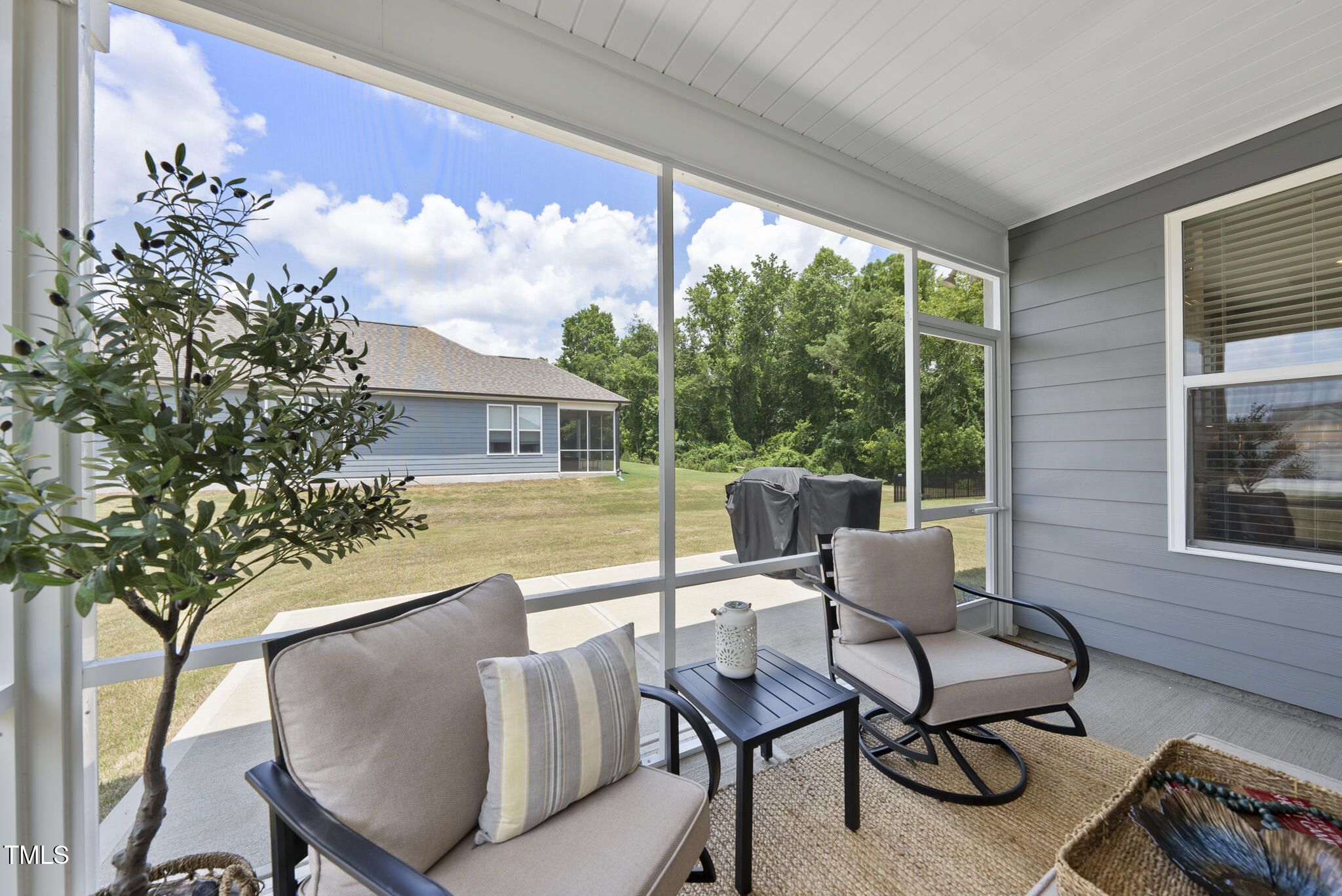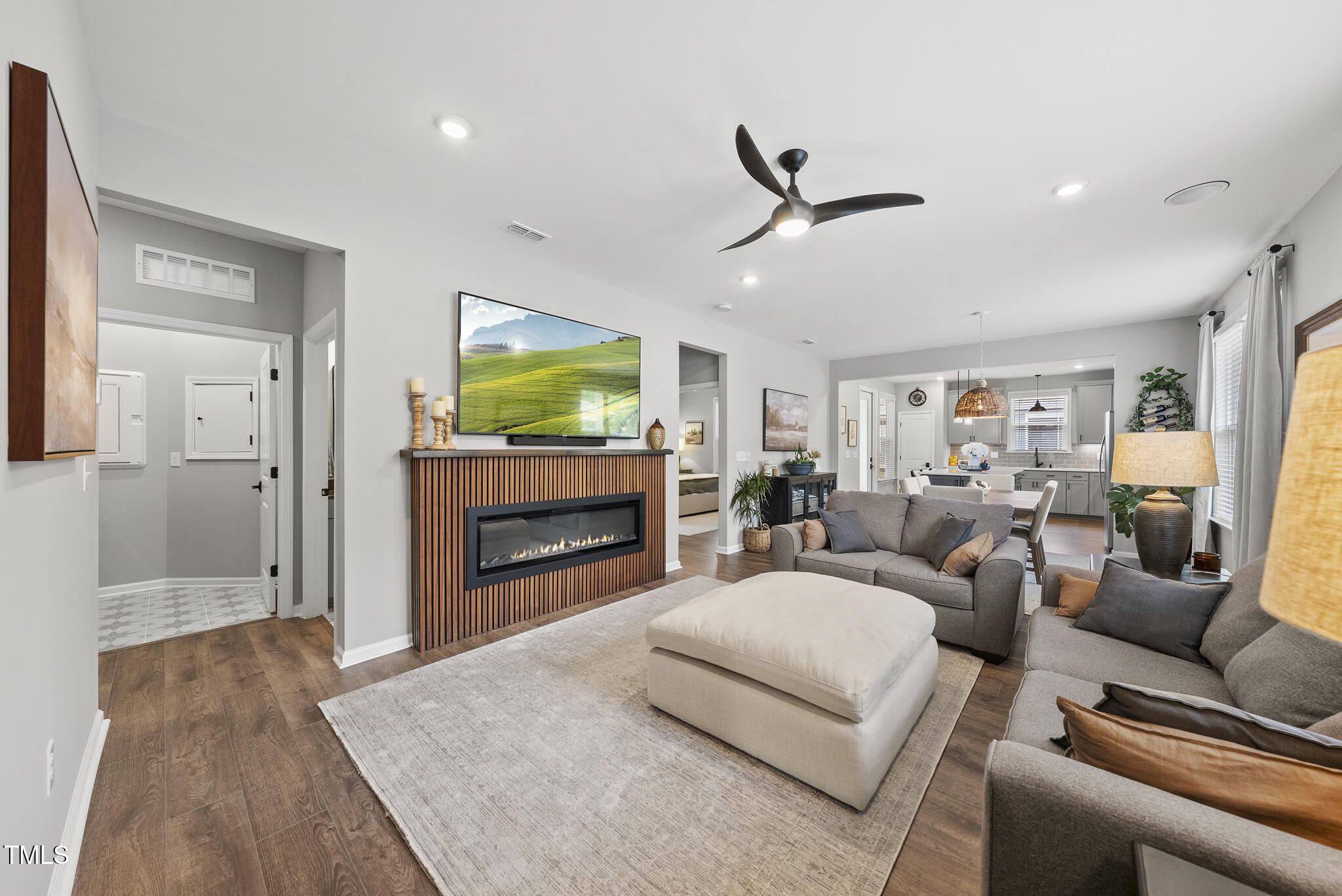 Don't miss this rare opportunity to own a practically brand-new, meticulously maintained home built in 2024 in the highly desirable Del Webb Carolina Gardens community. This gorgeous ranch-style home shines with style and sophistication, showing like a professionally decorated model. This is your chance to join one of the most vibrant active adult communities in the region. Built in March 2024, this popular Compass model home is currently the only one of it's kind for sale in the neighborhood. Still under full builder warranty, this home offers peace of mind along with premium upgrades throughout. The exterior features durable Hardiplank-style siding, a 30-year architectural shingle roof, and an upgraded radiant barrier sheathing system for enhanced energy efficiency and year-round comfort. Step inside to discover a thoughtfully designed layout with luxurious vinyl plank flooring throughout the entire home—there is no carpet anywhere. The main living area is warm and inviting, with modern LED flush-mount lighting and a custom-built fireplace that creates an elegant focal point. Built-in surround sound enhances both the gathering room and the screened patio, perfect for entertaining or relaxing to your favorite music. The stunning kitchen is a true highlight, featuring upgraded cabinetry with soft-close doors and drawers, quartz countertops, a custom backsplash, under-cabinet lighting, a sleek built-in wall oven and microwave combination, and Stainless Steel Refrigerator. The open layout flows beautifully into the living and dining areas, making everyday living and hosting a breeze. The sizeable, luxurious primary suite offers a peaceful retreat, complete with a generous walk-in closet and a spa-inspired en suite bath that includes quartz counters, upgraded cabinetry, and a beautifully tiled walk-in shower. A clever drop-door laundry chute connects the primary closet to the laundry room for added convenience and storage. Step outside to enjoy the peaceful screened patio or take advantage of the extended uncovered area, perfect for grilling, dining, or lounging in the sun. The garage is fully finished, painted, and trimmed, with professionally applied epoxy flooring, offering a polished, clean look that's both practical and stylish. This home is also equipped with smart features, including a video doorbell, smart thermostat, and hardwired data connections in the living area and primary bedroom. Best of all, it's just a short walk from the heart of the community—the stunning Del Webb Amenities Center. Here, residents enjoy a heated indoor pool with lake views, an outdoor pool, a spacious fitness center, pickleball, tennis, bocce courts, walking trails, and beautifully designed gathering spaces with a full kitchen. A full calendar of clubs and activities ensures there's always something to do and someone new to meet. The monthly HOA fee covers all landscaping and lawn care, Spectrum high-speed internet and cable, and full access to all community amenities—leaving you more time to enjoy the incredible lifestyle that Carolina Gardens has to offer. This is more than just a home—it's a lifestyle upgrade waiting for you. Come see this pristine, move-in-ready beauty today.