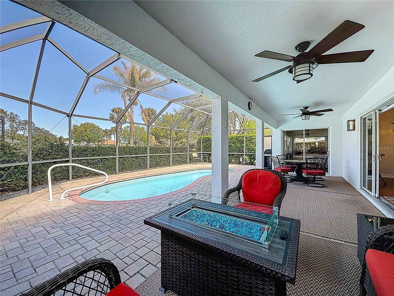 No bond! This beautifully expanded Gardenia model (2,291 sq. ft.) offers exceptional living with a propane stone fireplace and a spacious birdcage featuring a heated pool overlooking the Tierra Del Sol Golf Course. Being offered fully turnkey with great furniture, this home includes 3 bedrooms, 2 bathrooms, and a versatile bonus room that can serve as a den, office, or additional bedroom. The kitchen is thoughtfully designed with ceramic tile flooring, quartz countertops, top-of-the-line Samsung appliances, and elegant lighting above and below the cabinetry, along with convenient pull-out drawers. A separate laundry room includes a top of the line Samsung washer and dryer, complemented by custom built-in cabinetry. Both bathrooms feature updated ceramic tile flooring, tiled showers, and modern fixtures. Throughout the home, you’ll find high-grade laminate and ceramic tile flooring—no carpet—along with three strategically placed solar tubes that enhance natural light. The spacious primary suite includes a sliding door to the lanai and pool area, as well as walk-in closets with custom cabinetry and shelving. Additional upgrades include plantation shutters on all windows, new lighting and ceiling fans, and crown molding throughout the entire home—including the bathrooms. At the lanai entry, Hunter Douglas Silhouette shades are installed, with a motorized center shade and transferable warranty. The property also features a large two-car garage plus a separate golf cart garage, an epoxied garage floor, and built-in cabinetry. Situated on an oversized, professionally landscaped corner lot, the home showcases beautiful palm trees, decorative lighting on three sides, and an underground gutter drainage system. Major updates include a new A/C system in 2025 and a roof replacement in 2020. Ideally located near both Spanish Springs and Sumter Landing town squares, you’ll also enjoy close proximity to six quality golf courses, major shopping areas, great dining, first class medical centers, and The Villages Hospital—all easily accessible by golf cart. This home presents a fantastic opportunity at an outstanding value!!!!