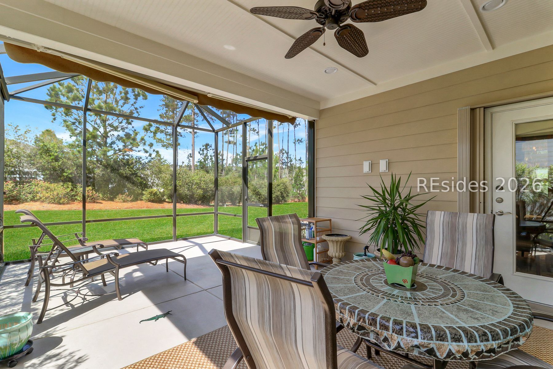 Welcome to easy, elegant Lowcountry living in the highly sought-after Sun City Hilton Head - where every day feels like a getaway. This beautifully maintained, newer 3-bedroom 2-bath (with added office) Summerwood model home reflects true pride of ownership and offers the perfect blend of comfort, style, and low-maintenance living. The open-concept layout creates a seamless flow between the white/bright kitchen and living/dining spaces, making it easy to host family and friends or simply enjoy a quiet evening at home. The spacious primary suite is a peaceful retreat featuring a large primary bath with separate shower and tub. Outside, the large covered porch, complete with a screened lanai and retractable awning, invites you to relax year-round-whether you're sipping coffee in the morning or enjoying the serene, landscaped backyard in the evening. Added hurricane and lightning protection. As a resident of Sun City Hilton Head, you'll enjoy a vibrant, resort-style lifestyle with access to championship golf, multiple pools, state-of-the-art fitness centers, walking trails, and a full calendar of social activities.