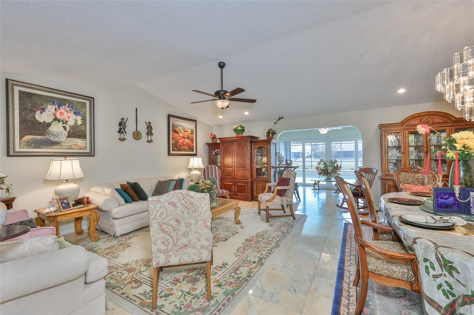 WOW! This POOL home with SPA features breathtaking WATER views. Located on a quiet CUL-DE-SAC in the popular neighborhood of Caloosa Country Club Estates, this well maintained 3/2.5 home is on a larger lot and includes a brick paver driveway, manicured lawn and HURRICANE SHUTTERS. LEAD GLASS double doors welcome you into the open, spacious Living & Dining Room area where you will be drawn to the awesome views of the POOL and LAKE. The very SPACIOUS Lanai/Pool area is perfect for parties and entertaining and has recently been all newly screened. The Florida Room allows you to enjoy the outside activity in air-conditioned comfort. An UPDATED KITCHEN with BREAKFAST BAR features an eat in area and includes newer stainless appliances, granite counters, 42” upgraded cabinets with pull out drawers and a generous pantry. The kitchen opens to a sizeable FAMILY room, waiting for entertaining guests, watching TV or just relaxing to read a book. The King (or Queen) sized Primary Bedroom has French doors that lead to the Pool area and include a WALK-IN CLOSET and an updated EN-SUITE bathroom. The guest bedroom also has a WALK IN Closet and updated bathroom that includes a tub w/shower. A good sized third bedroom, along with the Guest Bedroom and second bathroom can be closed off as a private suite for guests & their family. There is also a half bath. The 2 car garage has built in cabinets, a utility sink, a second refrigerator, a remote controlled garage screen and a workshop/craft room that is heated & cooled with fans. Roof & gutters (2024), HVAC (2016 & 2019-zoned w/ 2 systems), hot water tank (2023), dishwasher (2025), pool pump (2024) have all been replaced. Plumbing replaced 2020. Strategically located near Tampa, Sarasota & St Petersburg you'll have easy access to Tampa International Airport, World class Beaches, Professional Sporting events & Fine Dining. The Entertainment of Orlando is approximately 90 minutes away. This one of a kind home will delight the most discriminating buyer. Warm & Friendly neighbors. Don’t let this home get away from you. Make an appointment to view it TODAY!