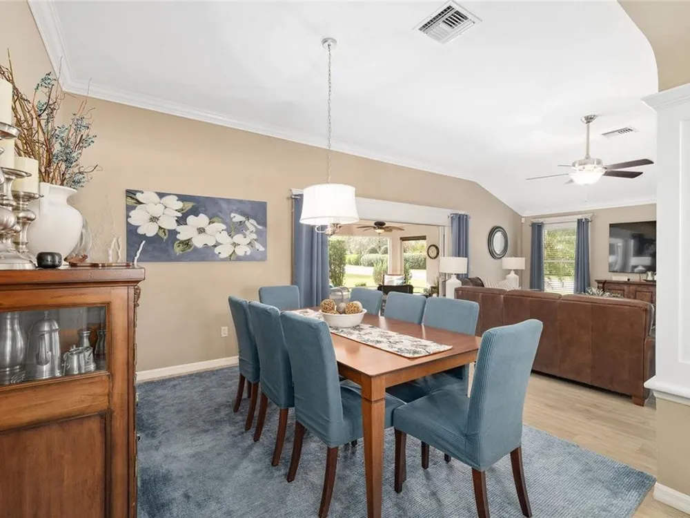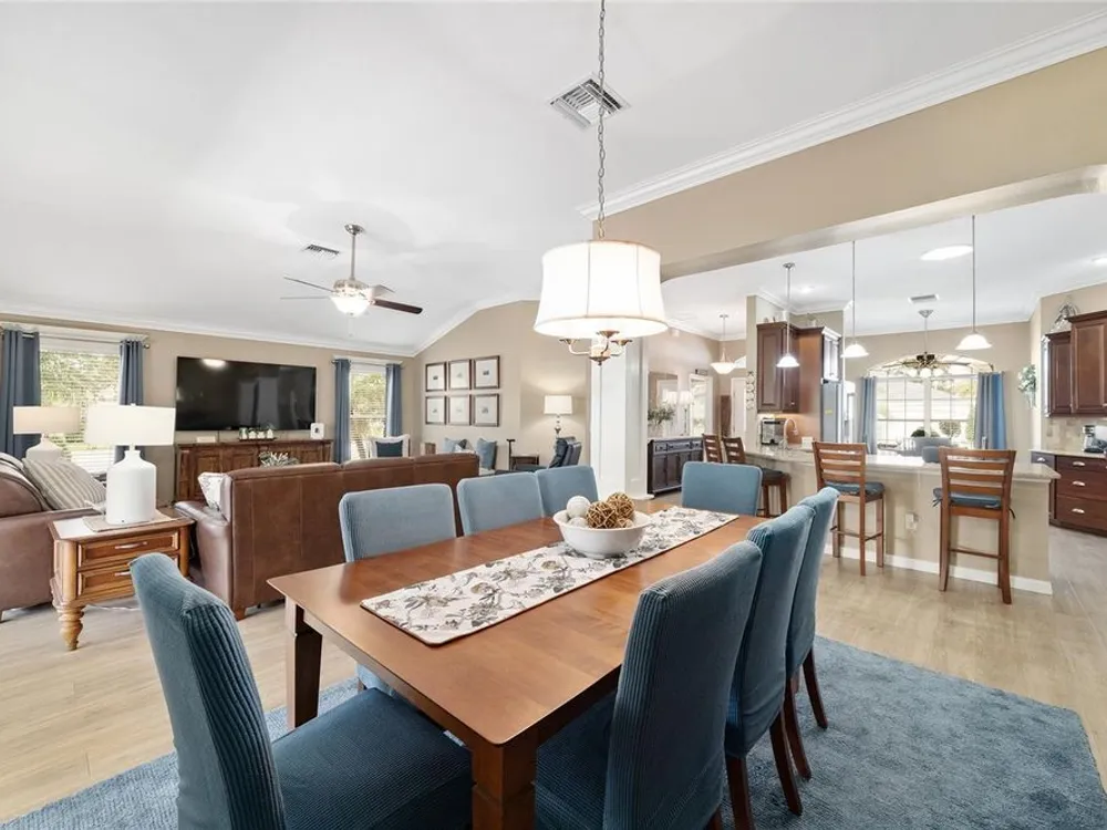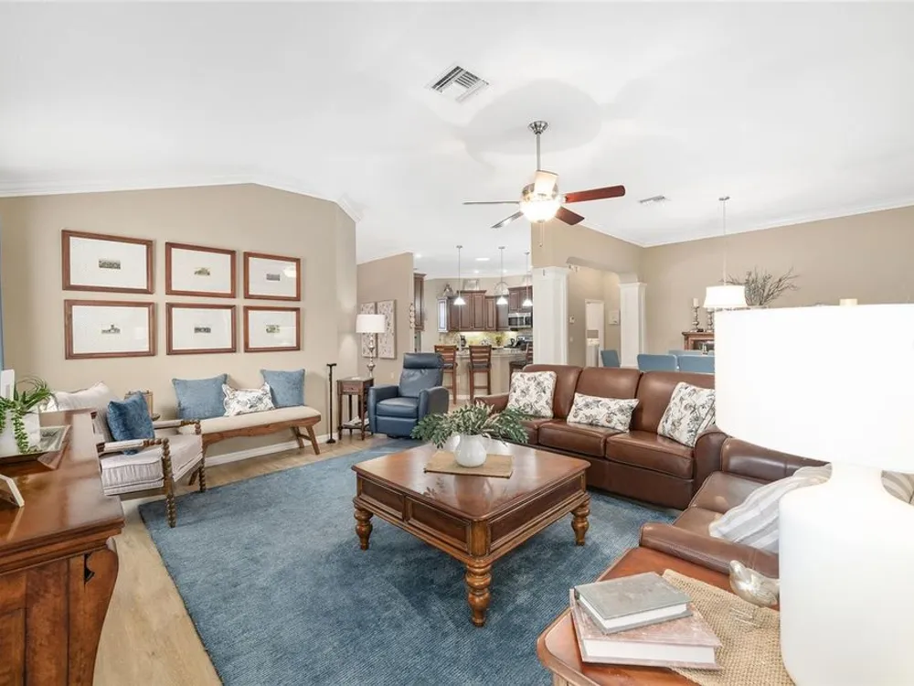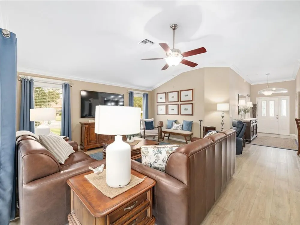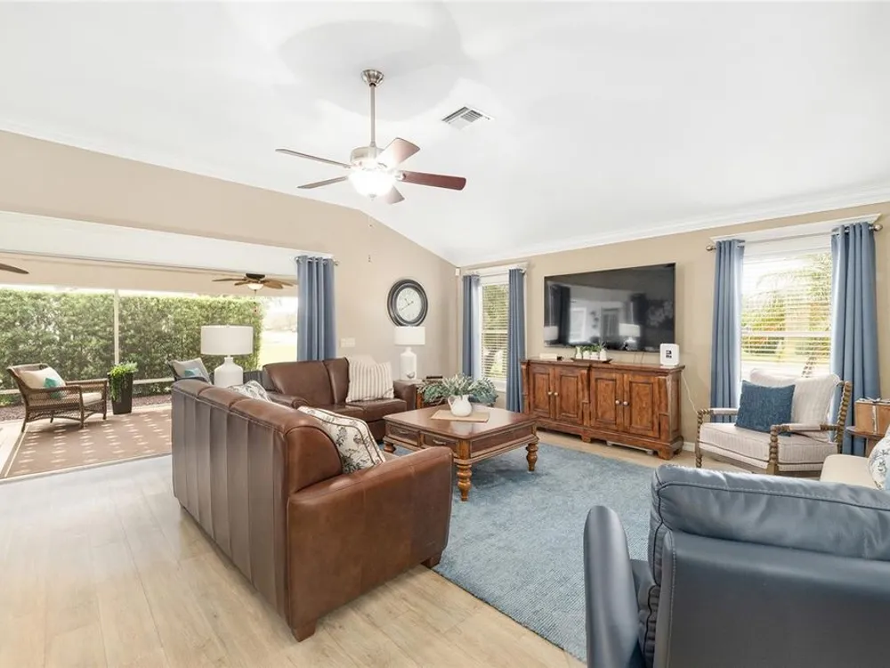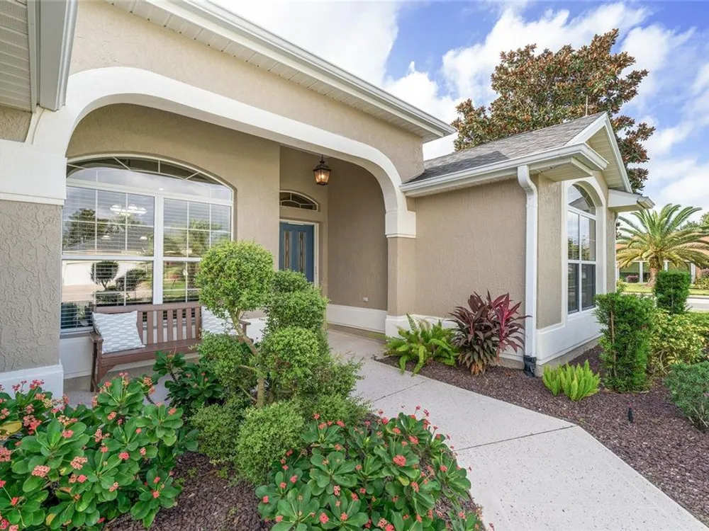 Pride of ownership shines throughout this beautifully maintained GARDENIA Designer home with a 2 CAR GARAGE AND GOLF CAR GARAGE on a corner site in the VILLAGE OF TALL TREES! From the moment you arrive, you’ll notice the inviting curb appeal with the lush landscaping. Inside, this open-concept floor plan offers both comfort and style with NO CARPET. The eat-in kitchen is spacious and features CUSTOM designed and stepped cabinetry, GRANITE countertops, and a generous breakfast bar — ideal for casual dining or entertaining. The kitchen opens to the adjacent LIVING and DINING areas, creating a warm and inviting space filled with natural light. CROWN MOLDING has been added throughout the entire home. The primary suite provides a relaxing retreat with its private bath, dual sinks, and dual walk-in closets. The guest rooms are thoughtfully positioned for privacy, making it perfect for hosting family or friends. You’ll love the expanded lanai, a wonderful spot to enjoy morning coffee, quiet afternoons, or evening gatherings — truly an extension of the living space and one of the highlights of this home. Solar tubes are located in the Kitchen, Primary and Guest Baths. Location matters — and this one is hard to beat! You’re just minutes away from golf courses, recreation centers, and everyday conveniences like Publix, Walmart, and COSTCO, as well as numerous restaurants and shopping options. The neighborhood (adult) pool and postal station are just a short three-minute walk from your front door. The BOND IS PAID! ROOF replaced in 2020! Water Heater replaced in 2021. If you've been searching for a home that has been lovingly cared for, ideally located, and move-in ready — this is it! Experience the perfect combination of comfort, style, and convenience in one of Community's most established and desirable neighborhoods — The Village of Tall Trees!