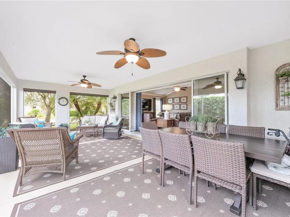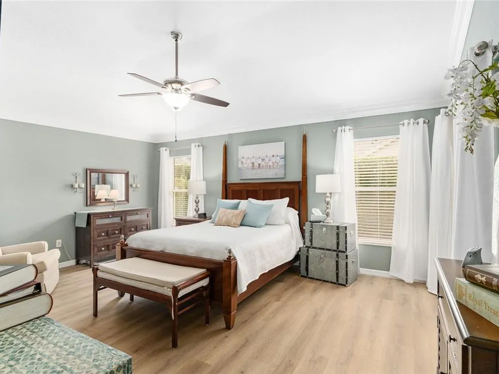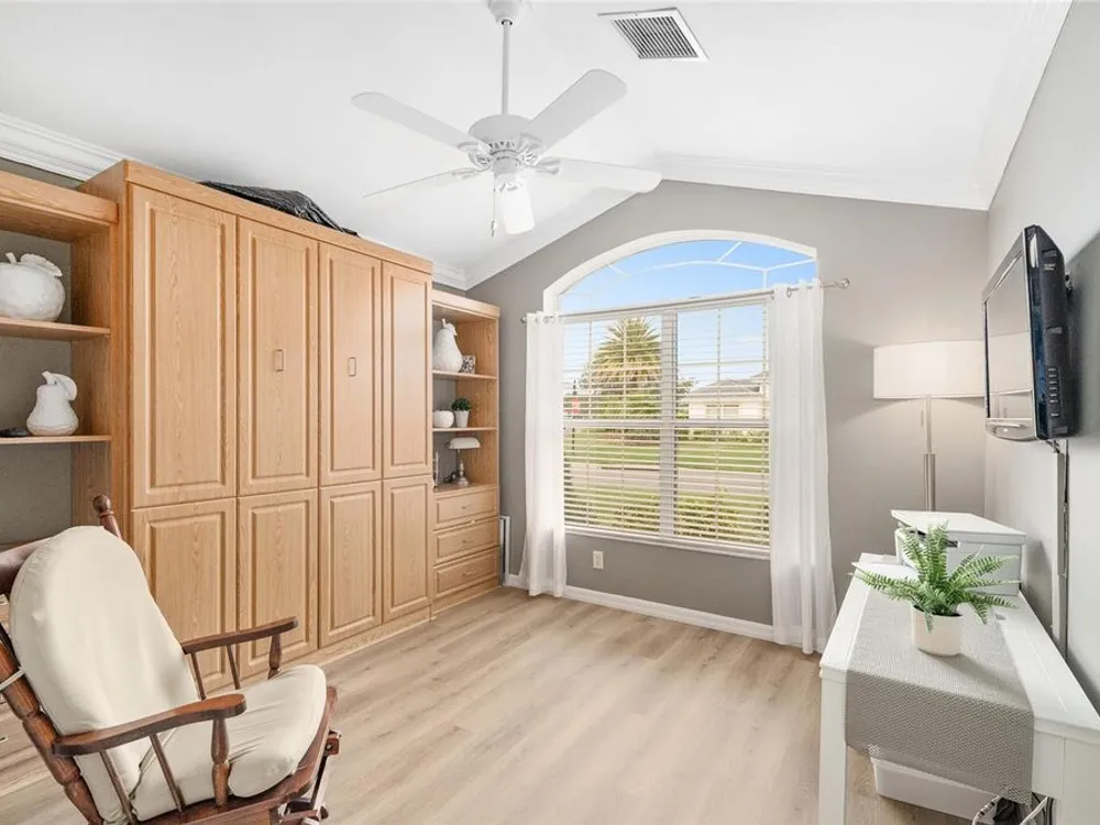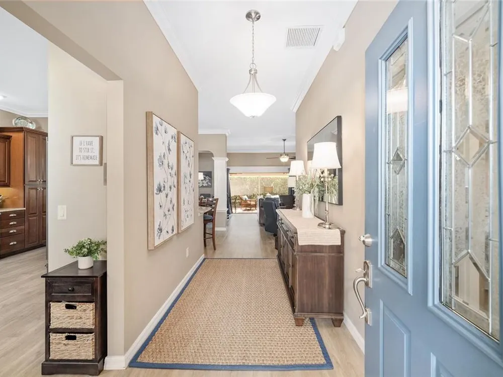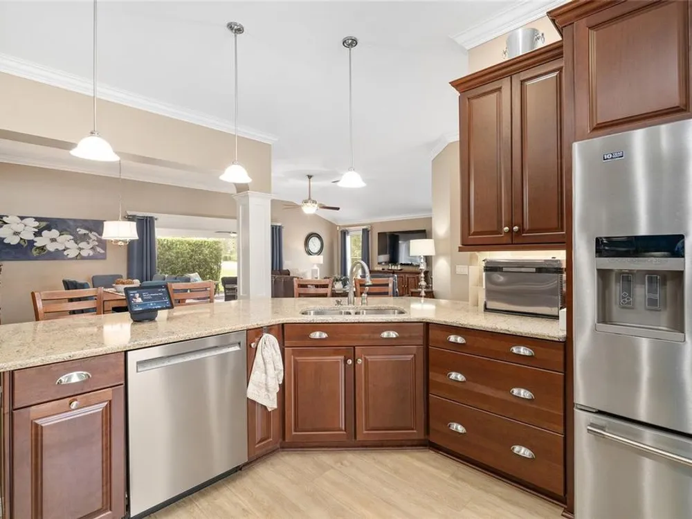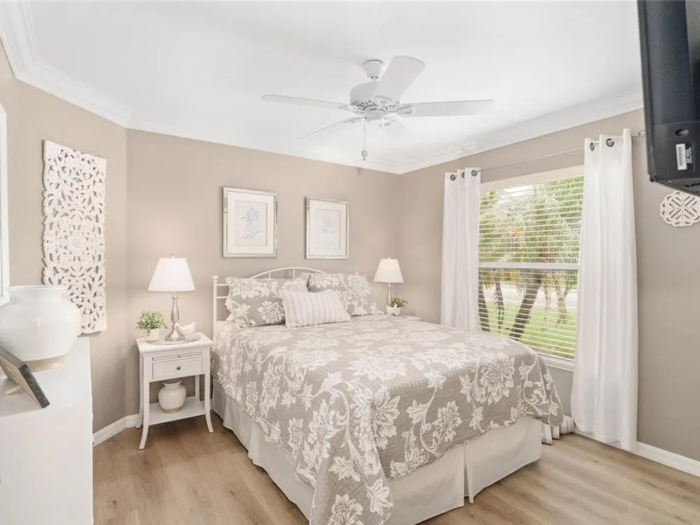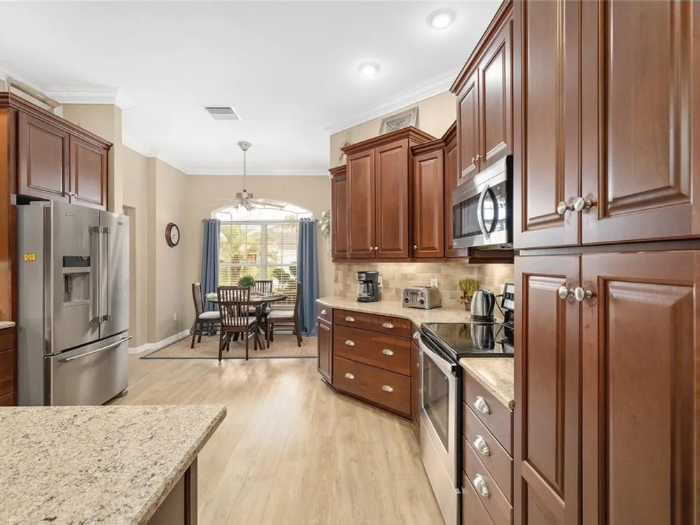 Pride of ownership shines throughout this beautifully maintained GARDENIA Designer home with a 2 CAR GARAGE AND GOLF CAR GARAGE on a corner site in the VILLAGE OF TALL TREES! From the moment you arrive, you’ll notice the inviting curb appeal with the lush landscaping. Inside, this open-concept floor plan offers both comfort and style with NO CARPET. The eat-in kitchen is spacious and features CUSTOM designed and stepped cabinetry, GRANITE countertops, and a generous breakfast bar — ideal for casual dining or entertaining. The kitchen opens to the adjacent LIVING and DINING areas, creating a warm and inviting space filled with natural light. CROWN MOLDING has been added throughout the entire home. The primary suite provides a relaxing retreat with its private bath, dual sinks, and dual walk-in closets. The guest rooms are thoughtfully positioned for privacy, making it perfect for hosting family or friends. You’ll love the expanded lanai, a wonderful spot to enjoy morning coffee, quiet afternoons, or evening gatherings — truly an extension of the living space and one of the highlights of this home. Solar tubes are located in the Kitchen, Primary and Guest Baths. Location matters — and this one is hard to beat! You’re just minutes away from golf courses, recreation centers, and everyday conveniences like Publix, Walmart, and COSTCO, as well as numerous restaurants and shopping options. The neighborhood (adult) pool and postal station are just a short three-minute walk from your front door. The BOND IS PAID! ROOF replaced in 2020! Water Heater replaced in 2021. If you've been searching for a home that has been lovingly cared for, ideally located, and move-in ready — this is it! Experience the perfect combination of comfort, style, and convenience in one of Community's most established and desirable neighborhoods — The Village of Tall Trees!