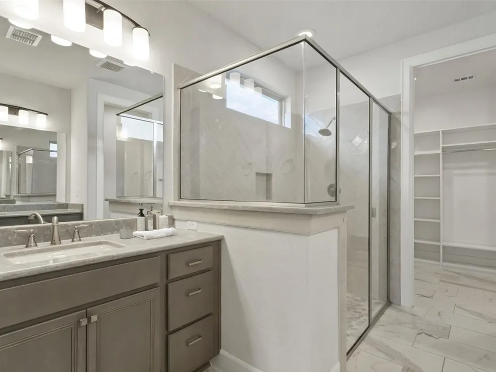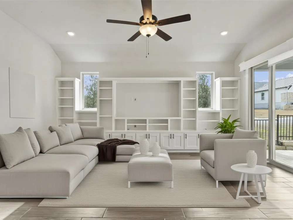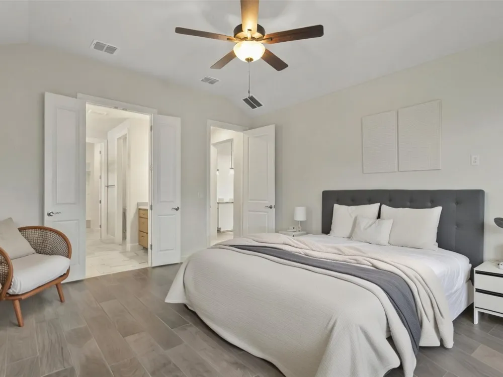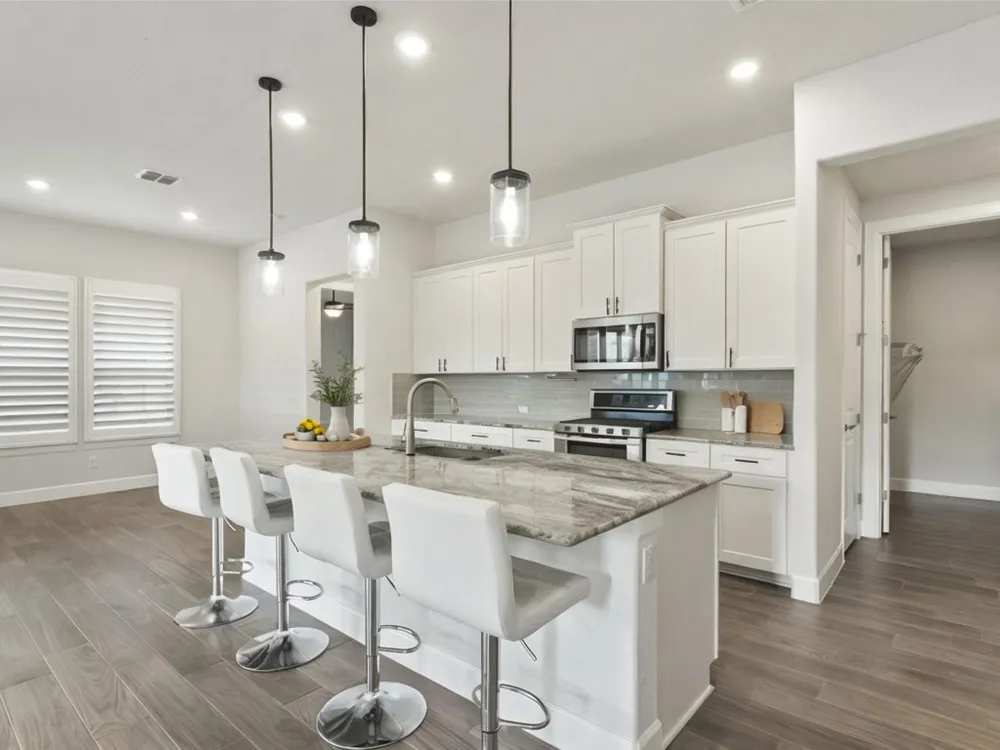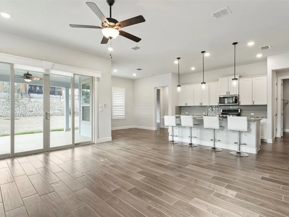 - Breakfast Bar, Ceiling Fan(s), Double Vanity, Eat-in Kitchen, High Ceilings, Kitchen Island, Main Level Primary, Open Floorplan, Stone Counters, Vaulted Ceiling(s), Walk-In Closet(s)