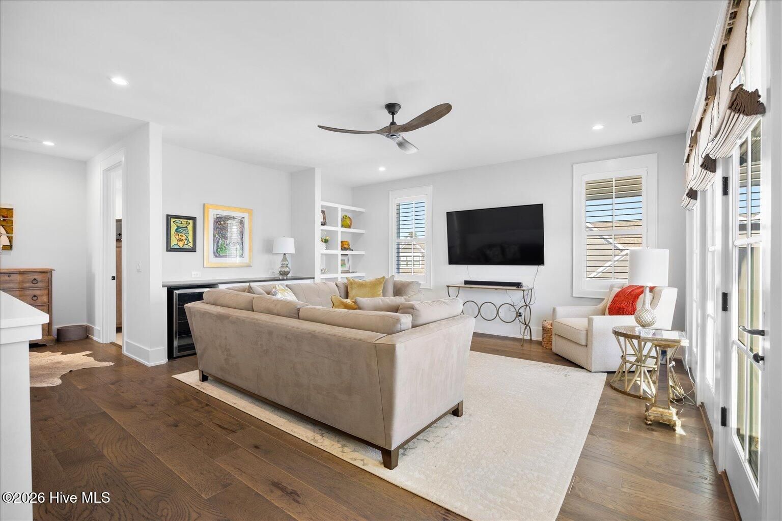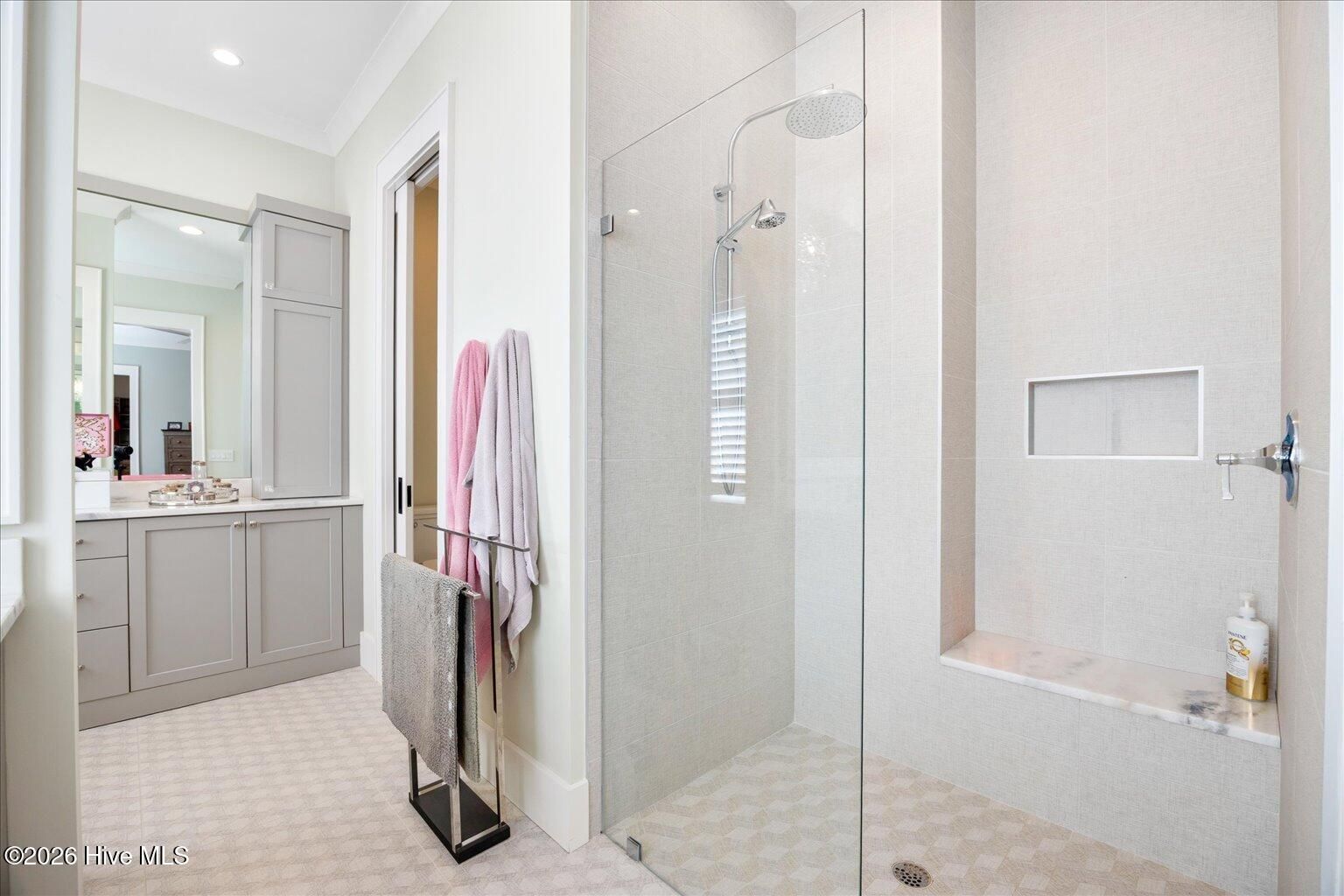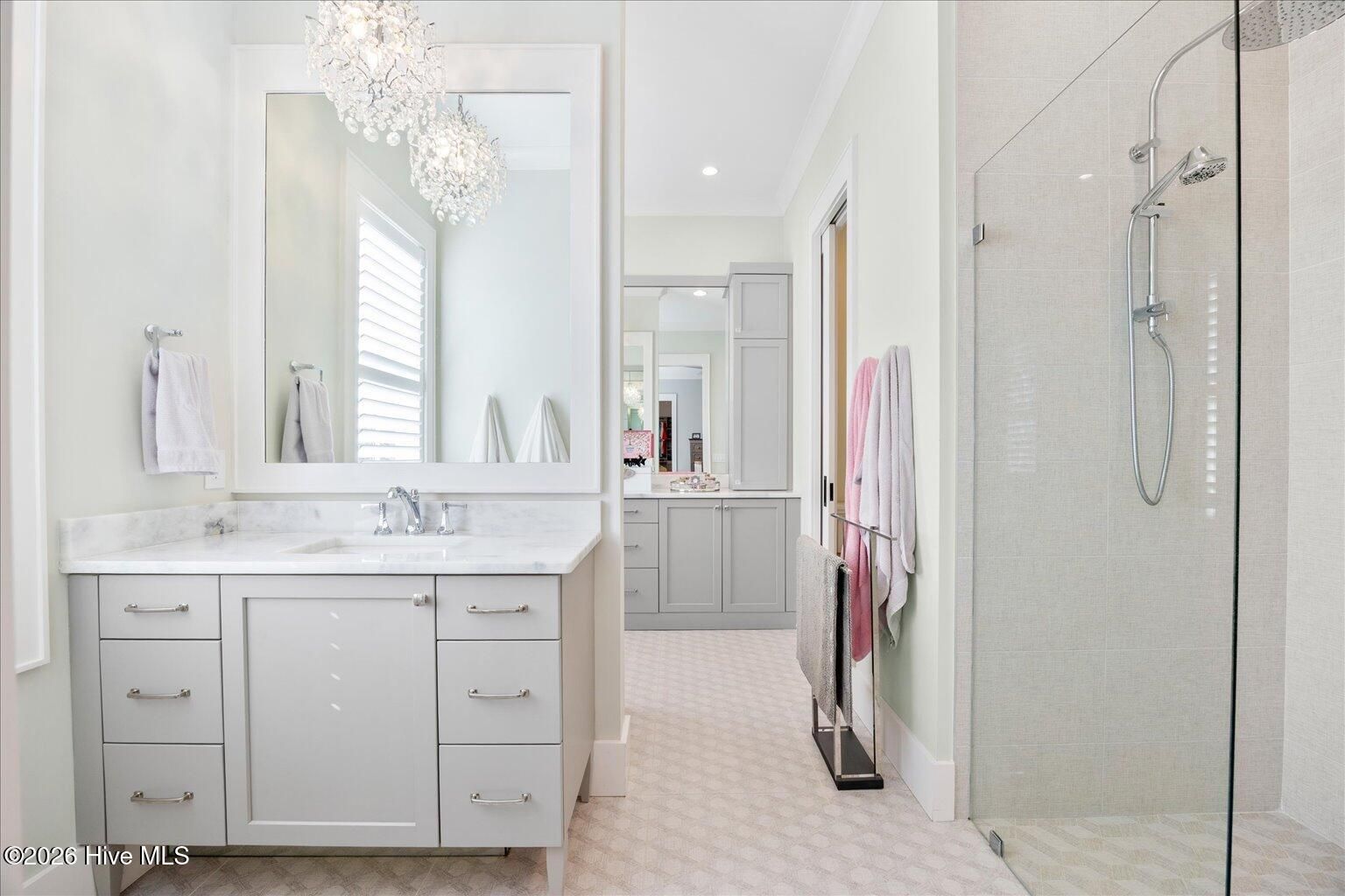 - Master Downstairs, Walk-In Closet(s), High Ceilings, Entrance Foyer, Mud Room, Bookcases, Kitchen Island, Ceiling Fan(s), Pantry, Walk-In Shower, Blinds