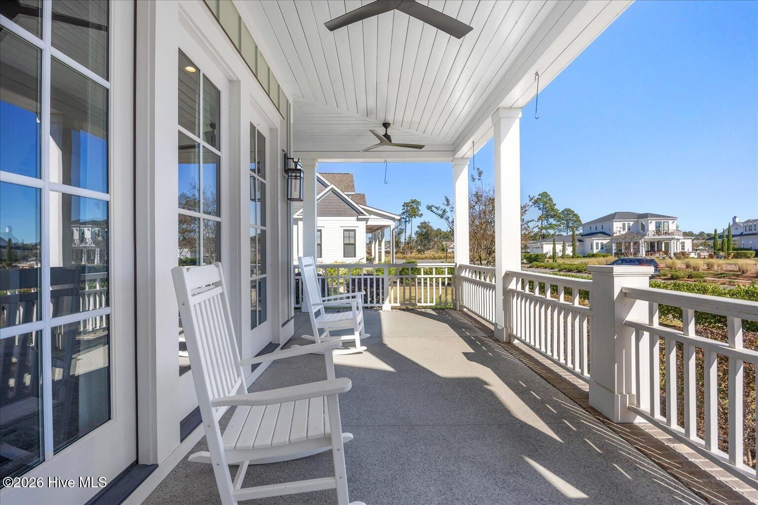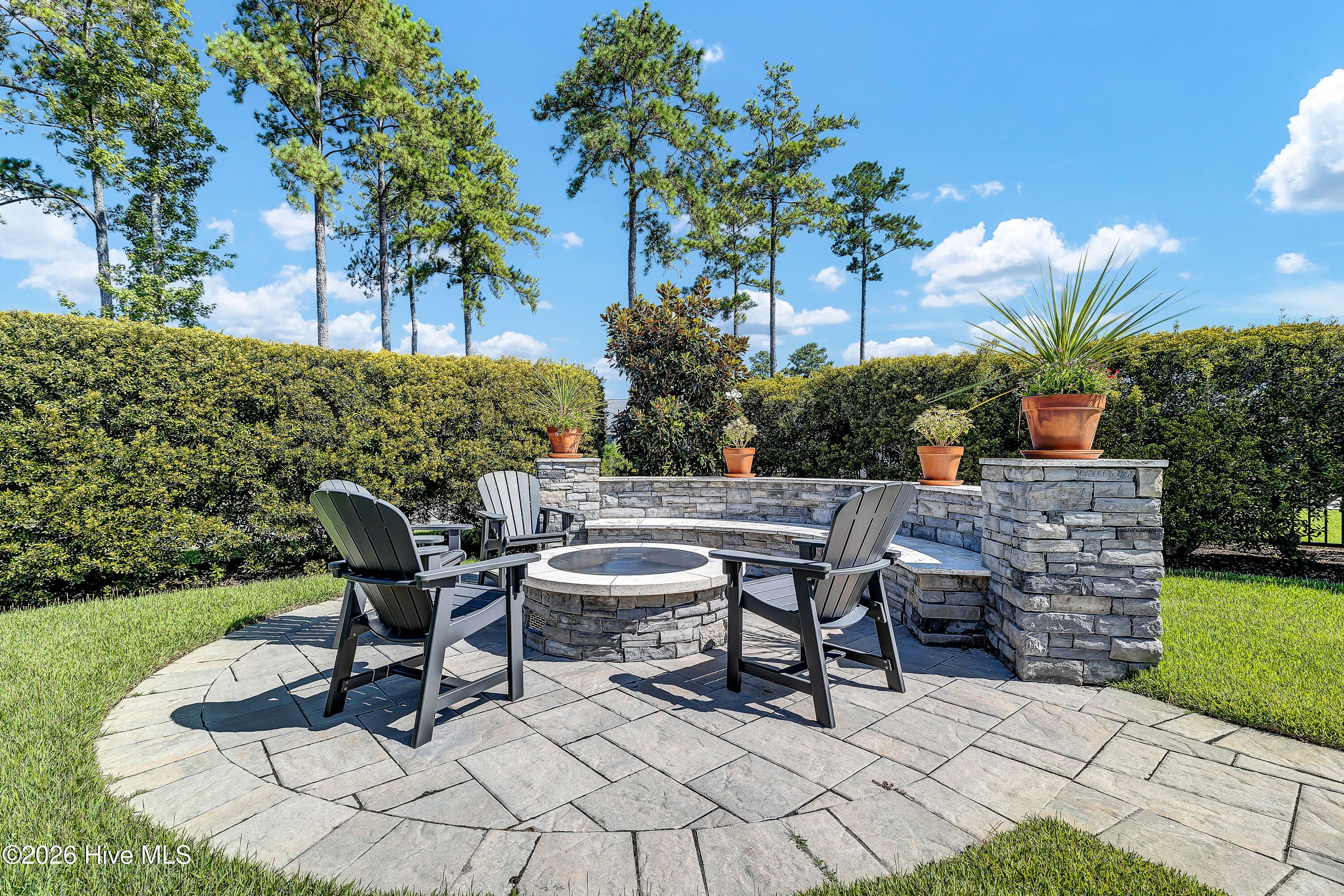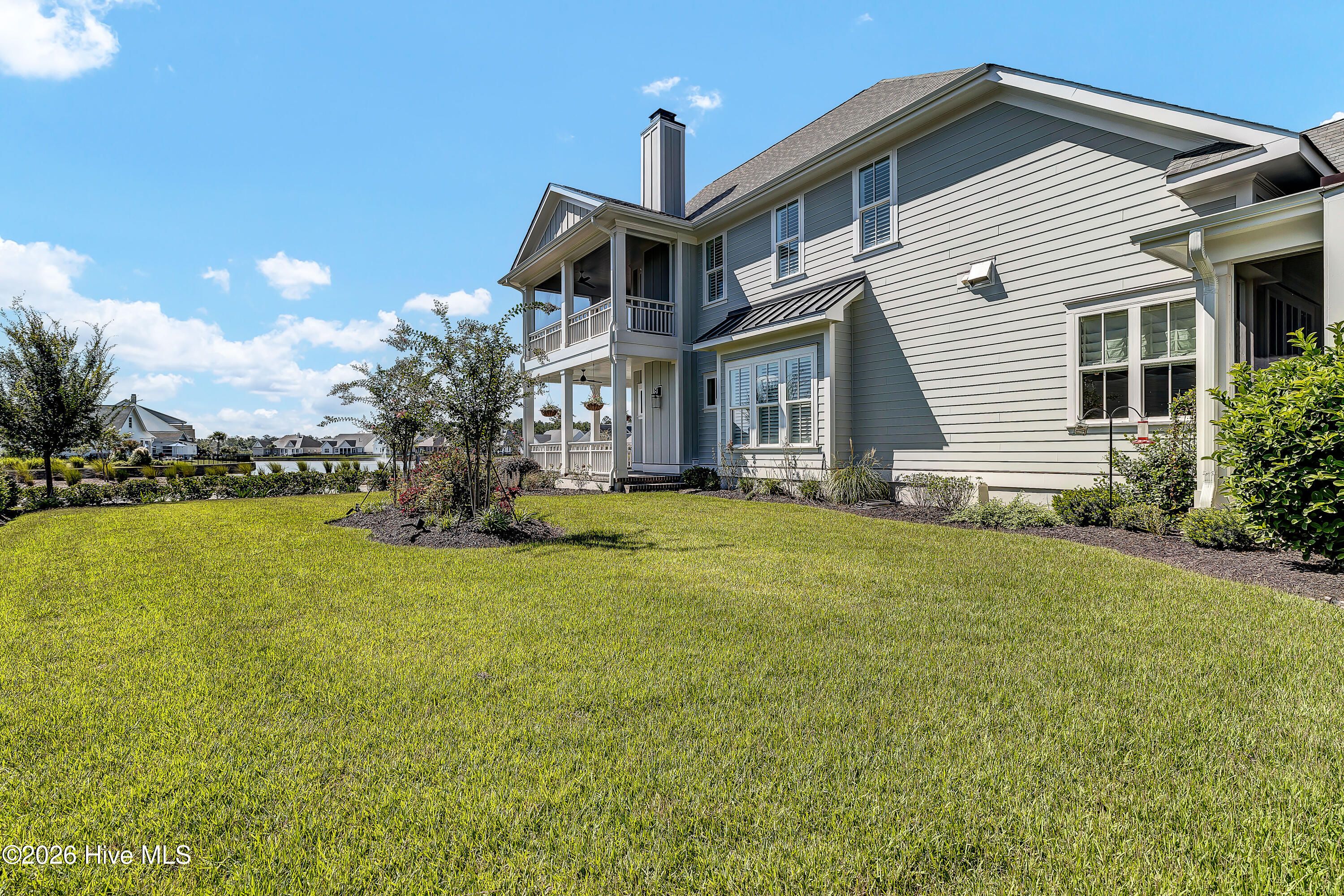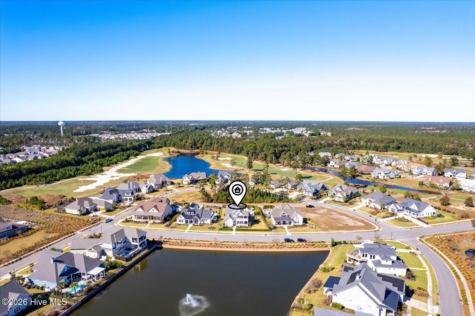 Welcome to 2110 Colony Pines Drive, a custom-built coastal farmhouse located in Brunswick Forest within the prestigious Cape Fear National community. Built by PBC Design + Build, this exceptional home offers unobstructed water views, refined craftsmanship, and thoughtfully designed indoor-outdoor living spaces throughout. The open-concept main level features wide-plank rustic wood flooring, soaring ceilings with decorative beam accents, custom lighting, and abundant natural light. The gourmet kitchen showcases marble countertops, a large center island, upscale white cabinetry, and stainless steel appliances including a gas stove. The kitchen flows seamlessly into the dining area and great room, anchored by a fireplace with built-in cabinetry and expansive water views. The private primary suite is located on the main level and offers a spa-inspired bath with marble counters, custom tilework, a large glass-enclosed shower, and two generous walk-in closets with convenient access to the laundry room. A first-floor guest bedroom provides flexible single-level living. Upstairs, you'll find two additional bedrooms, a full bath, a dedicated office space, and a second living area, all opening to sweeping covered porches with panoramic water vistas. Outdoor living is a true highlight, with Charleston-style wrap-around covered porches on both levels, screened porch with fireplace, a custom outdoor kitchen with grill and griddle, and a stone firepit seating area—perfectly positioned within a professionally landscaped yard. An alley-load two-car garage and decorative driveway complete the home. Brunswick Forest offers resort-style amenities including 3 fitness centers, 4 pools, tennis and pickleball courts, walking and biking trails, and the Villages Town Center with shopping, dining, and medical services. Ideally located just minutes from Wilmington, and beaches, this home delivers exceptional quality, views, and lifestyle in one of the area's most sought-after communities.