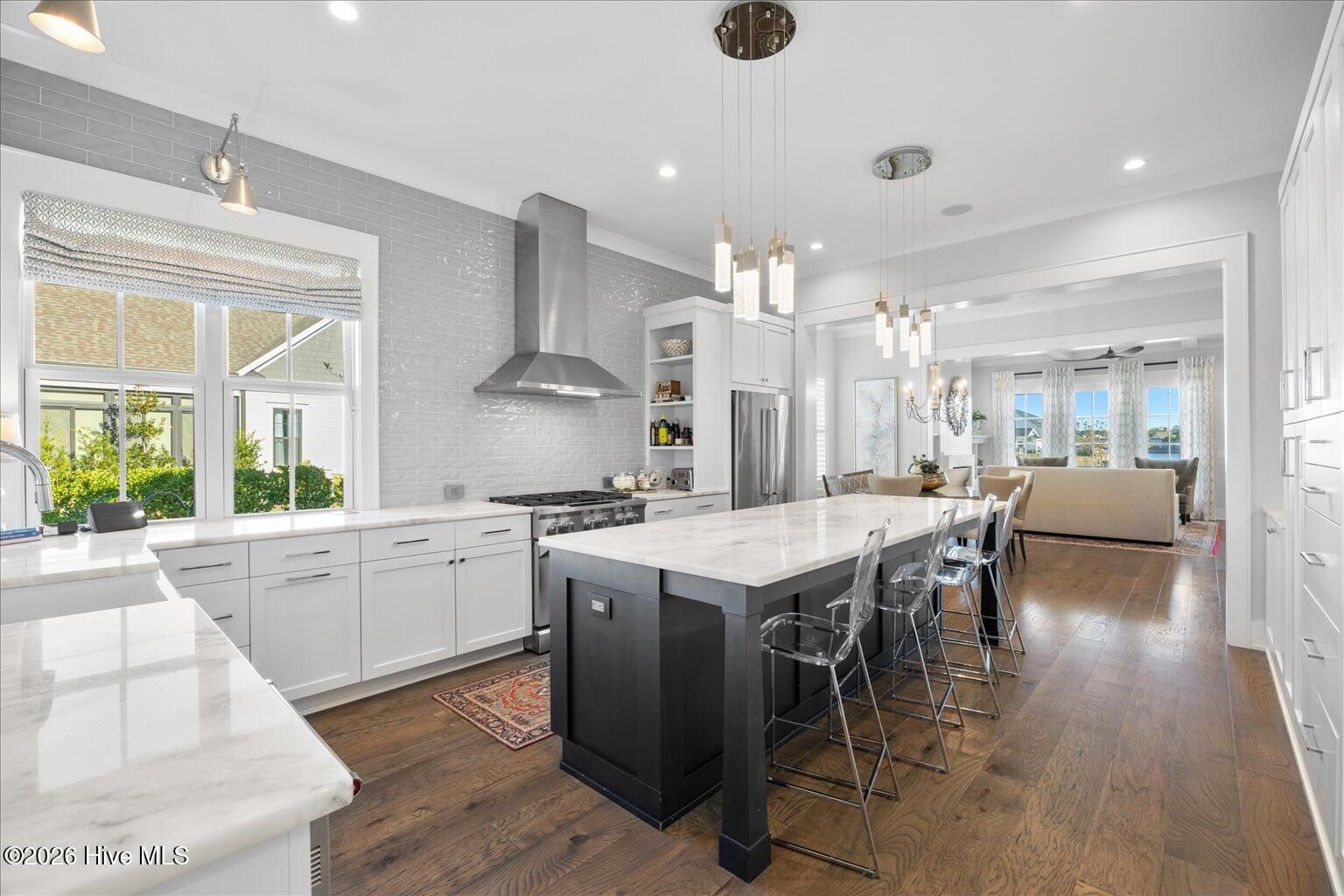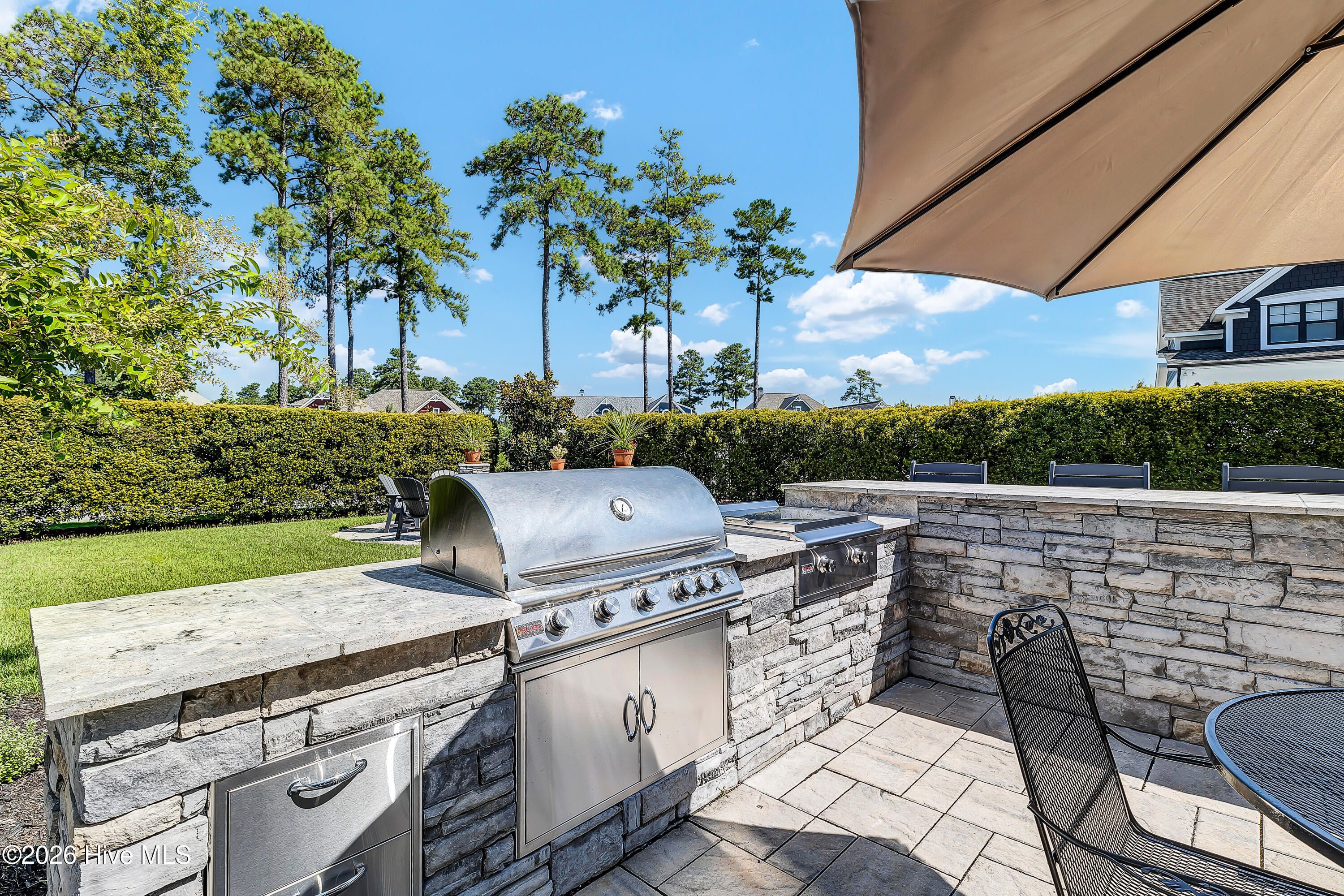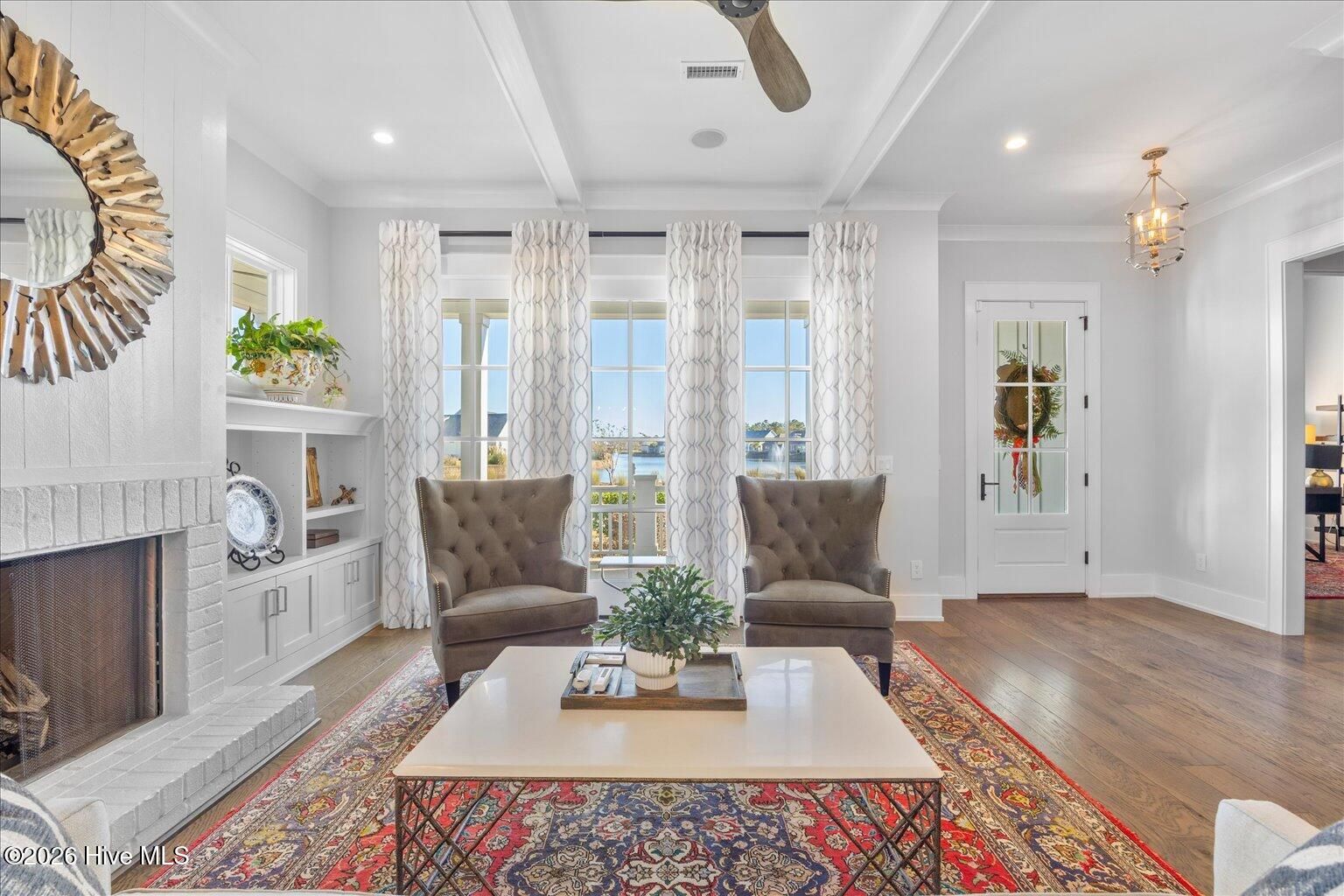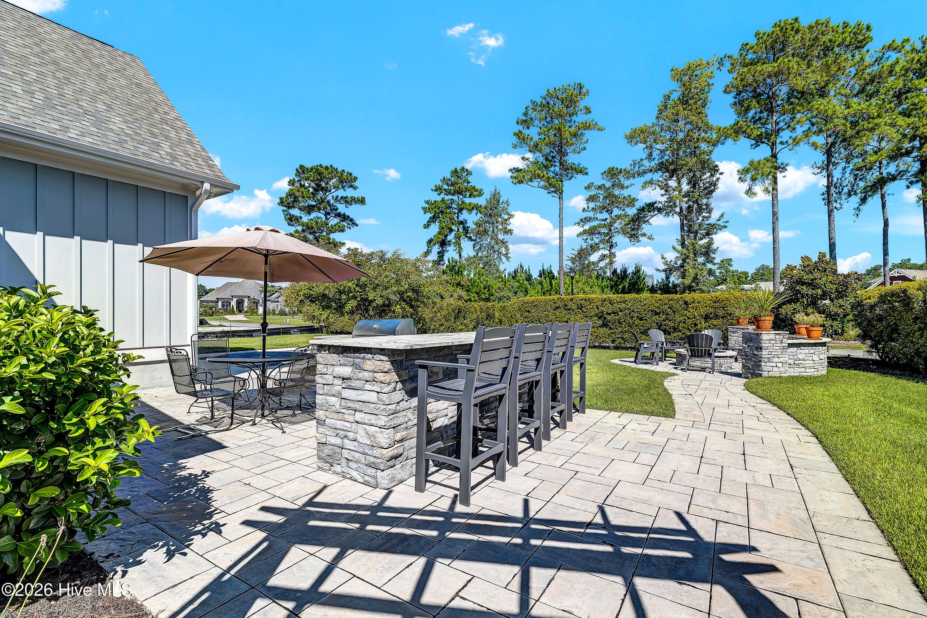 Welcome to 2110 Colony Pines Drive, a custom-built coastal farmhouse located in Brunswick Forest within the prestigious Cape Fear National community. Built by PBC Design + Build, this exceptional home offers unobstructed water views, refined craftsmanship, and thoughtfully designed indoor-outdoor living spaces throughout. The open-concept main level features wide-plank rustic wood flooring, soaring ceilings with decorative beam accents, custom lighting, and abundant natural light. The gourmet kitchen showcases marble countertops, a large center island, upscale white cabinetry, and stainless steel appliances including a gas stove. The kitchen flows seamlessly into the dining area and great room, anchored by a fireplace with built-in cabinetry and expansive water views. The private primary suite is located on the main level and offers a spa-inspired bath with marble counters, custom tilework, a large glass-enclosed shower, and two generous walk-in closets with convenient access to the laundry room. A first-floor guest bedroom provides flexible single-level living. Upstairs, you'll find two additional bedrooms, a full bath, a dedicated office space, and a second living area, all opening to sweeping covered porches with panoramic water vistas. Outdoor living is a true highlight, with Charleston-style wrap-around covered porches on both levels, screened porch with fireplace, a custom outdoor kitchen with grill and griddle, and a stone firepit seating area—perfectly positioned within a professionally landscaped yard. An alley-load two-car garage and decorative driveway complete the home. Brunswick Forest offers resort-style amenities including 3 fitness centers, 4 pools, tennis and pickleball courts, walking and biking trails, and the Villages Town Center with shopping, dining, and medical services. Ideally located just minutes from Wilmington, and beaches, this home delivers exceptional quality, views, and lifestyle in one of the area's most sought-after communities.