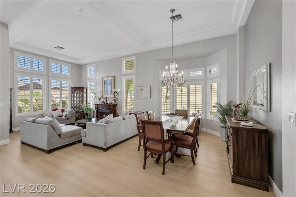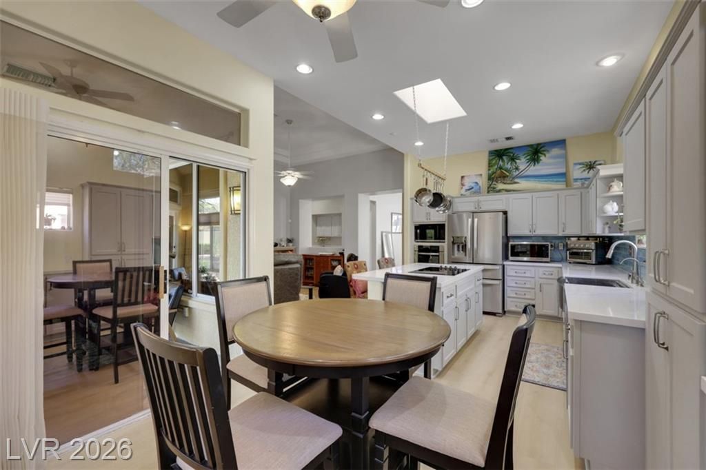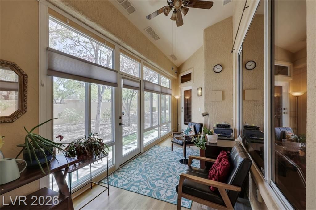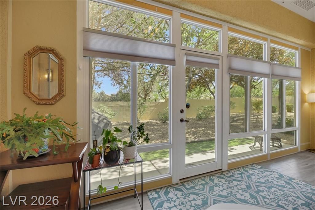 SOLAR PANELS OWNED! LARGE 2 CAR PLUS GOLF CART GARAGE! Live & Play in Prestigious Sun City Summerlin….Prime Location steps from Golf Course &Clubhouse! Updated Home Features Breathtaking Mountain Views from Inside or Out with Gated Courtyard. Large Windows w/Shutters & Shades allow for Stunning Views & Natural Light. Enjoy High 12 Foot Ceilings &Spacious 1,900 SqFt w/2 Beds PLUS Sunroom/Office,2 Bath,2 Car +GOLF Garage! Fully Renovated Gourmet Chef's Kitchen featuring NEW cabinets, NEW quartz counters, Larger Island & NEW S/S Appliances All Included! NEW LVP Flooring Blends Elegance & Charm Throughout. Master Suite w/Custom Closet Built-Ins, Ceiling Fan/Light Fixture, Glass Door Entry to Scenic SunRoom. Garage w/ B/I Storage, EV Charger, NEW Water Heater, NEW Softener & Pristine Epoxy Floors. SOLAR PANELS OWNED! This Stunning Home Embodies the Best of Summerlin Living. Low Maintenance and Close to Shopping, Freeways & More! Call Today. LANDSCAPE & EXTERIOR MAINTENANCE INCLUDED IN HOA.