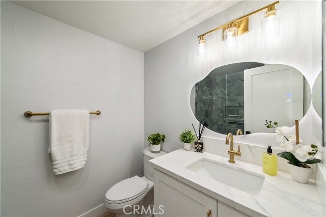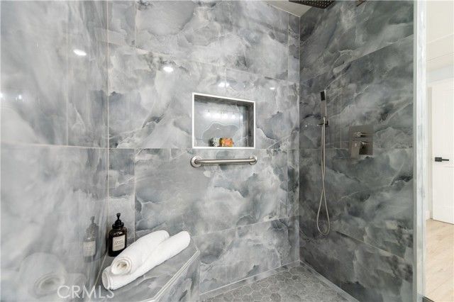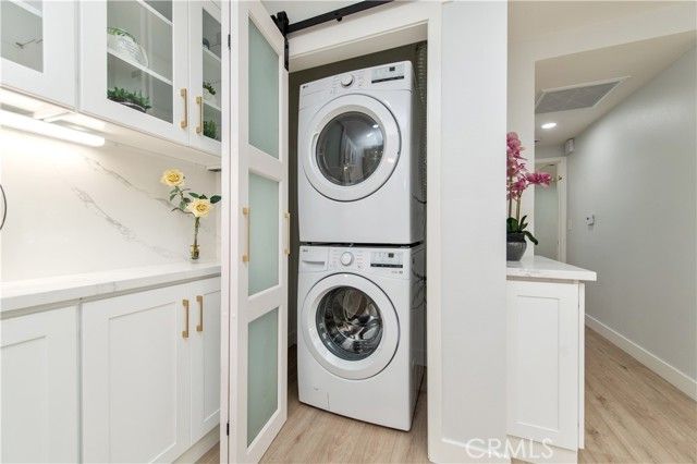 Step into a beautifully reimagined Casa Linda residence where every detail has been thoughtfully curated to create an atmosphere of comfort, function, and modern elegance. The moment you enter, the home unfolds into an open, light-filled living space anchored by a striking chef-inspired kitchen—an impressive gathering point with its expansive island, sleek quartz surfaces, and custom cabinetry accented in warm gold tones. Just beyond, the living room invites relaxation with soft natural light from overhead skylights, an architectural beam adding character, and a contemporary fireplace framed by built-ins. Large sliding doors draw you toward a peaceful covered balcony, extending the living space and offering a serene spot to unwind. A subtle reconfiguration of the floor plan enhances privacy between the two bedrooms, creating a thoughtful separation ideal for guests. Both bathrooms feel spa-like, showcasing refined finishes, generous walk-in showers with bench seating, and elegant lighting that elevates the everyday routine. The primary suite serves as a restful retreat with its custom-organized closet and modern sliding doors that blend seamlessly into the home’s clean, updated aesthetic. Throughout the residence, careful upgrades—smooth ceilings, double-pane windows, luxury vinyl plank flooring, new interior doors, recessed lighting, and central air—contribute to a fresh, cohesive environment. A discreet barn door reveals a full-size laundry area, maximizing both style and efficiency. With no stairs to navigate and a carport conveniently located on the same level, this home offers ease of living in one of Laguna Woods Village’s most desirable locations.