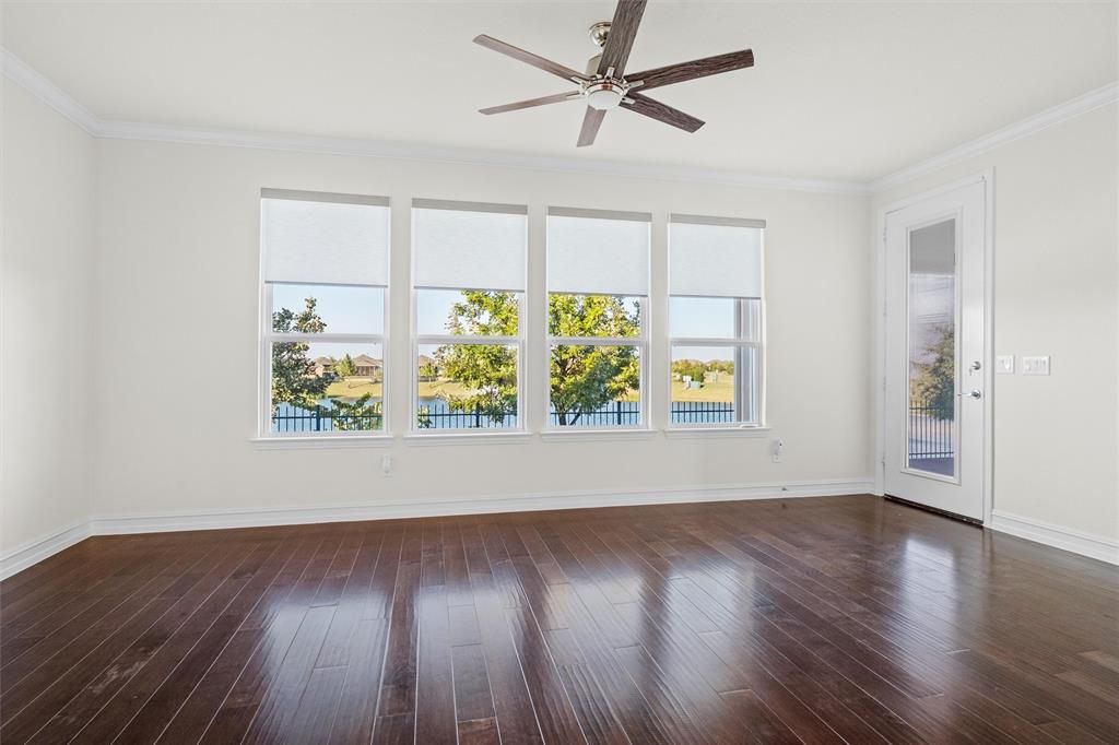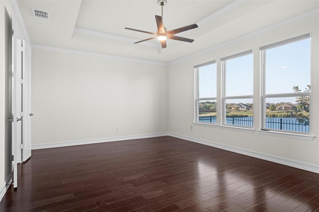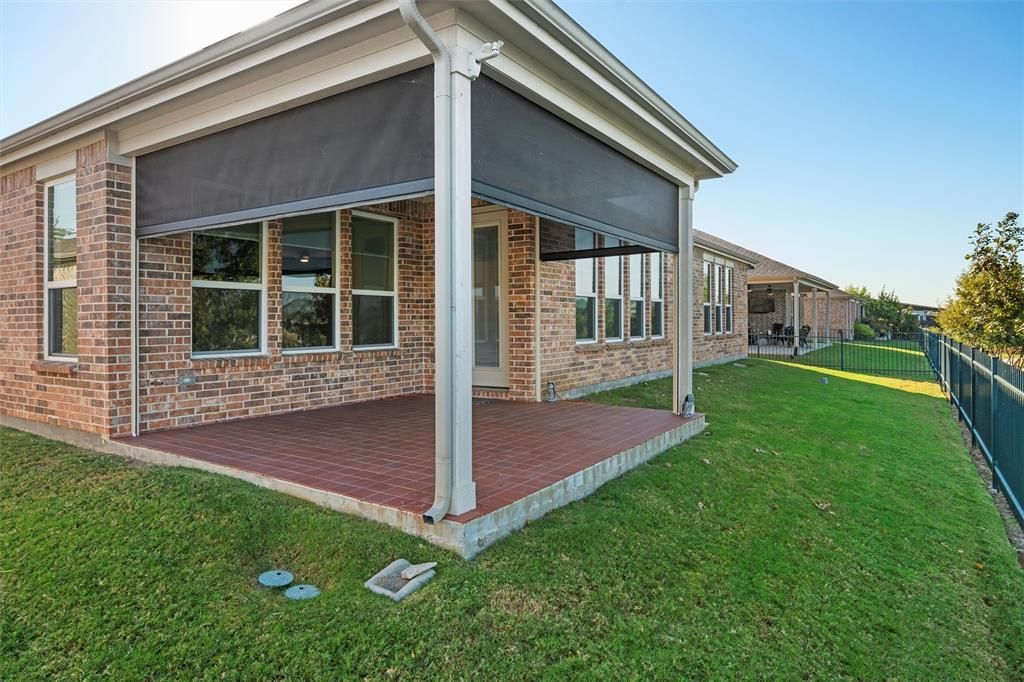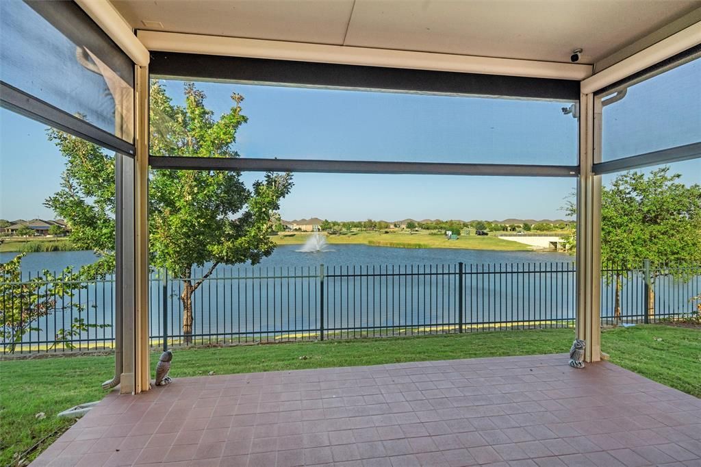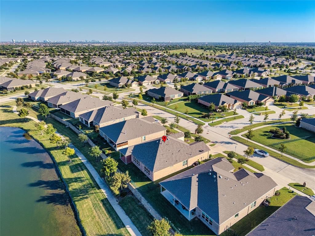Experience elevated living in the prestigious 55+ Frisco Lakes community with this stunning Magnolia Estate floor plan. This 2-bedroom, 2.5-bath luxury retreat offers breathtaking lake views from the kitchen, dining room, living room, sunroom, and primary suite. The open-concept layout features a spacious great room with a stone fireplace, seamlessly connected to the kitchen and dining area—perfect for entertaining or relaxing in style. The gourmet kitchen is thoughtfully designed with dual-height quartz countertops, a raised-height dishwasher, upgraded Whirlpool appliances, and soft-close drawers and cabinet doors. Elegant crown molding, 8 foot doors and doorways, and trey ceilings in both the living room and primary bedroom add architectural sophistication throughout. The expansive primary suite includes a spa inspired ensuite with a massive custom shower and a bonus room currently used as a second walk-in closet. A dedicated office with French doors provides a quiet workspace or hobby room. The extended garage features epoxy flooring and a 4 foot extension for added storage and convenience .Enjoy serene mornings and vibrant evenings on the extended back patio with tile flooring and power screens, or greet guests from the charming front patio with its brick-patterned floor. Plantation shutters in the front and power roller shades in the back ensure privacy while preserving unobstructed lake views.Frisco Lakes offers resort-style amenities including three amenity centers, scenic lakes, and miles of walking paths. This home is a rare opportunity to enjoy luxury, comfort, and community in one of Frisco’s most sought-after neighborhoods.