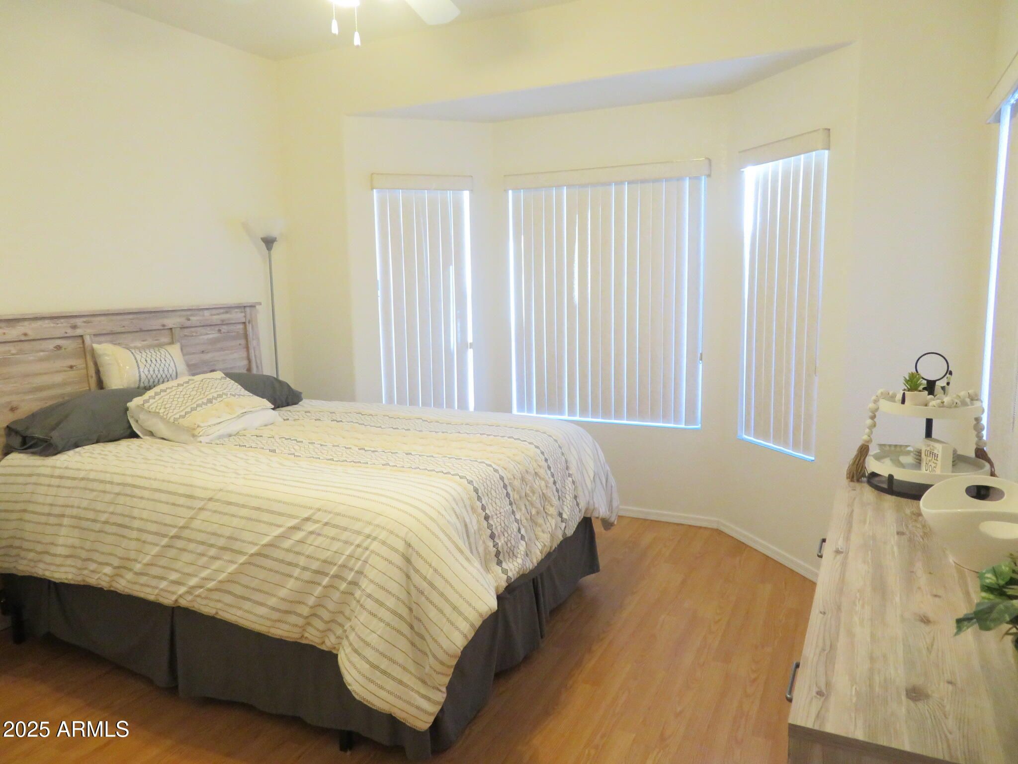 This expanded Brookhaven plan just might be what you've been looking for. This beautiful and upgraded home features a split 2 bedroom plan with 2 baths, a large living and dining space as well as a much larger primary bedroom. You'll find loads of tile with laminate in the 2 bedrooms. The home also sits on the wash so you have no one behind you and awesome views with a great patio to sit out and enjoy the wonderful Arizona weather. You'll also find a spacious laundry room and a 2 car attached garage that features a deep sink along with a water softener. The gated, age restricted community features 2 rec centers along with 2 pools, gathering space and exercise equipment. There are sidewalks all around to walk the community. You won't want to miss this one.