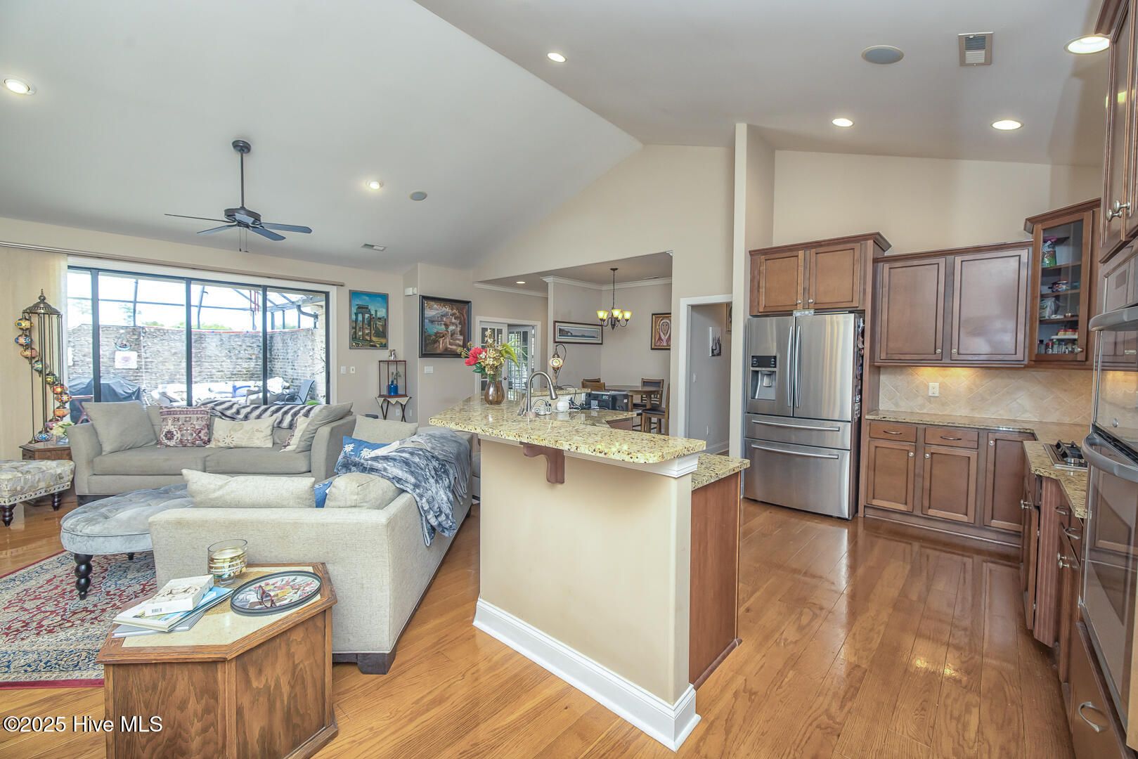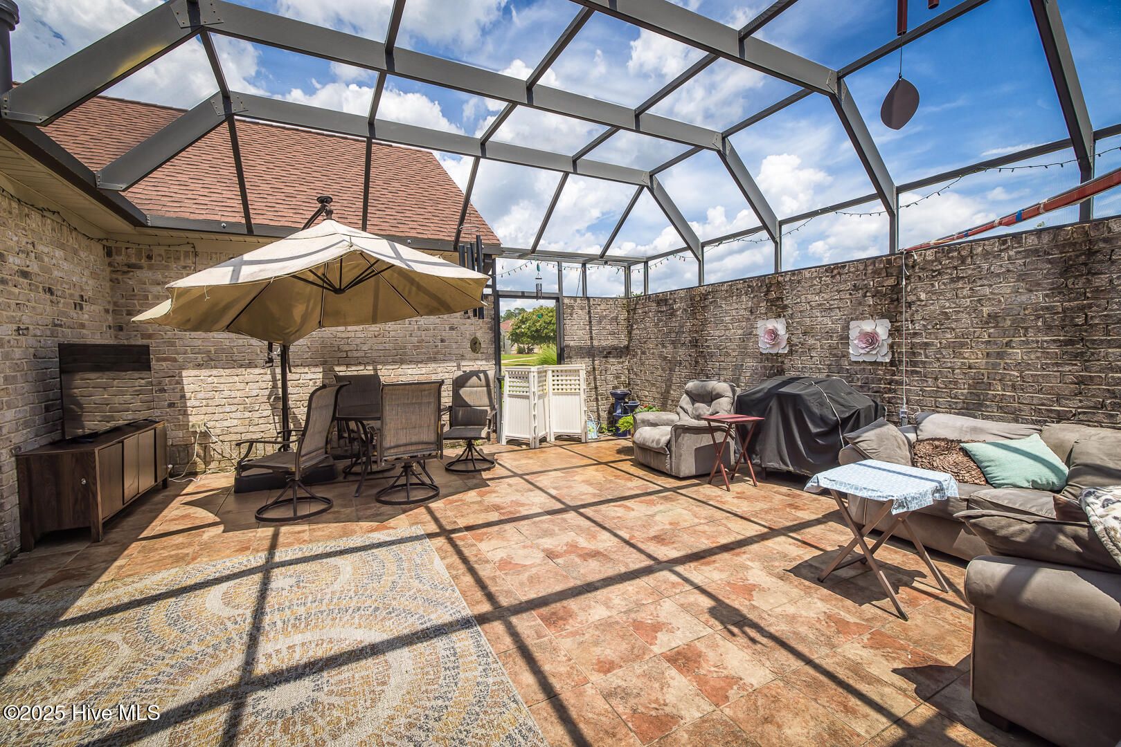 Welcome to effortless, single-level living in the highly sought-after Villamar at Brunswick Forest. This beautifully maintained home offers 3 bedrooms, 2.5 bathrooms, a private office, and an exceptional indoor-outdoor layout designed for both everyday comfort and entertaining. At the heart of the home, the open-concept kitchen, dining, and living areas flow seamlessly through telescoping glass doors to a private covered lanai, creating the perfect space to relax or host guests. Thoughtful upgrades include natural gas, a Rinnai tankless water heater, Jenn-Air gas cooktop, and a cozy gas fireplace. The chef's kitchen is equipped with granite countertops, a KitchenAid dishwasher, and a convenient hot water dispenser. The luxurious primary suite is a true retreat, featuring granite-topped dual vanities, a built-in makeup station, a spa-inspired tiled shower with dual shower-heads, and a spacious walk-in closet. Plantation shutters throughout the home add timeless elegance and charm. Just off the garage, you'll find two heated and cooled flex rooms (not included in the square footage), offering endless possibilities for a home gym, hobby space, second office, or guest overflow. As a resident of Brunswick Forest, enjoy resort-style amenities including championship golf, tennis and pickleball courts, multiple pools, a state-of-the-art fitness center, and miles of scenic walking trails. This is more than just a home—it's a lifestyle designed for comfort, convenience, and connection.