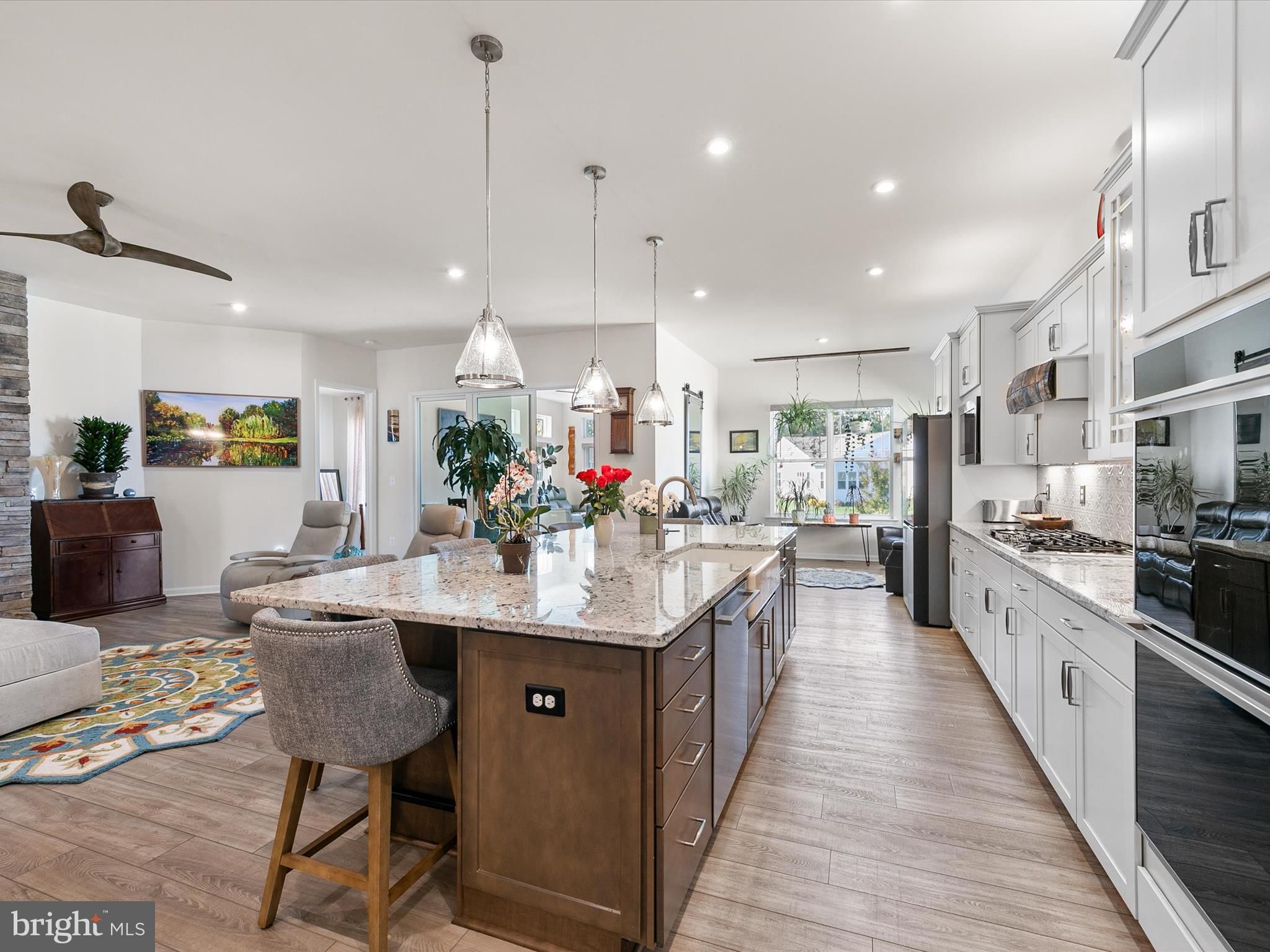 Magnificent 5 Bedroom 3 full Bath home with impressive upgrades in this Active Adult 55+ amenity rich community! This home features an expansive open-concept layout that maximizes both luxurious living and entertaining. With generous square footage, each room flows seamlessly into the next, creating an open and inviting atmosphere between the Kitchen, Dining Room , Living Room, Reading Room and Sunroom. From the moment you step inside, you'll be captivated by the exquisite details and thoughtful upgrades that make this home truly exceptional both inside and out! Chef's kitchen, double ovens, built-in microwave, large pantry with built-ins, a sizeable granite island, granite countertops, lighted glass display cabinet and gas stove. Butler's Pantry and 1st floor laundry room with built-in cabinets and laundry folding area. The split bedroom plan ensures privacy from guests and the Primary ensuite. Spacious Living Room with stone fireplace. The Sunroom is equipped with both heating and cooling for year-round comfort and features time-programmable Hunter Douglass curtains. Step out to the inviting outdoor space with paver patio, grill with piped in gas line and granite prep area as well as upgraded landscaping, all overlooking a beautiful and tranquil pond with fountain. Piped gas line for future home generator has also been added. The finished basement serves as a perfect entertainment area, featuring a spacious Family Room with sink and wet bar, bedroom, bath, flex room, utility room and an abundance of storage. Attached 2 car garage with newly epoxied floor. LPV flooring, recessed lighting, heated bidets, irrigation well and system. This home seamlessly blends luxury and practicality, making it perfect for those who cherish both elegance and comfort. Enjoy the multitude of amenities offered including: pickle ball, bocce, watersports, yoga and more! Don’t miss the chance to make this stunning property your own!