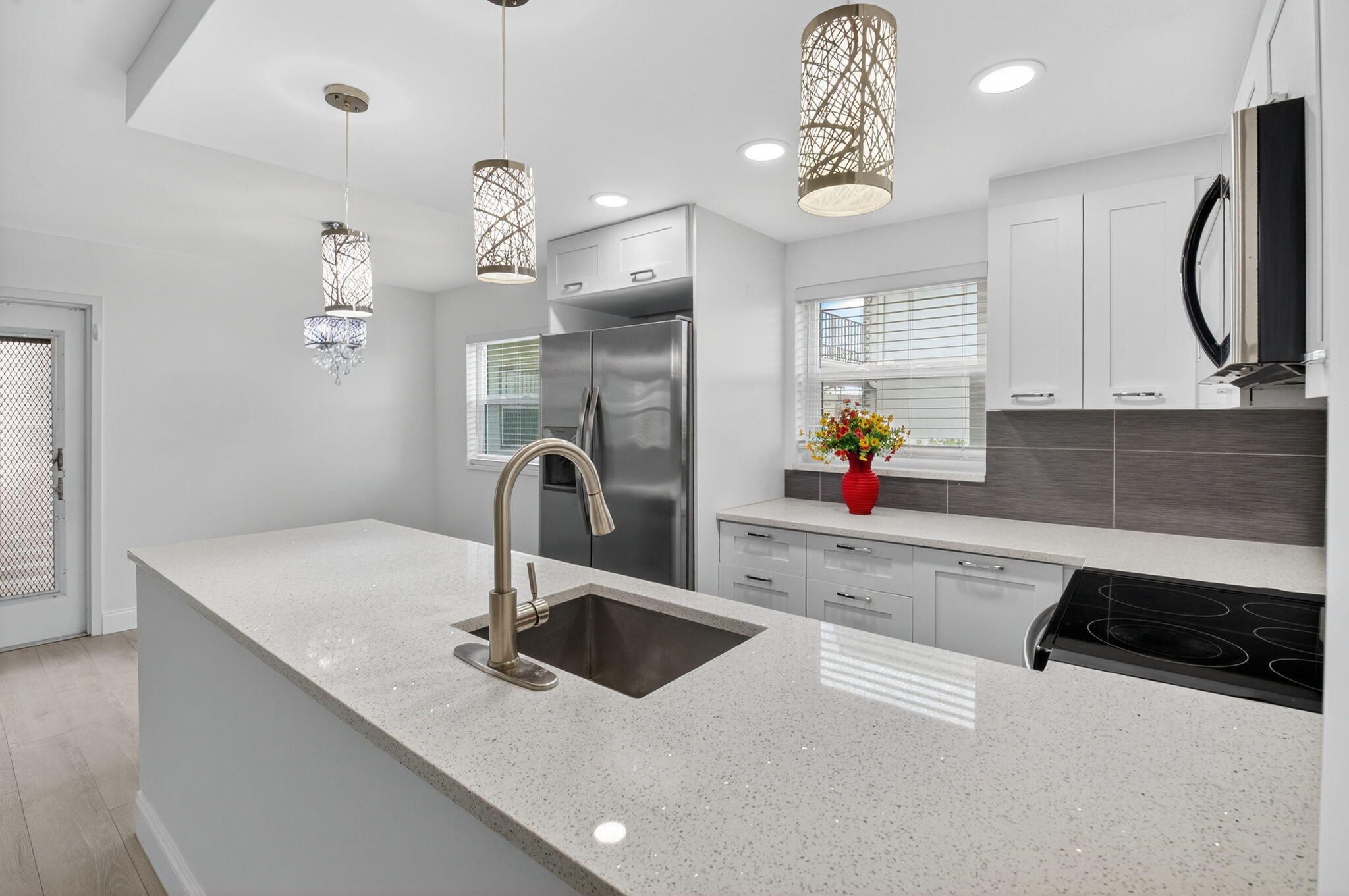 Beautifully remodeled and filled with natural light, this elegant first-floor 2-bedroom, 2-bath condo has been completely updated with no expense spared. Features include brand-new hurricane-impact windows, custom wood shaker kitchen cabinets, quartz countertops, and all-new stainless steel appliances, including a wine refrigerator. Enjoy custom-built closets, laminate flooring throughout, and non-slip tile in the kitchen and baths. Convenient parking right at the back door. Experience a wonderful resort-style lifestyle with golf, tennis, entertainment, social events, educational programs, courtesy shuttles, and more. A must-see gem that perfectly combines comfort, style, and convenience.