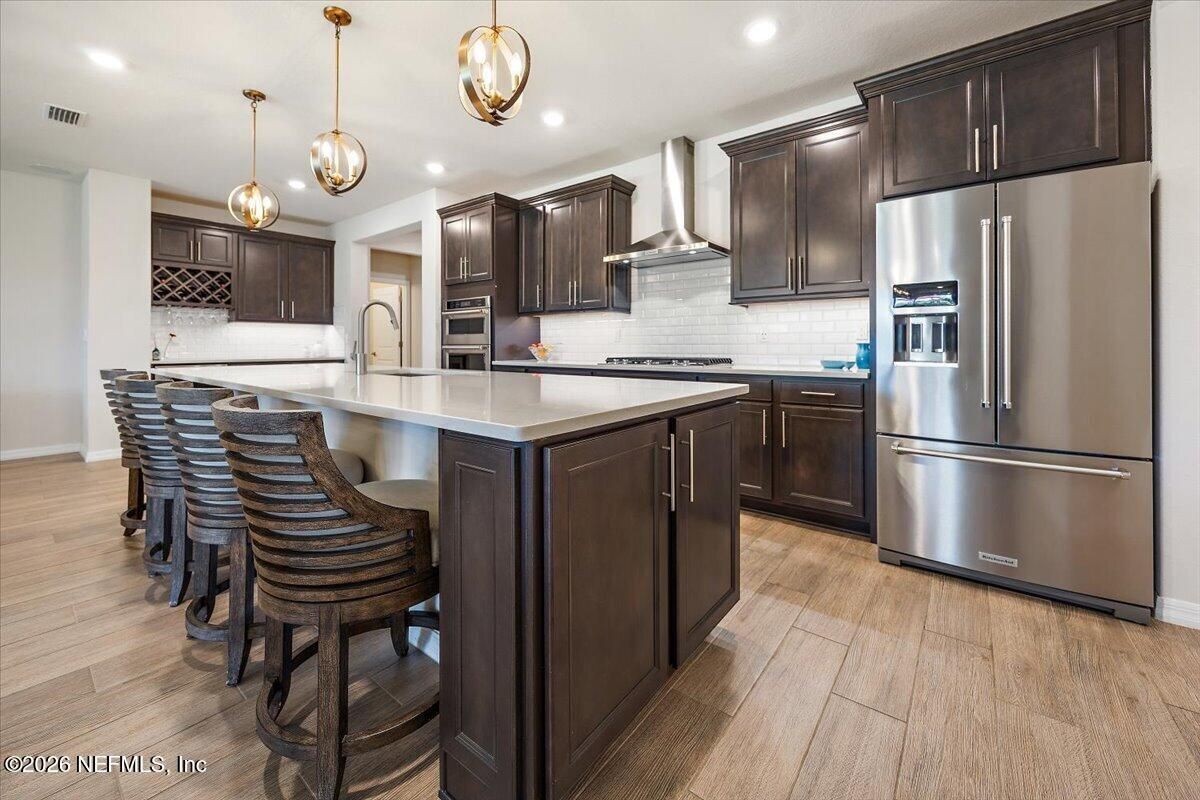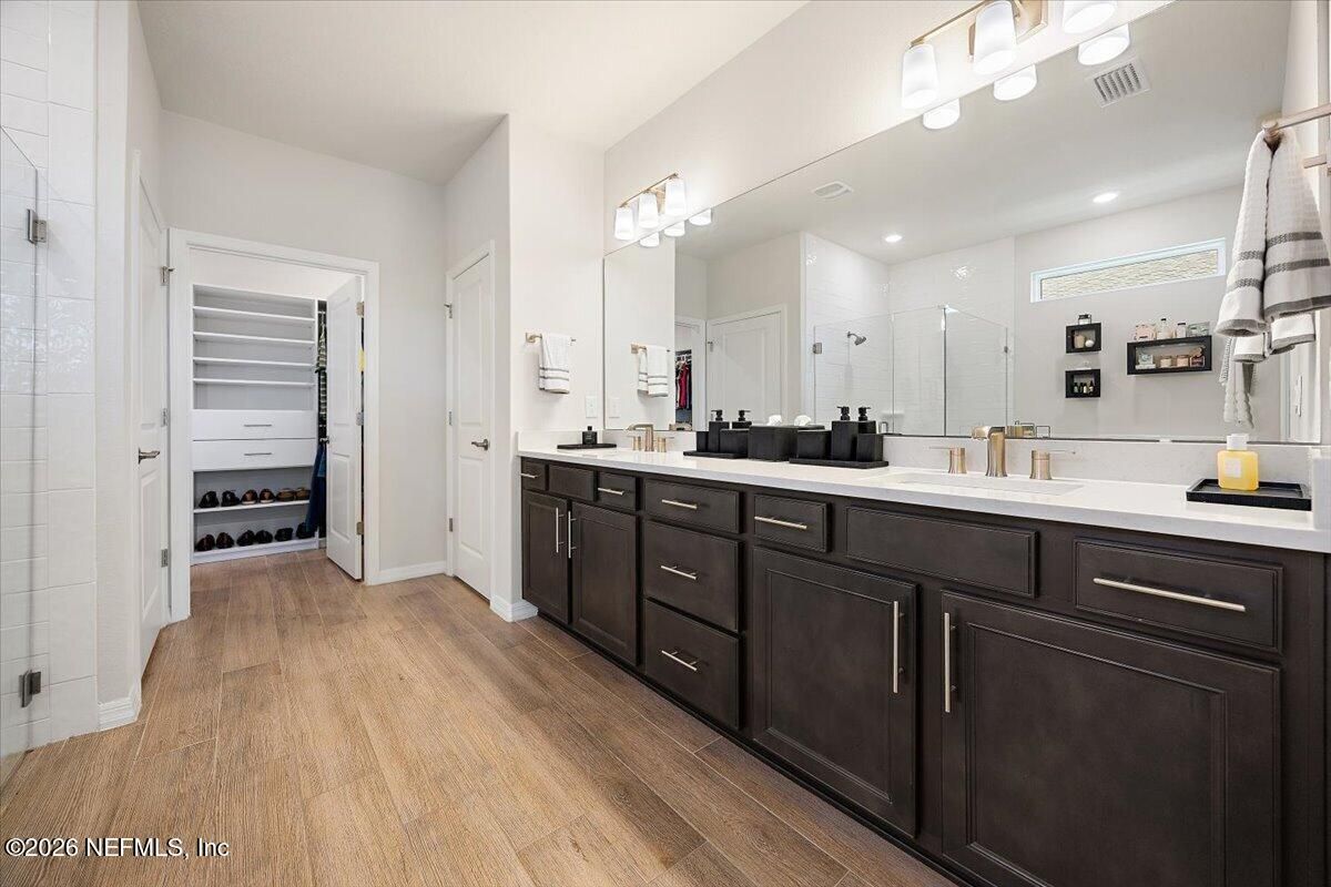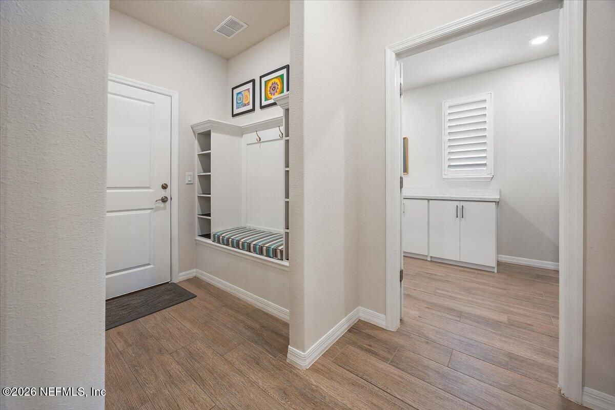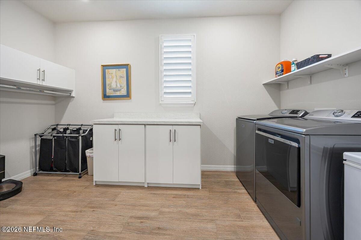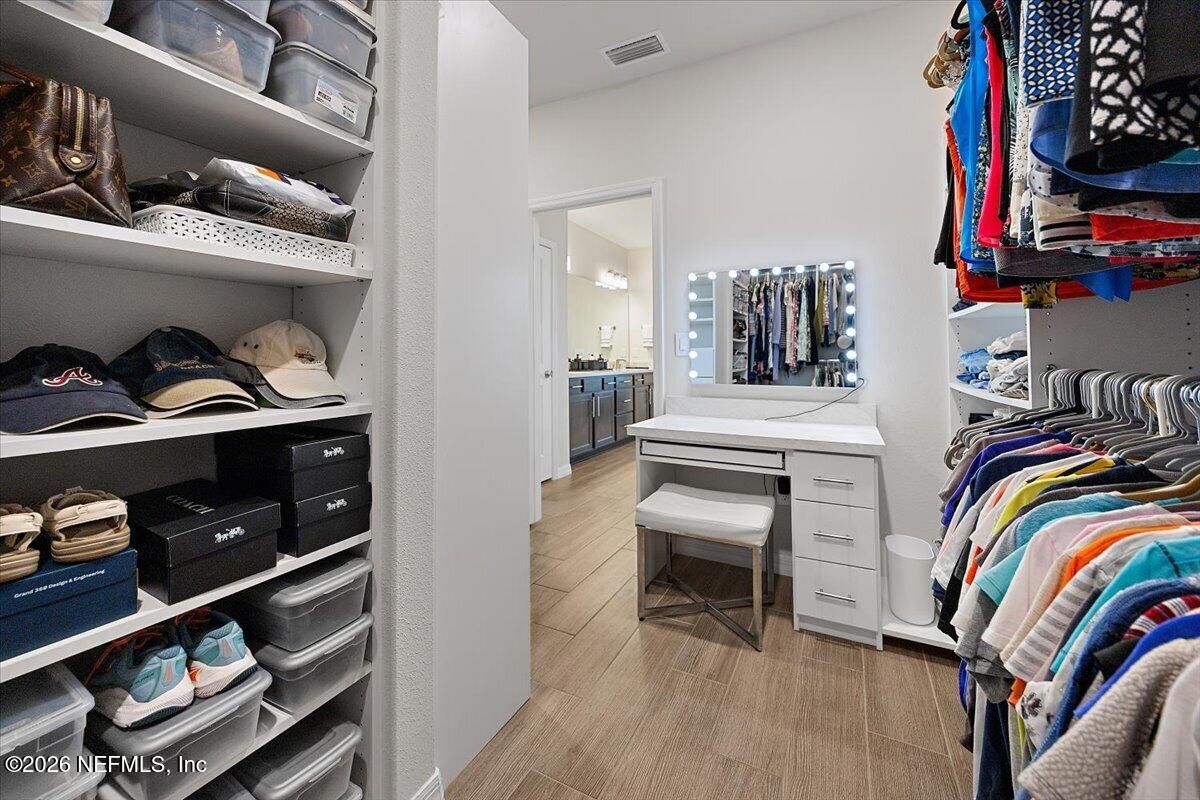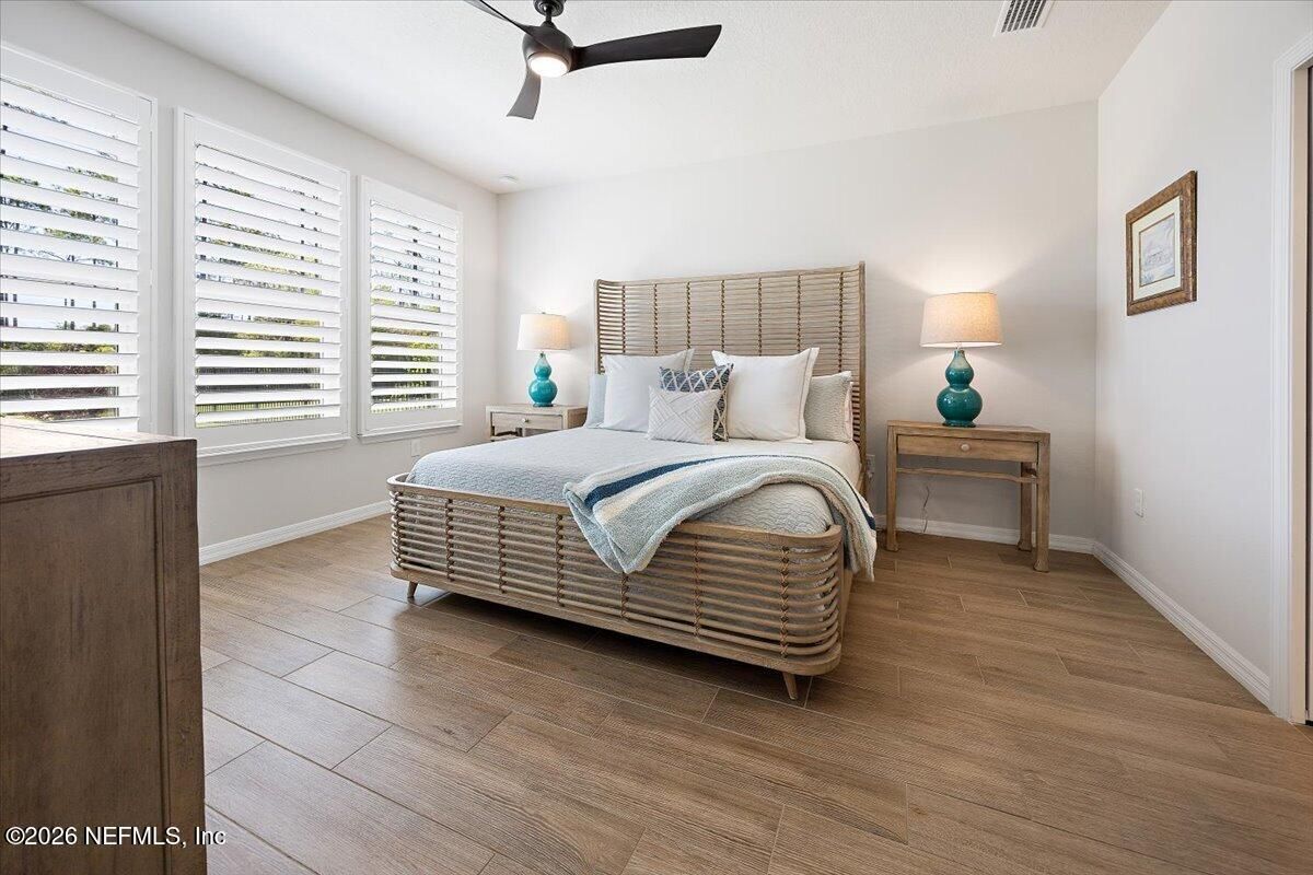Popular Stardom model offering 3 bedrooms, 2.5 baths, and a flex room/office with French doors, perfectly positioned on an oversized, private preserve lot. Designed for effortless Florida living, this home blends indoor and outdoor spaces seamlessly with pocket sliding doors that open wide to the extended screened-in lanai--creating the ultimate setting for entertaining or relaxing year-round. Inside, enjoy tile flooring throughout with no carpet, plantation shutters, surround sound, and a built-in drop zone. The spacious kitchen is ideal for gatherings, featuring KitchenAid appliances, a large layout, and a wet bar with wine cooler. The owner's suite offers a luxurious retreat with a soaking tub, separate shower, and custom built-in closet. Step outside to a beautifully fenced yard with lush landscaping and landscape lighting, enhancing the private preserve view. Additional upgrades include a whole-house dehumidifier, whole-house water softener with filtration, and a Rachio irrigation system. The oversized 3-car garage includes epoxy floors, overhead storage racks, and remote screens, while the laundry room is complete with extensive built-in cabinetry. This home was built to the Environment for Living Gold Standard Certification with a full energy package. Professionally upgraded landscaping and premium designer lighting. The perfect indoor-outdoor home for Florida living--priced to sell. Del Webb Nocatee, the newest 55+ community where luxury living meets unparalleled amenities including: resort pools, spa tub, pickle ball (over 300 members), tennis, bocce, billiards, a full service restaurant and bar, ballroom, fitness center, community garden, kayak launch to the intracoastal etc. If that is not enough, you can enjoy all that the community of Nocatee has to offer just a few miles away on golf cart paths, including waterparks, concerts, food trucks, restaurants and shopping.