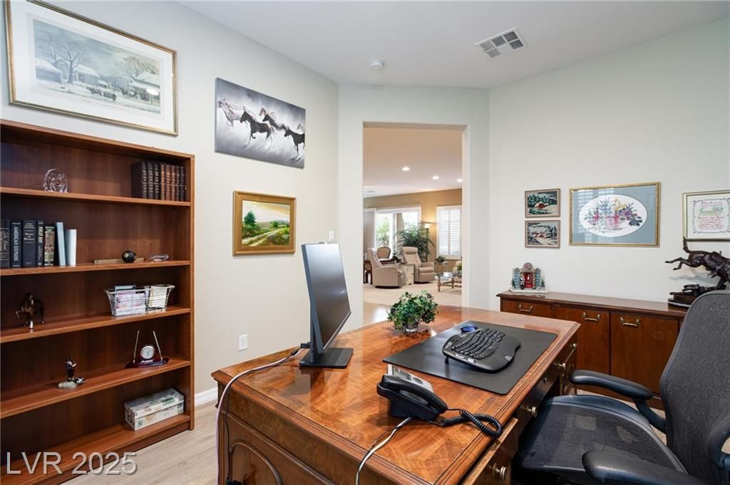 Welcome home! Check out this Sun City Anthem 55+ plus community, one-story beauty! Two bedroom/three bath, with den/office. Located on a corner lot with a covered patio out back to enjoy the Henderson nights! The front of the home features a courtyard to enjoy the sunsets. Only 20 minutes away from the Strip and sports arenas! Minutes from shopping and your local casino! Huge closets, large rooms, and an open floor plan! The kitchen features granite countertops with a composite granite sink and a lovely center island. Beautiful shutters throughout! This will not last long!
