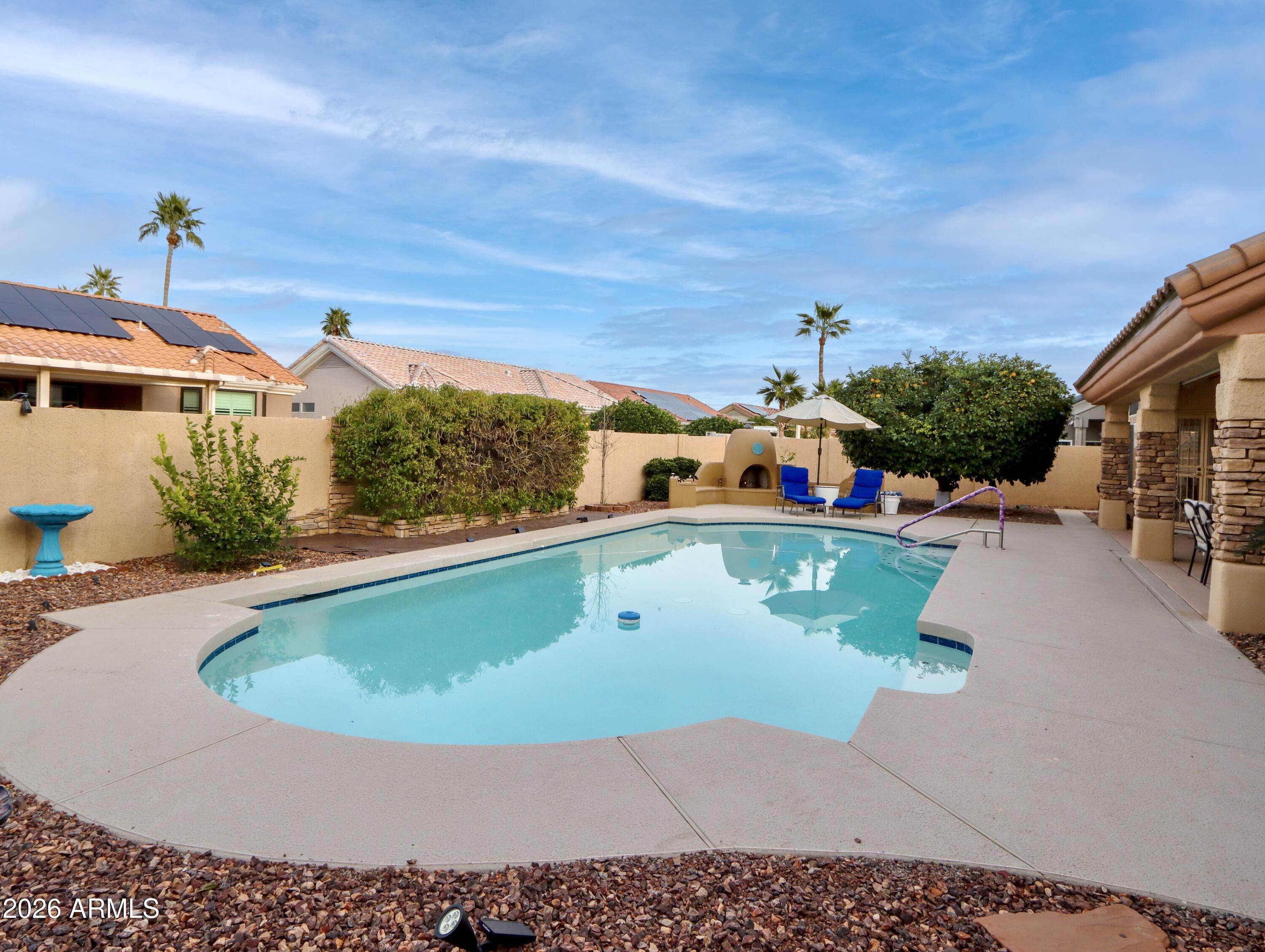 This home is the highly sought-after Scottsdale model, celebrated for its architectural details and featuring both a primary suite and a private guest suite. The primary has a jetted tub, separate shower, and dual sinks. The updated kitchen has granite countertops and a large center island with a breakfast bar, opening to the family room with a dining area and gas fireplace, perfect for entertaining. A den works as an office or can easily be converted into a third bedroom. Additional highlights include a three-stall garage. Outdoor living truly shines with both a private front patio and a resort-style backyard featuring a spacious open area, a covered patio, a gas fireplace, and a serene pool oasis. The pool tile was updated in '21, and both HVAC systems and the roof were replaced in '24.