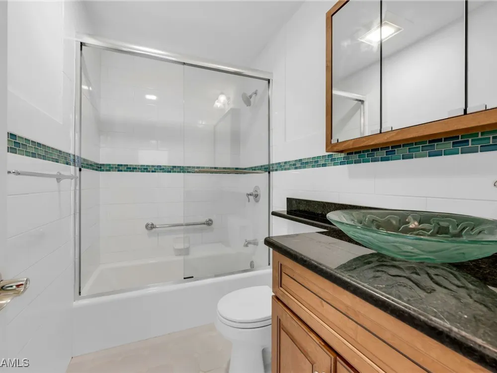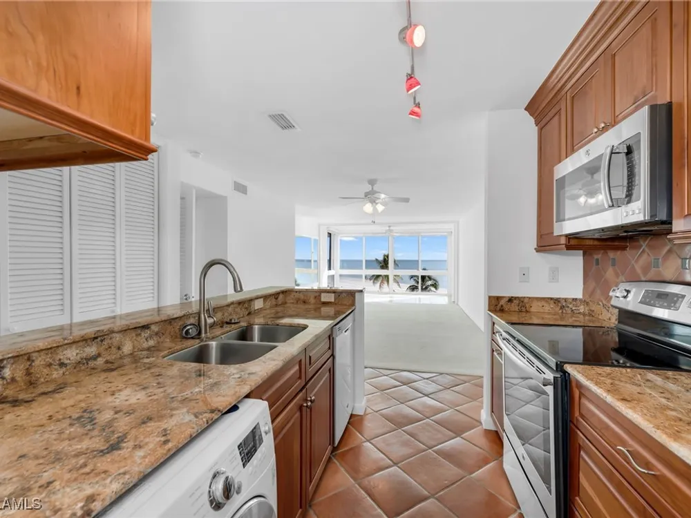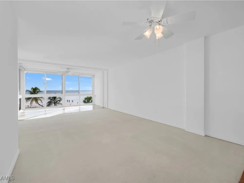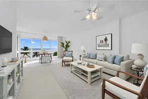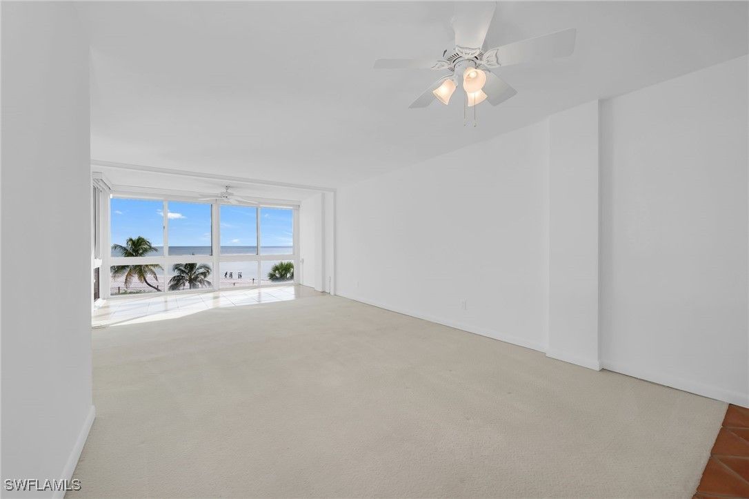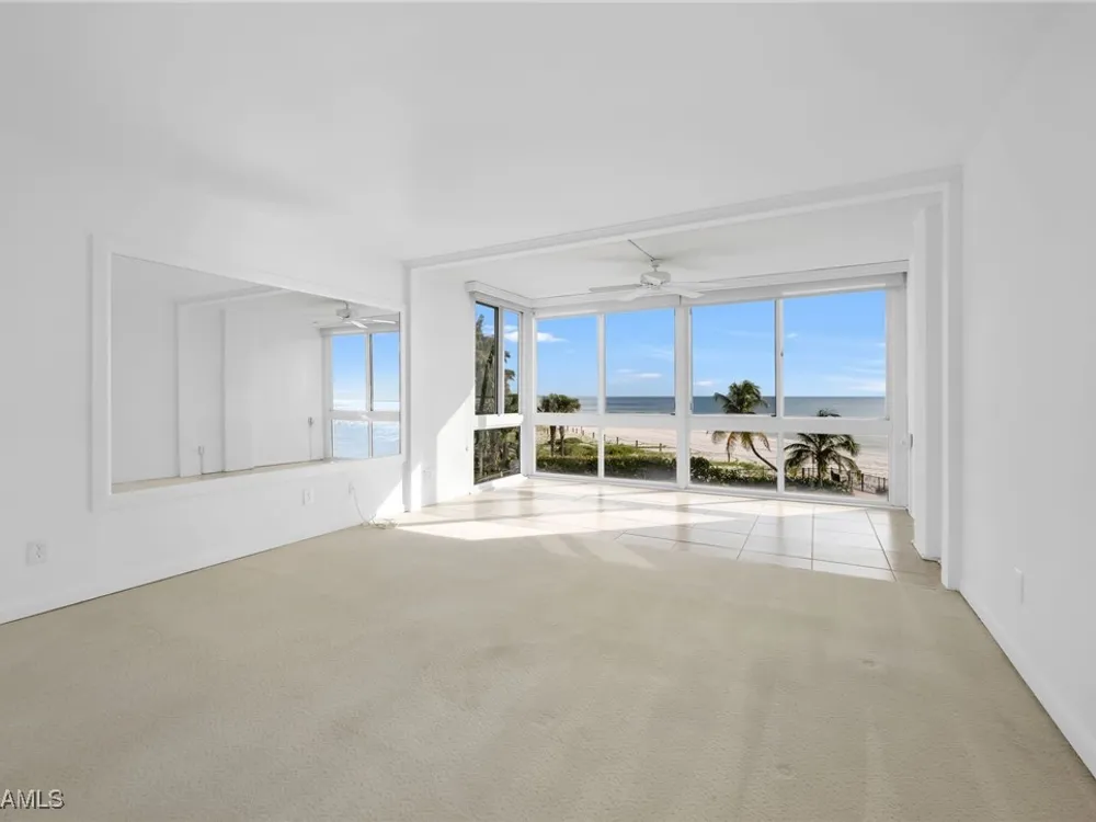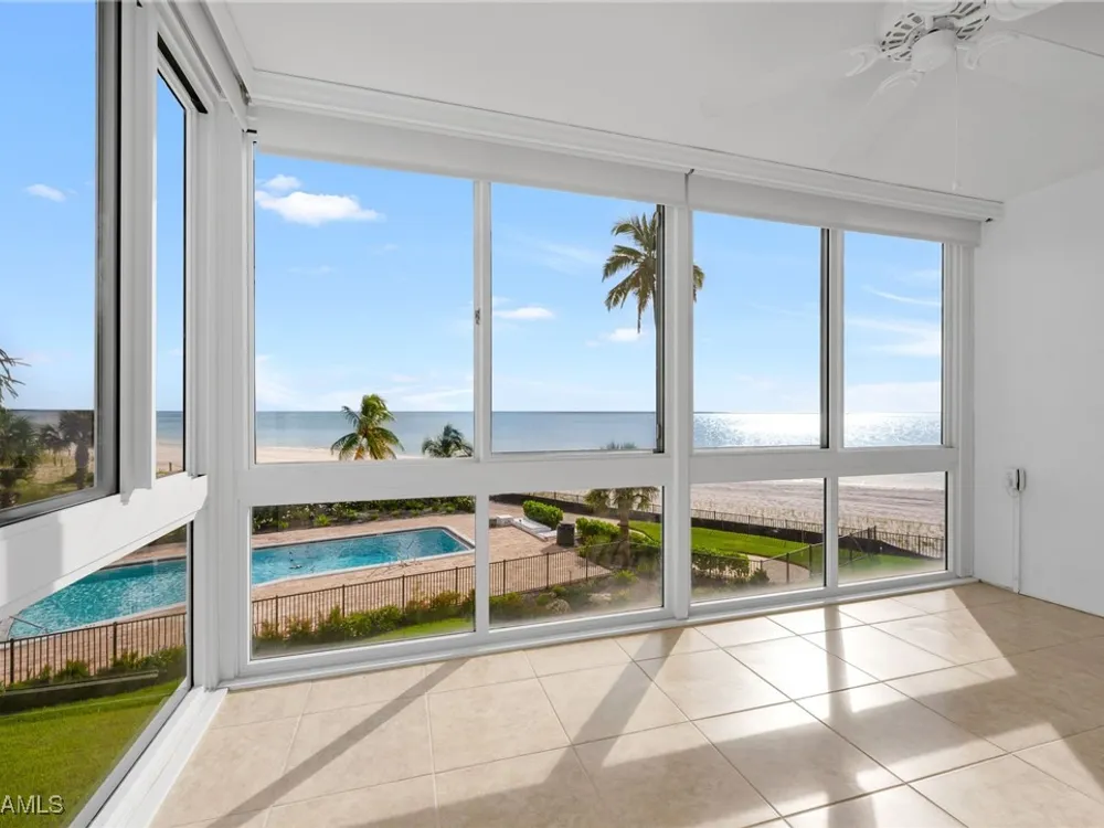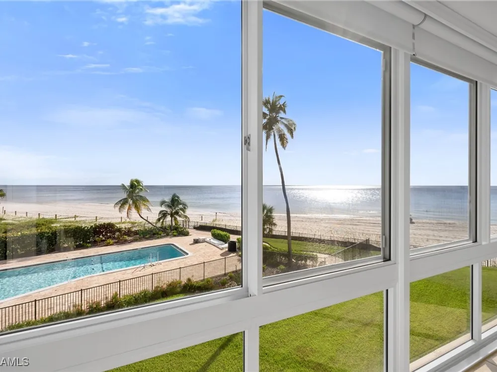 Scenic views of the Gulf define this 2nd-floor residence in Royal Palm Club. This light-filled 2-bedroom, 2-bath home offers 1,143 sq ft of open-concept living where the kitchen has been opened to the living area to maximize sightlines to the Gulf and lanai. Southwesterly exposure delivers panoramic views of the pool, beach, and Gulf with the Naples Pier visible on the horizon. The kitchen features warm brown tones, rich cabinetry with new hardware, complementary countertops and authentic Spanish tile flooring and accents that lend Mediterranean charm and durable function. Both baths have been tastefully updated; the primary bath showcases a spacious walk-in shower with a frameless glass door, decorative tile detail and updated cabinetry. Bedrooms are freshly painted for a move-in-ready presentation. An open lanai with tile extends the living space and provides an ideal spot for morning coffee or sunset viewing. The community pool is conveniently located steps from the Gulf, enhancing the beachfront lifestyle and easy access to sand and surf. Moorings Private Park is located next door, adding exclusive greenspace and easy access to waterfront recreation. Located in a low-density Gulf-front building, this property offers direct beach access, a residential feel and convenient proximity to dining, shopping and recreation.
