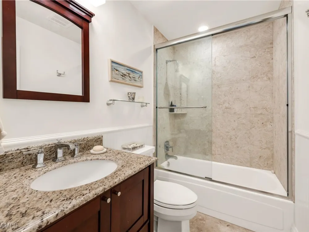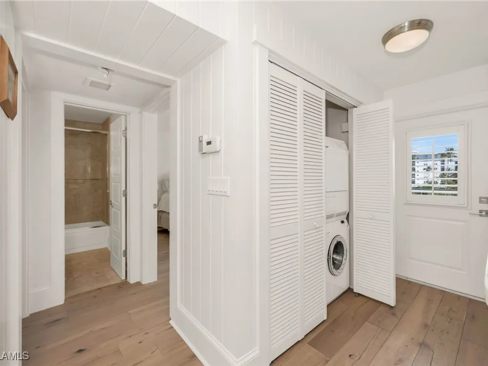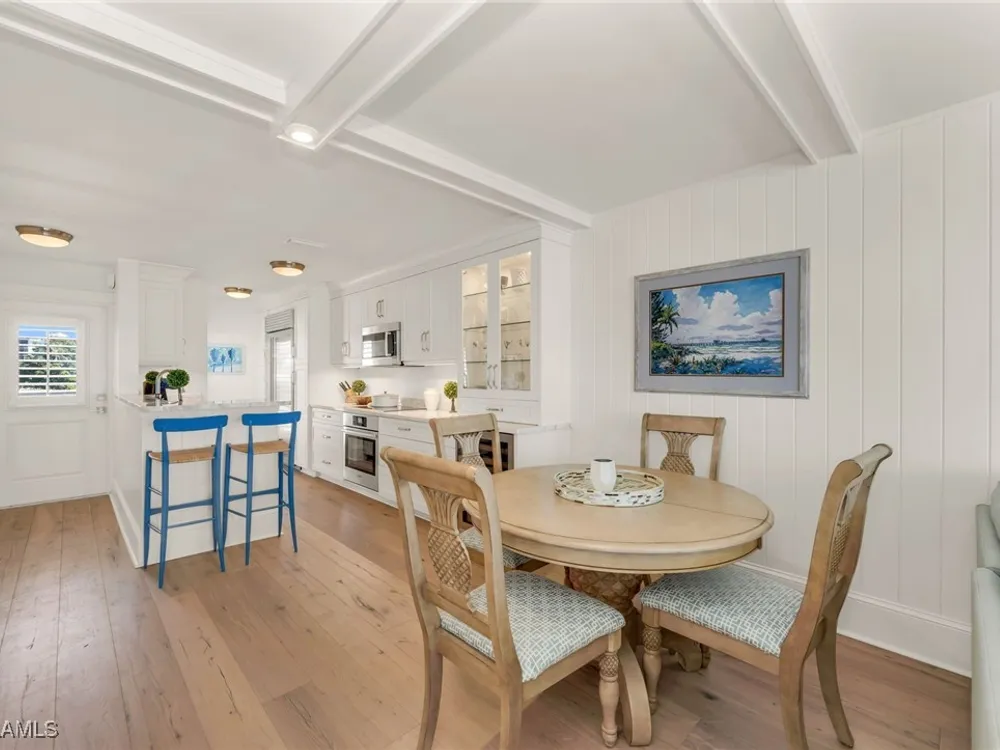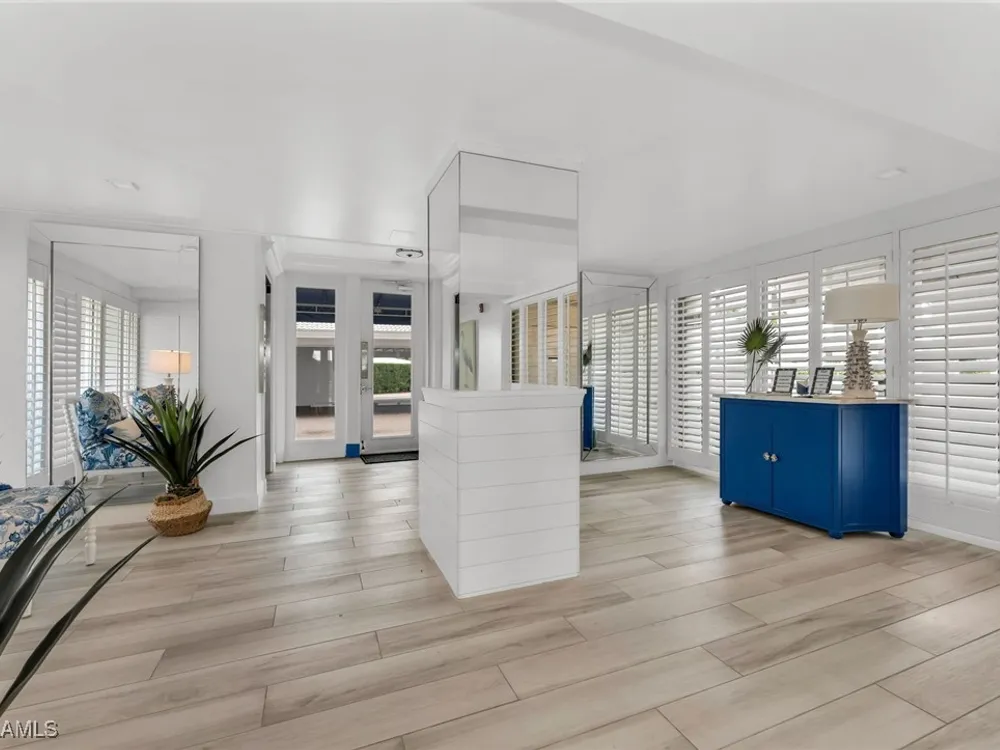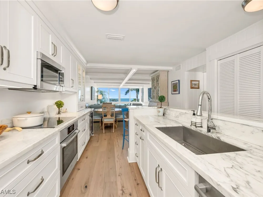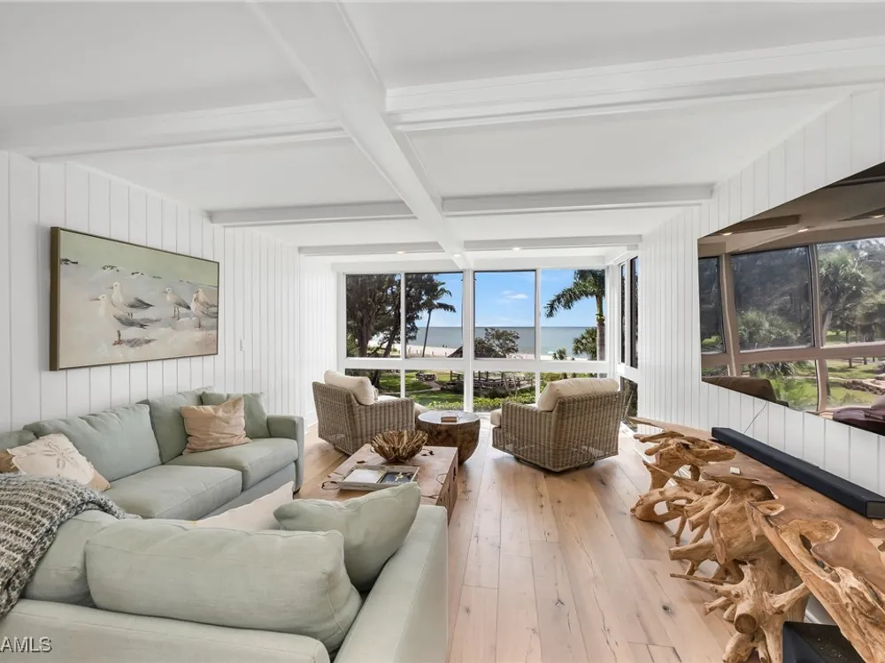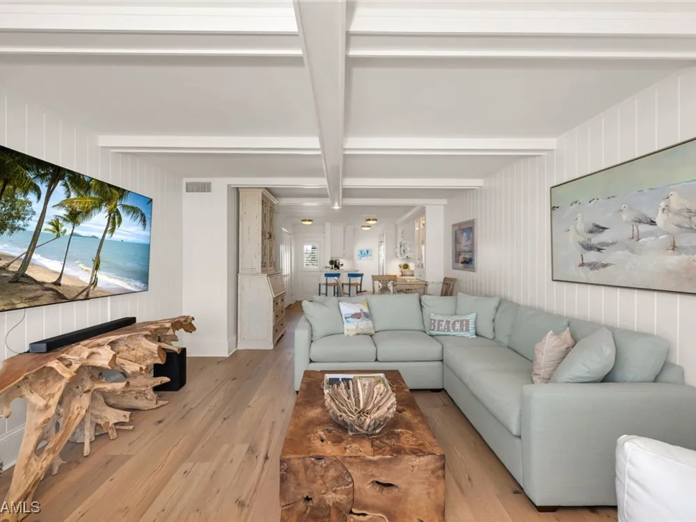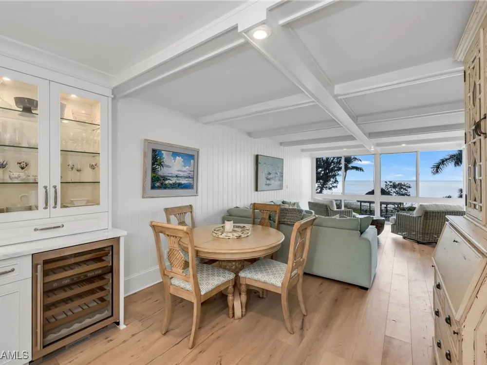 Step into this impeccably renovated 2-bedroom, 2-bath residence in the coveted Royal Palm Club. Spanning 1,143 sq ft, the home has been thoughtfully transformed to blend luxury with coastal ease. A. Vernon Allen Builders led the restoration, installing European white oak wide-plank flooring and custom whitewashed beams that articulate a vaulted ceiling, diffuse natural light, and feature integrated LED uplighting. Shiplap-accented walls and a designer kitchen clad in marble countertops set the stage for Sub-Zero and Bosch appliances, complemented by a wine captain for effortless entertaining. Each bathroom has been reimagined as a private spa retreat, featuring granite-topped vanities, rich wood cabinetry, and stone-tiled showers that resonate with relaxed seaside sophistication. Residents enjoy direct access to private Moorings Beach Park, alongside community amenities including a beachfront pool, bike storage, and a library. Within minutes, discover the boutiques of 3rd St and 5th Ave S, the cafés of Venetian Village, and the dining and retail at Waterside Shops.