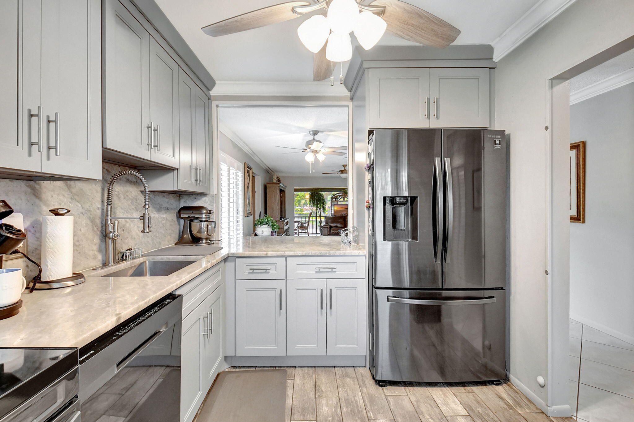 This beautiful 2nd floor corner unit in Fairways Green, Boca Raton, is in a secure 55+ community with 24-hour manned gate access. It features 3 bedrooms and 2 bathrooms in a split floor plan, with impact windows throughout. The open living room, dining room, kitchen and patio offer peaceful lake views. The unit features several recent updates, including new 14-inch attic insulation to keep it cool during Florida's hot summers. It also boasts a brand-new electric box, AC system, and hot water heater. Inside, you'll find crown molding, baseboards, new closet doors, and a wet bar with a wine fridge, top and bottom wine racks, and a bar sink. New fans and light fixtures are installed throughout, and both bathrooms have been completely renovated. The home features tile flooring in the main areas, carpeting in the bedrooms, and charming plantation shutters. The enclosed back patio, complete with glass sliding doors, roll-down shutters, and large shiny tile floors, offers serene views of the tranquil lake and is air-conditioned for added comfort. The remodeled kitchen boasts sleek stainless steel appliances, plentiful cabinets and pantries, new flooring, and a chic 2-seat bar area. The kitchen is beautifully designed with grey cabinets, silver handles, a matching stainless steel sink faucet, and a grey-and-white backsplash that complements the countertops. The master bedroom features 2 walk-in closets1 in the bathroom hallway and another within the master bedroom itselfa linen closet, and a single sink vanity with a powder area. The separate toilet area includes a walk-in shower with elegant floor-to-ceiling wood-look tile and glass shower doors. The 1st guest bedroom, located towards the front of the unit, features an oversized closet and a window overlooking the front of the home. The unit also has an in-unit stackable washer and dryer located in the guest bathroom. The 2nd guest bedroom, situated at the back for added privacy, includes sliding doors that lead to the back patio, offering tranquil lake views. The guest bathroom has been fully updated, featuring a walk-in shower with tiled walls and ceiling, as well as a single vanity. Boca Lago, aptly named "mouth of the lake," is a picturesque community comprised of 8 condo communities, a country club, and a golf course set among 29 lakes. Residents enjoy spacious villas, townhouses, and apartments with views of either the lakes or the golf course. Conveniently located near shopping, dining, parks, highways, and Boca Raton's stunning beaches and downtown entertainment, The Fairways of Boca Lago offers a friendly and relaxed lifestyle. This vibrant 55+ community of 298 units features 2 delightful pools with Wi-Fi, a clubhouse for meetings and gatherings, and a Social Club that hosts various entertaining activities and events. The dedicated Board of Directors, on-site management, and maintenance staff ensure that your experience in this community is both relaxing and enjoyable.