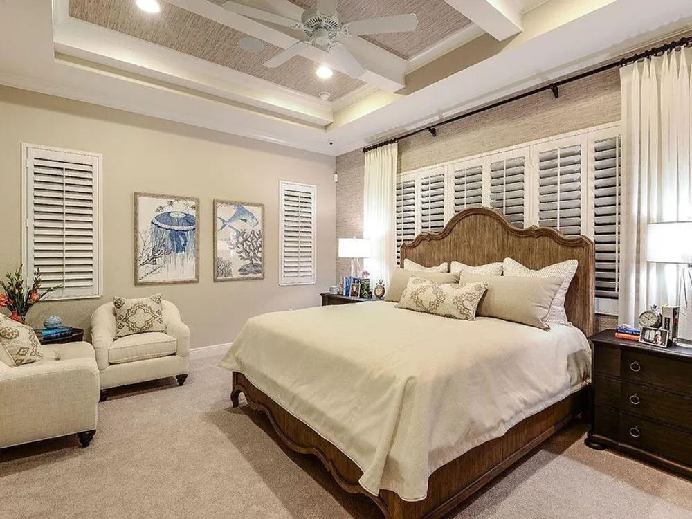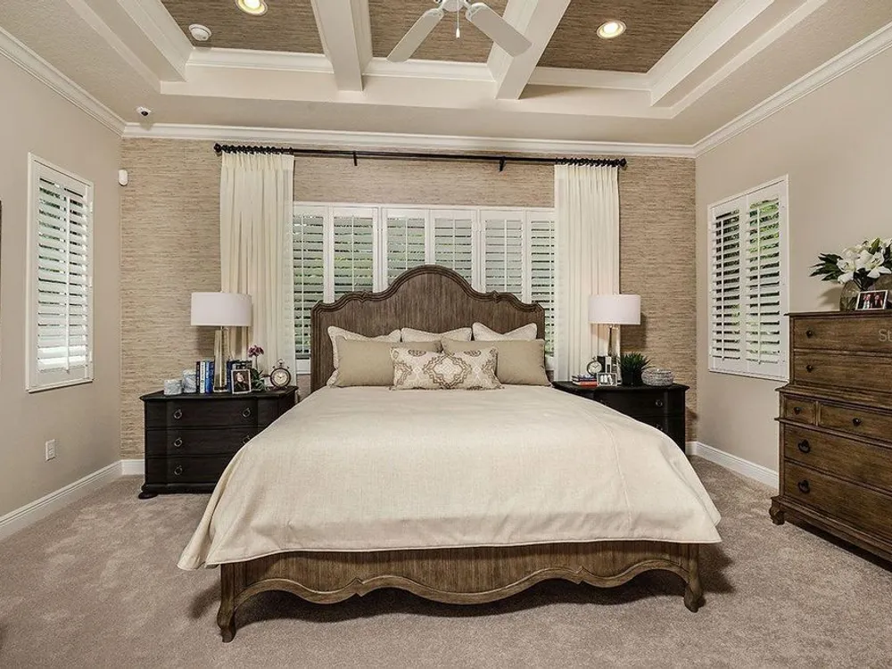 - Ceiling Fan(s), Coffered Ceiling(s), Open Floorplan, Main Level Primary, Thermostat, Walk-In Closet(s), Window Treatments