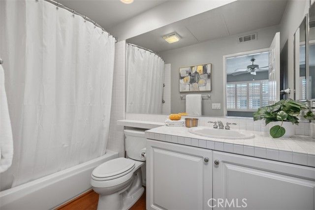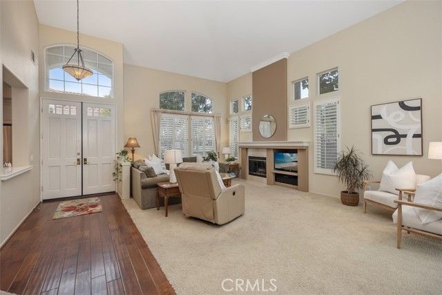 Welcome to this highly desirable home nestled within the sought-after, guard-gated 55+ community of Palmia. This well-maintained residence offers two generously sized bedrooms, each with its own ensuite bathroom, along with flexible options for a potential third bedroom. The downstairs den with double-door entry, currently used as a dining room, can easily be converted into a third bedroom. Additionally, the downstairs powder room offers space to add a shower, creating a full bathroom. A second option for a third bedroom is the upstairs loft, providing versatility to suit your needs. The spacious primary suite features direct access to the backyard patio and a well-appointed ensuite bathroom with dual-sink vanity, walk-in shower, private water closet, and walk-in closet. Filled with natural light, the interior showcases soaring vaulted ceilings, a neutral color palette, plantation shutters, and an expansive great room anchored by a cozy fireplace. Designed for effortless entertaining, the open-concept kitchen features a microwave, dishwasher, new double ovens, pantry, broom closet, and a convenient interior laundry closet. The kitchen flows seamlessly into the family room, creating the highly sought-after great-room concept. The fully enclosed backyard offers a wraparound patio and lush greenery, perfect for relaxing or entertaining outdoors. Additional highlights include an attached two car garage with ample storage and updated PEX plumbing throughout the home. Residents of Palmia enjoy an exceptional array of amenities, including a clubhouse, recreation room, organized activities, swimming pool, jacuzzi, fitness center, 18-hole putting green, pickleball and tennis courts, bocce ball, shuffleboard, and library. The home also includes Lake Mission Viejo membership, offering boating, swimming, fishing, concerts, events, and more. Welcome home.
