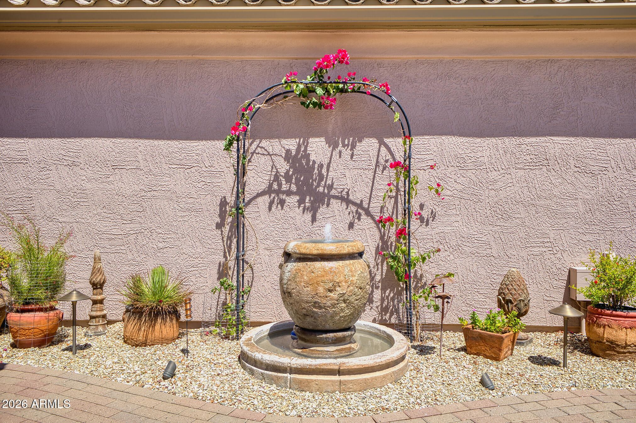 Beautifully appointed 3 Bedroom Borgata situated on a corner lot! Impressive quality is evident upon arrival as coach lights & paver trimmed driveway enhance the curb appeal. The courtyard pavers,serene water feature & potted accents set the tone for what's to come.The home offers an upscale feel with tile flooring enhanced by wide baseboards,crown molding & window shutters.The kitchen showcases cherry cabinetry w/pull-outs,granite countertops backsplash,stainless,appliances,R/O,pantry, & charming bayed nook with built in cabinetry.Completely updated bathrooms. Engineered wood bedroom floors.New Anderson windows throughout & at sliding patio door.Enjoy a resort-style backyard oasis,thoughtfully landscaped for private enjoyment.HVAC 2020. PVC irrigation & Ext Garage complete this home! Additional Highlights Include: -Built in 2005; One owner, full time since 2007 -Room extensions: master bedroom, guest bedroom, kitchen, patio roof -PVC watering lines and controller replaced -Soft water system -Exterior painted 3 years ago -Front paver patio, pony walls, rear patio cool coating/pavers, and pony walls -Gas hookup for future BBQ and/or fire pit -Roof-top solar, owned- Assumable 1% loan -Front security door -Ceiling fans -Custom outfitted laundry room with sink, washer/dryer included -Great room fireplace and media wall -Door to extended patio from primary bedroom -2 sinks in primary bathroom -Custom lighting and fixtures in both bathrooms -Hardware on cabinetry throughout the home -Raised panel doors with upgraded hardware -Designer tiled walk-in showers in master bath and guest bath -Granite countertops throughout -Additional storage in kitchen, laundry room, master bedroom closet, and garage -New refrigerator, microwave, oven, stovetop in 2025 -Powered roll-down sunshades around back patio