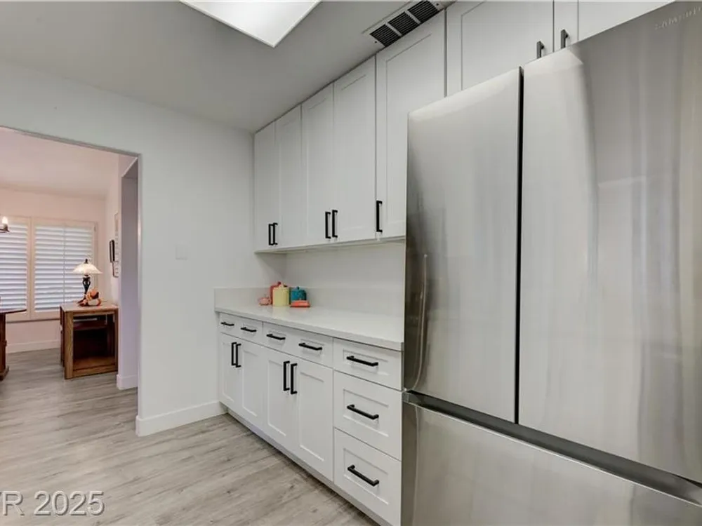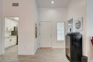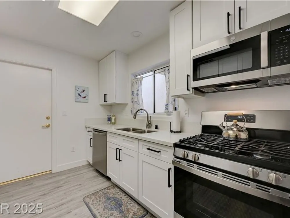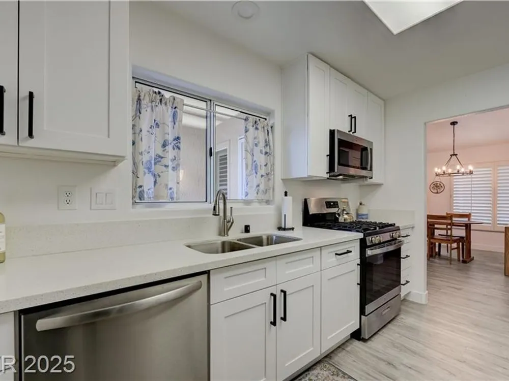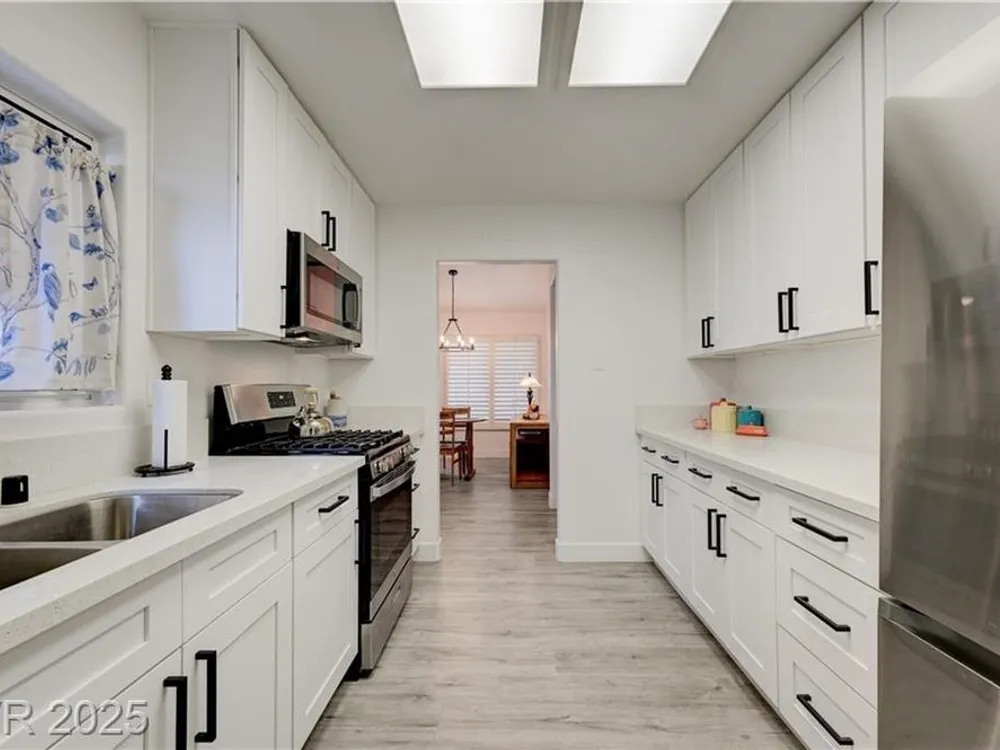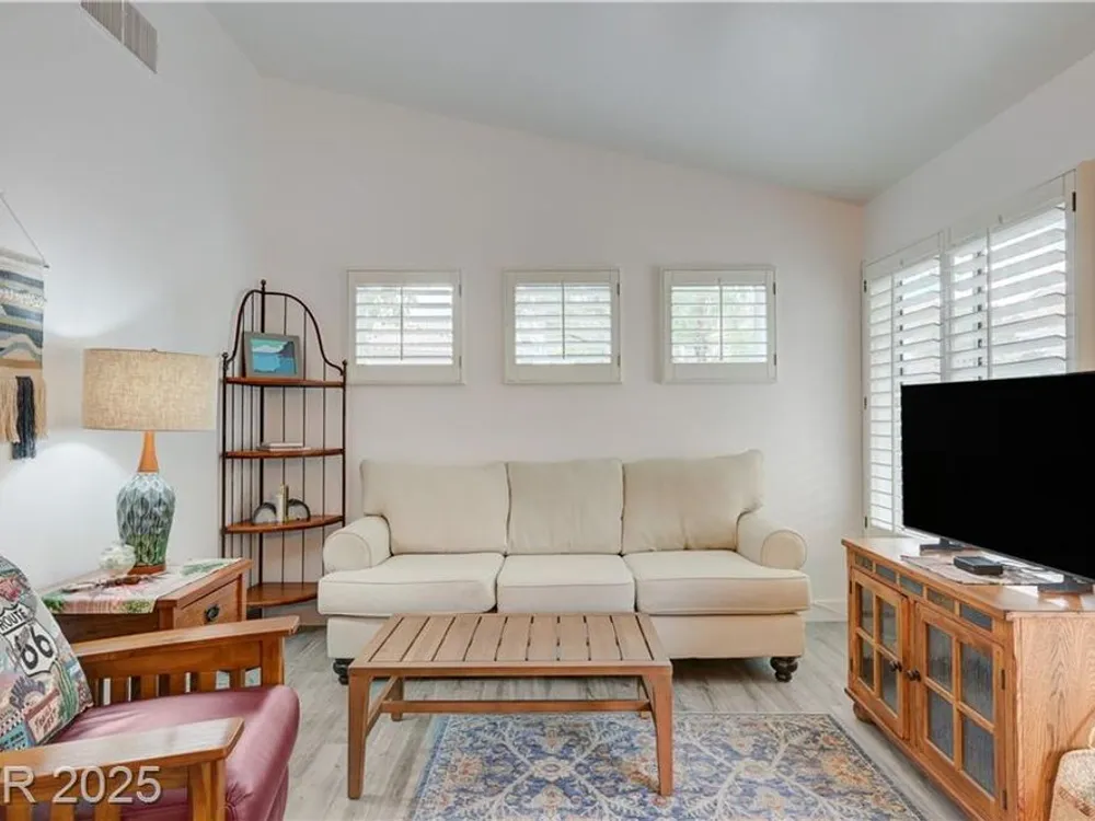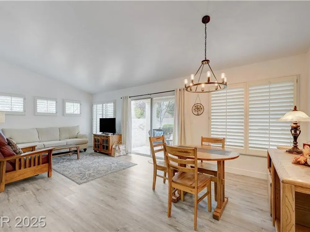 Renovated 2BD/2BA townhome w/2-car garage in Sun City Summerlin! Corner lot home features vaulted ceilings, plantation shutters, and tons of natural light. Modern kitchen w/new stainless appliances, quartz countertops & luxury vinyl flooring. Spacious bedrooms w/custom-tiled showers. New garage door, high-end washer/dryer, brass door handles, wrought iron entry & advanced security system w/cameras and doorbell. Covered patio for relaxing outdoors. Enjoy all the amenities—golf, clubhouses & fitness centers—in this premier 55+ community!